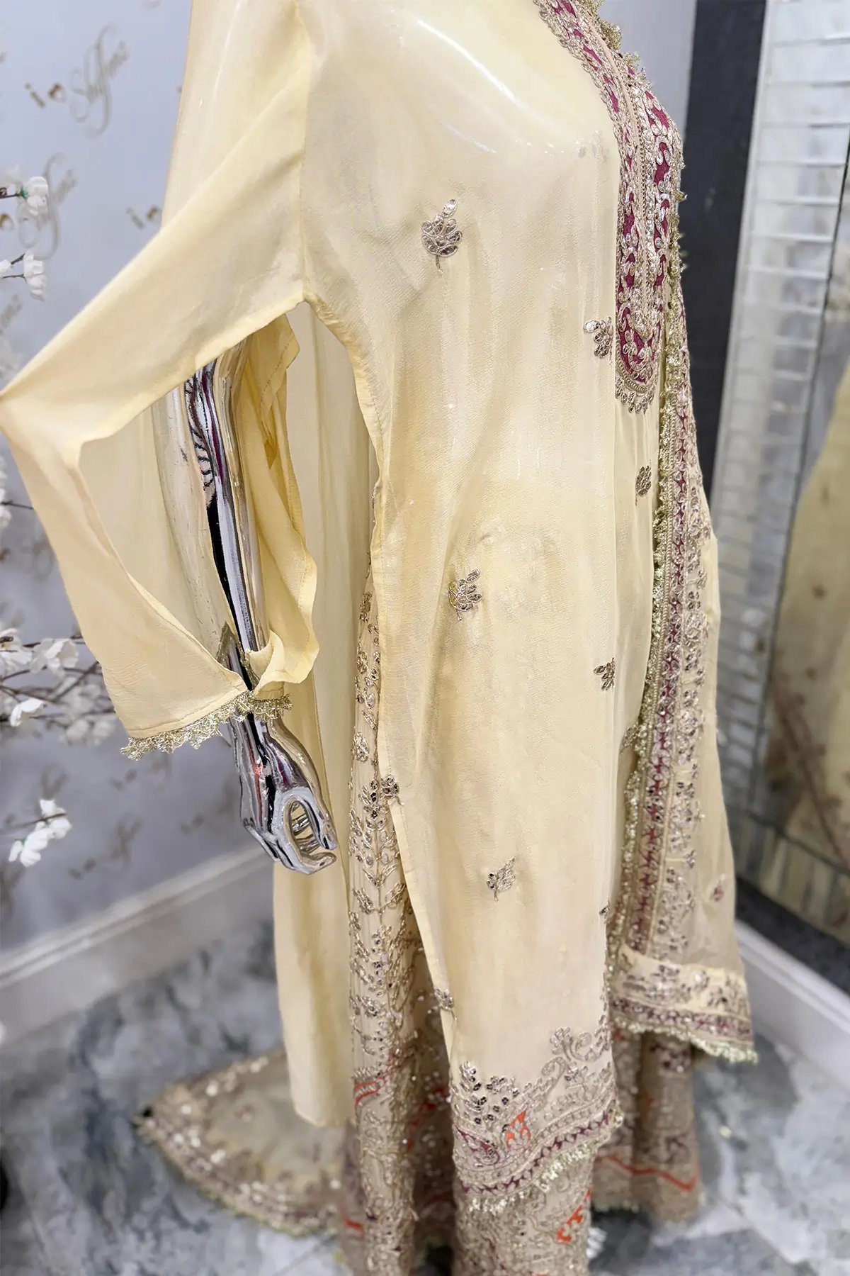This beautiful 3 piece suit features a straight chiffon semi stitched shirt with luxury thread and gotta patti  embroidery throughout, finished with full length embroidered sleeves. Paired with a luxury embroidered sharara. The look is finished with a chiffon embroidered dupatta. Note: This is a semi stitched design; sides need to be stitched according to your size preference.