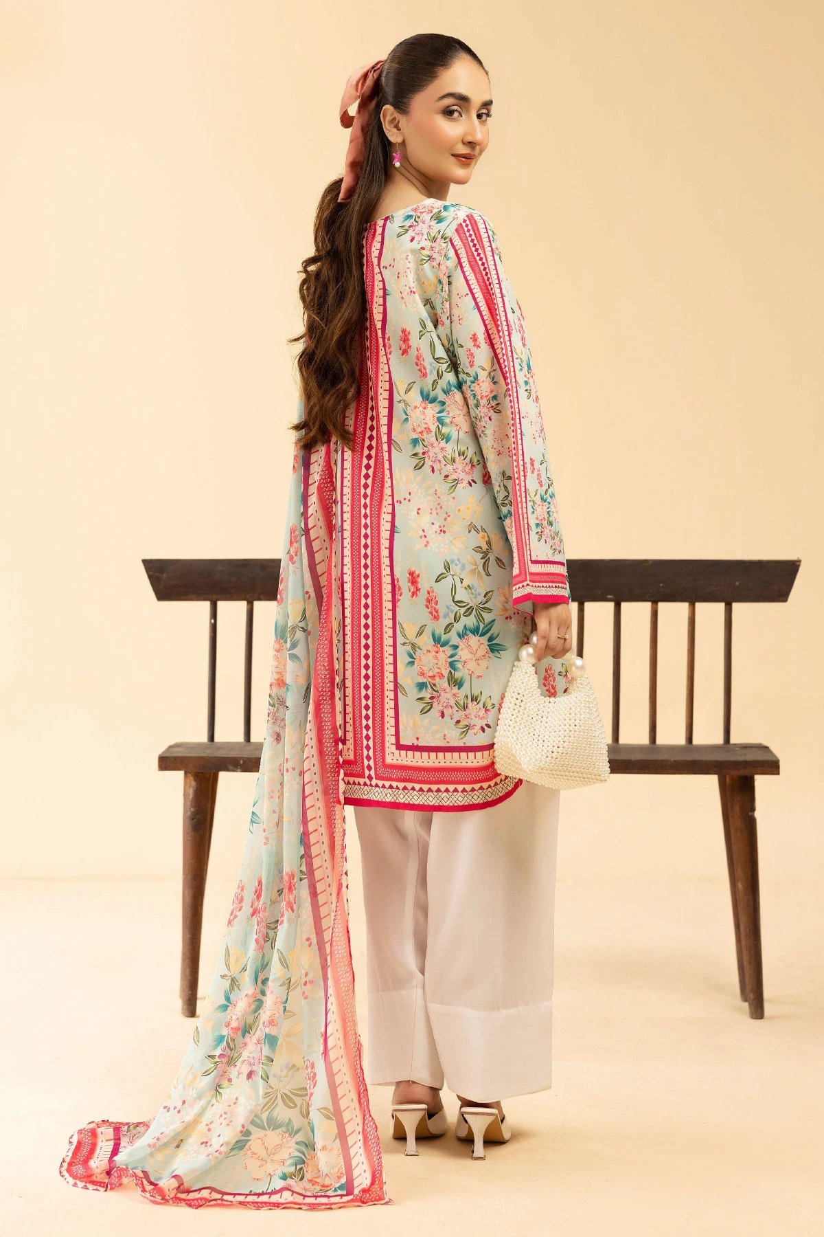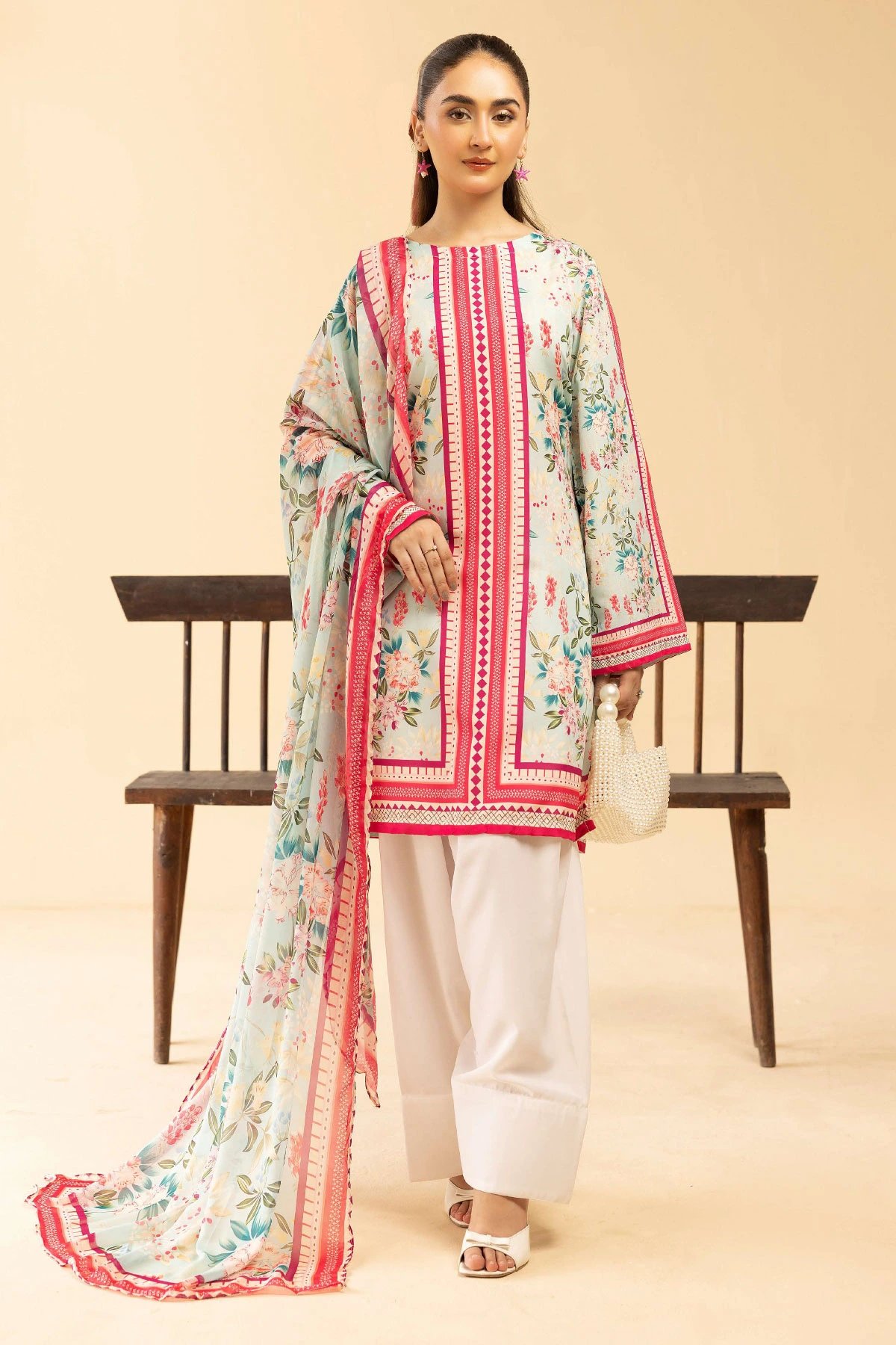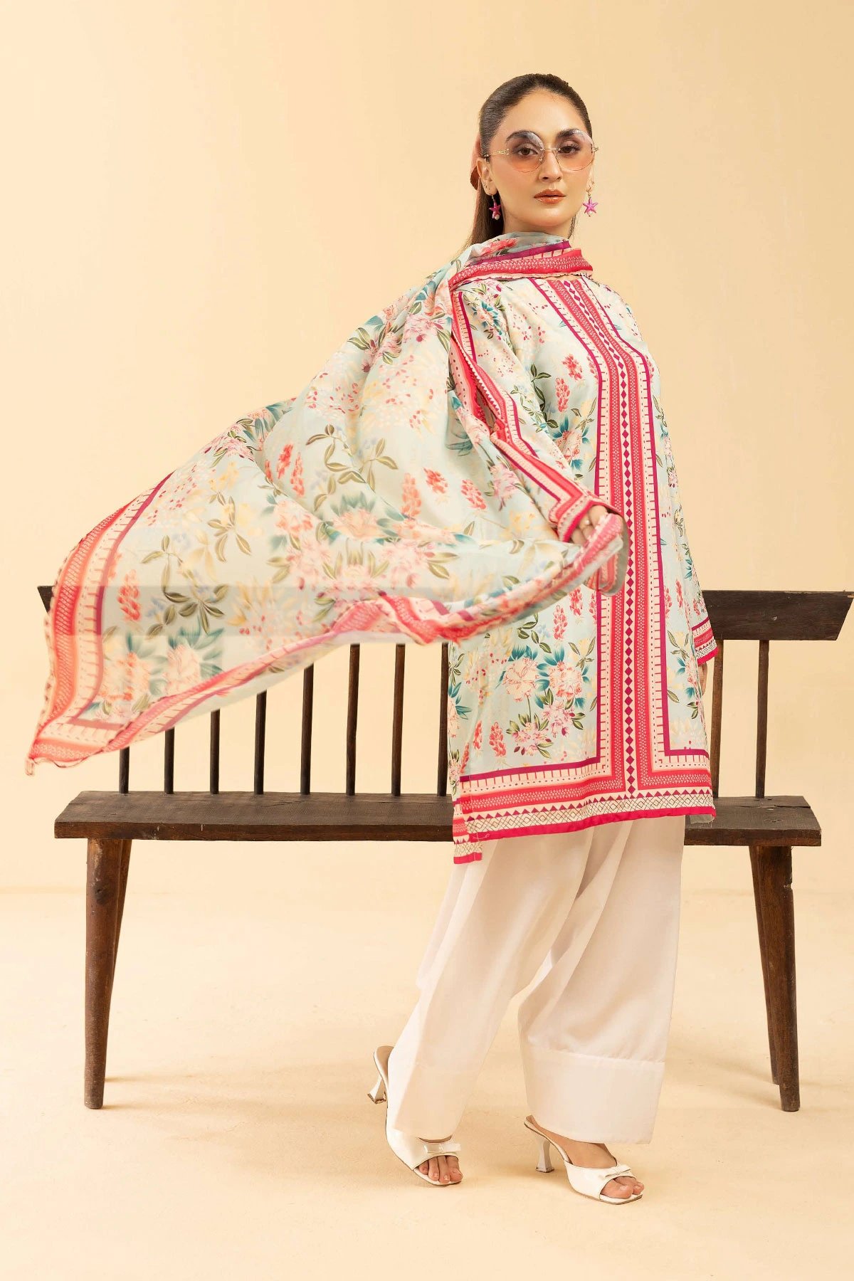 This beautiful Sania Maskatiya 4 piece lawn suit with plazo and farshi shalwar is a short straight fully digital printed shirt with full length sleeves. Paired with a farshi shalwar and plazo trousers. The look is finished with a plain chiffon printed dupatta. Note: (The farshi salwar is see through which is why we have also added a spare palazzo trousers you can style this with instead).