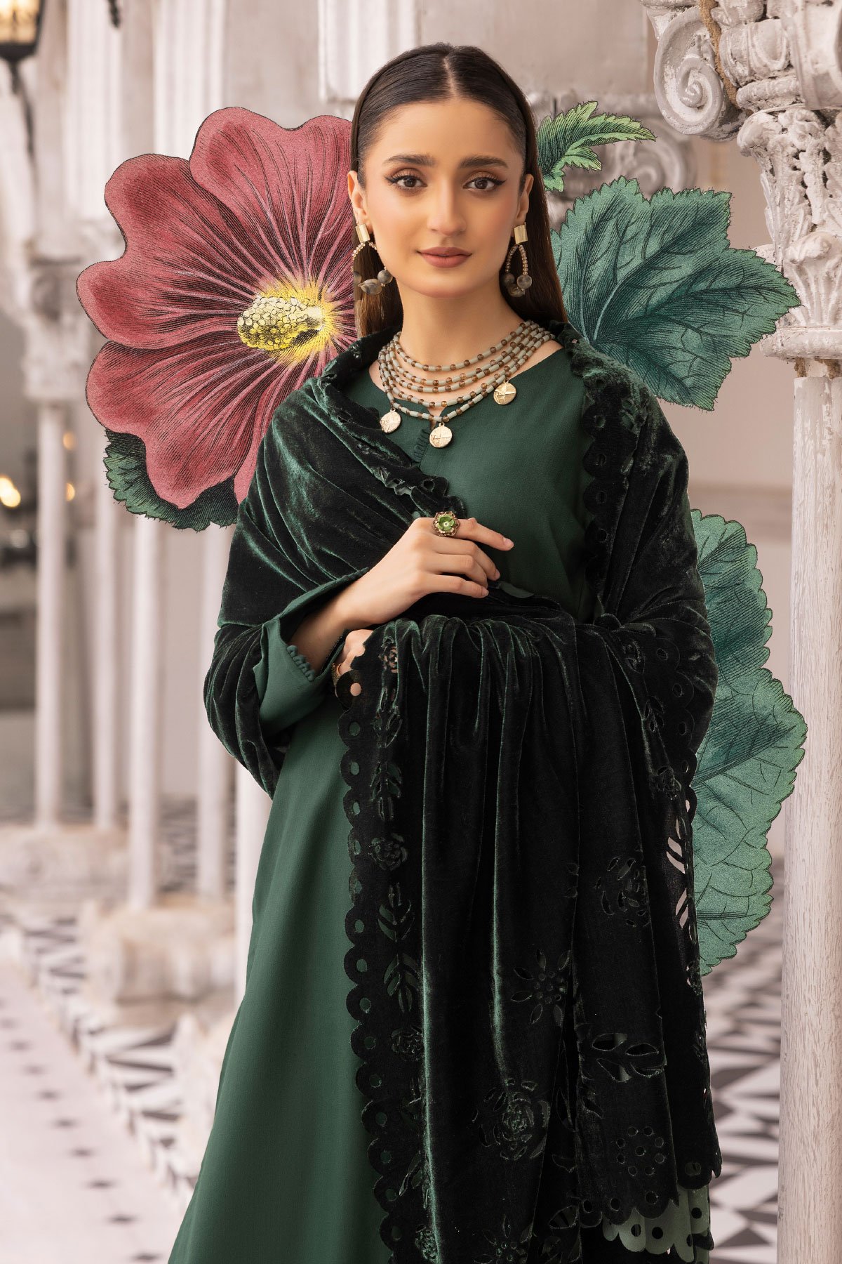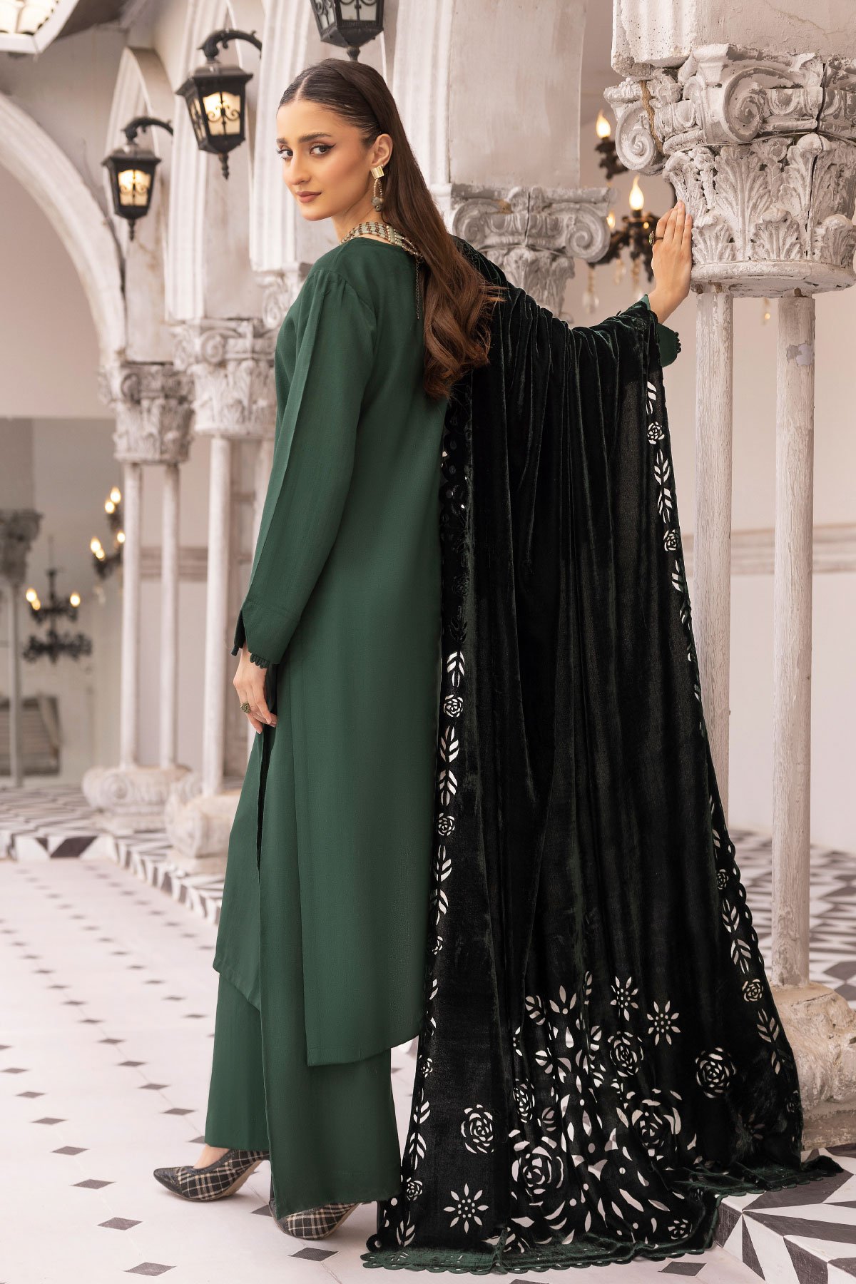 This beautiful Dhanak sapna collection features a straight shirt with piping and button embellishments along the front, finished with full length sleeves. Paired with straight leg trousers and the look is finished with a velvet laser cut shawl. Note: The laser cut patterns on the shawl may vary.