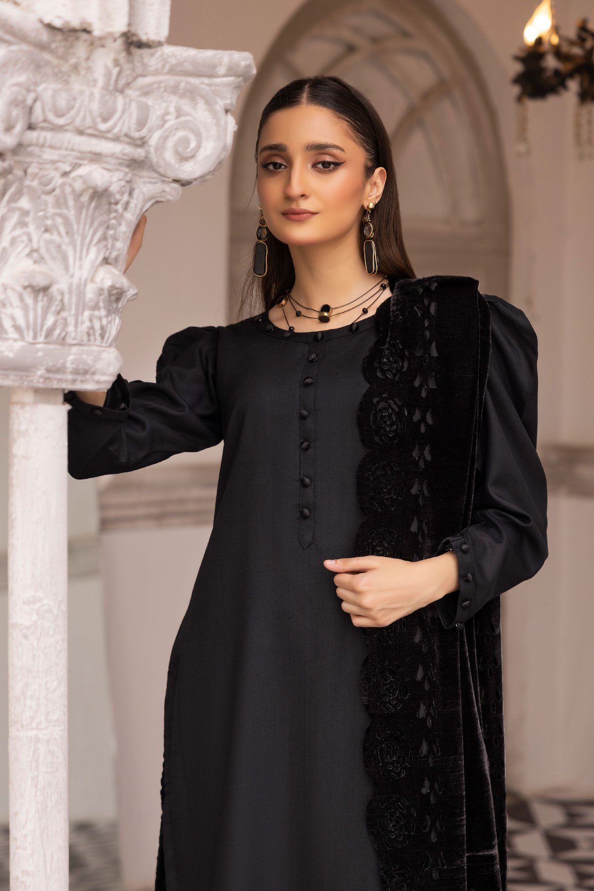 This beautiful Dhanak sapna collection features a straight shirt with button embellishments along the front, finished with full length sleeves with puffed shoulders. Paired with a shalwar and the look is finished with a velvet laser cut shawl. Note: The laser cut patterns on the shawl may vary.