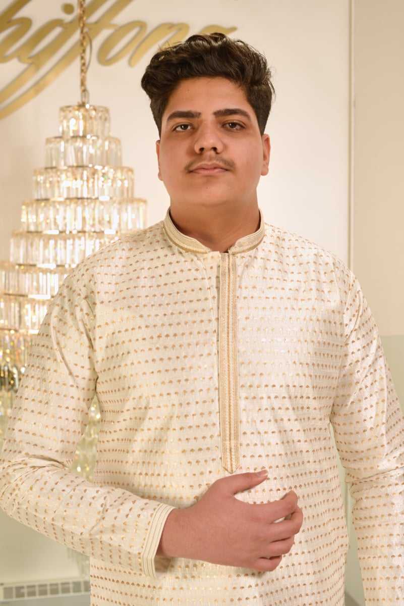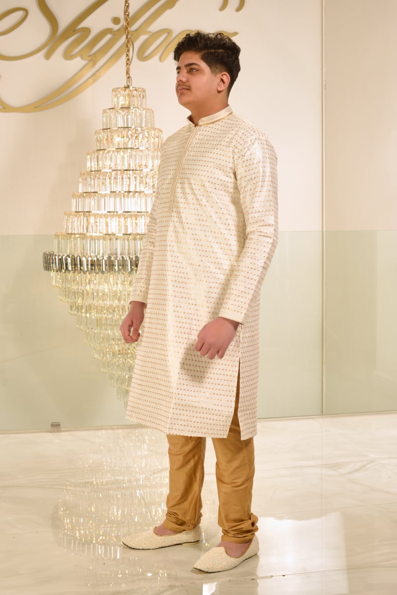 This beautiful 2 piece men’s suit features a kurta with gold sequence embellishments on the front along with an embroidered mandarin collar and comes with full length embroidered sleeves. The look is finished with a contrasted dupion silk churidaar.