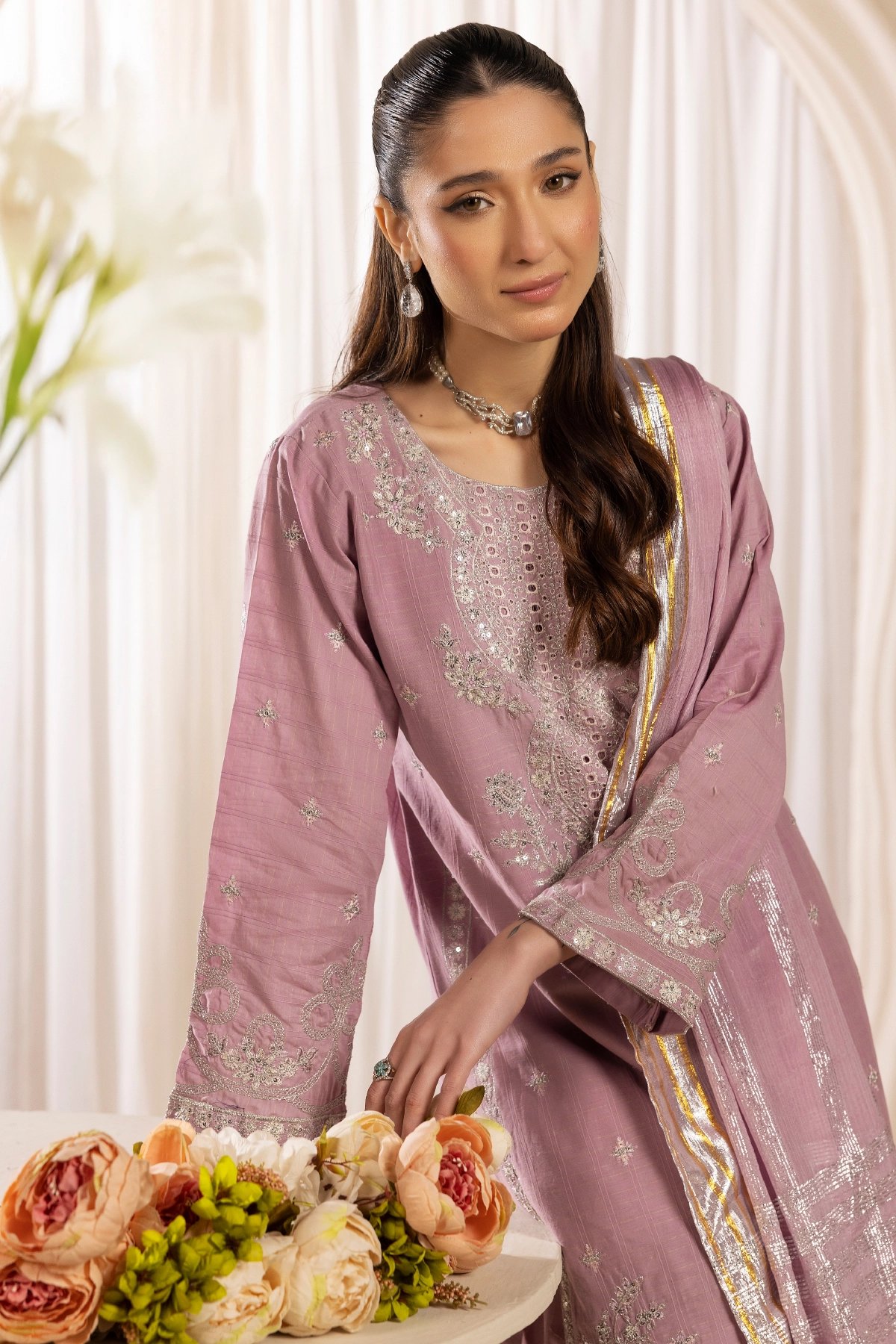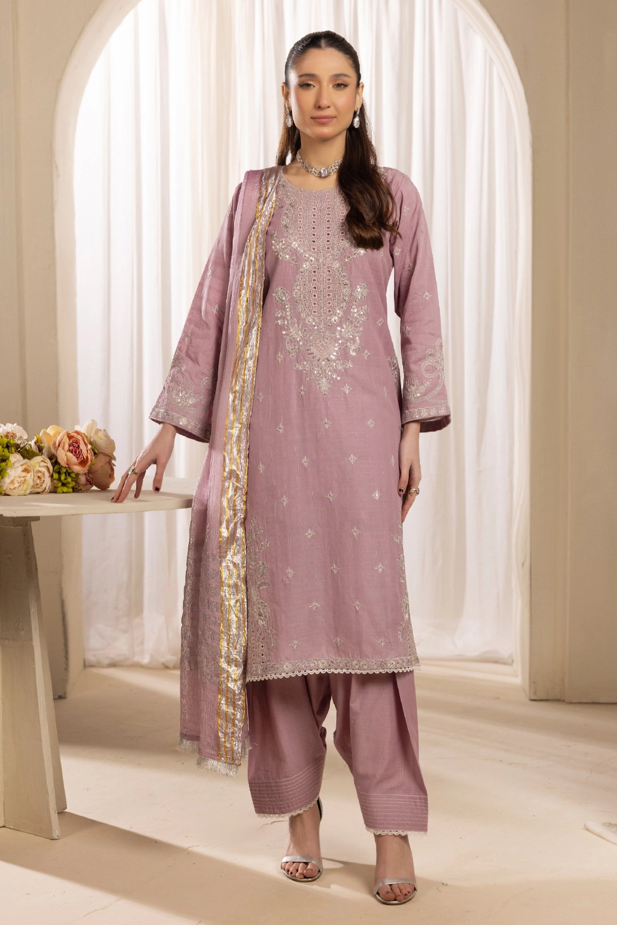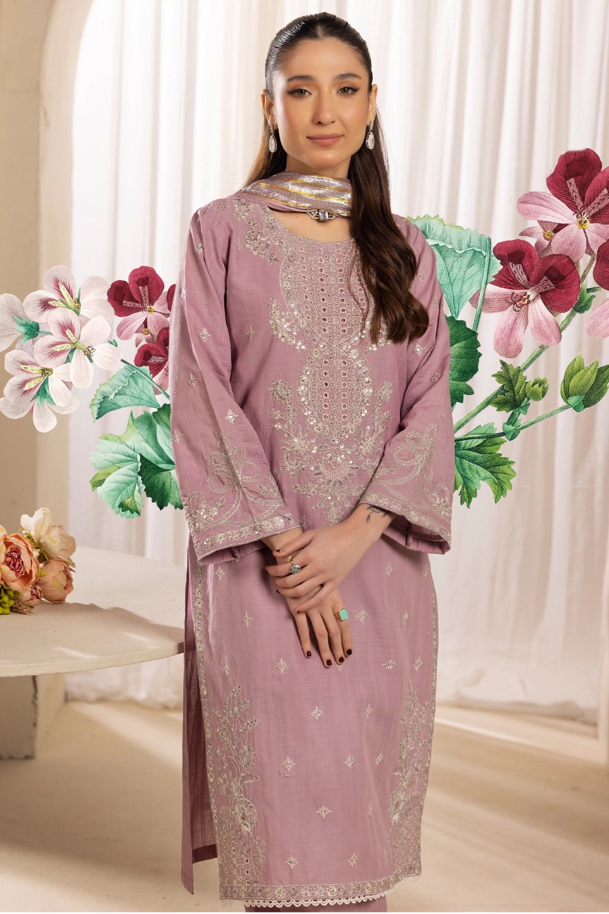 This beautiful 3-piece suit is crafted with exquisite embroidery on a soft lawn fabric, creating a refined and elegant look. The long, flowy silhouette is complemented by a traditional farshi shalwar, adding a regal touch to the outfit. The silk dupatta, adorned with delicate embellishments, enhances the ensemble with a graceful drape. A timeless outfit that’s classic and elegant, making it perfect for festive occasions and Eid wear.