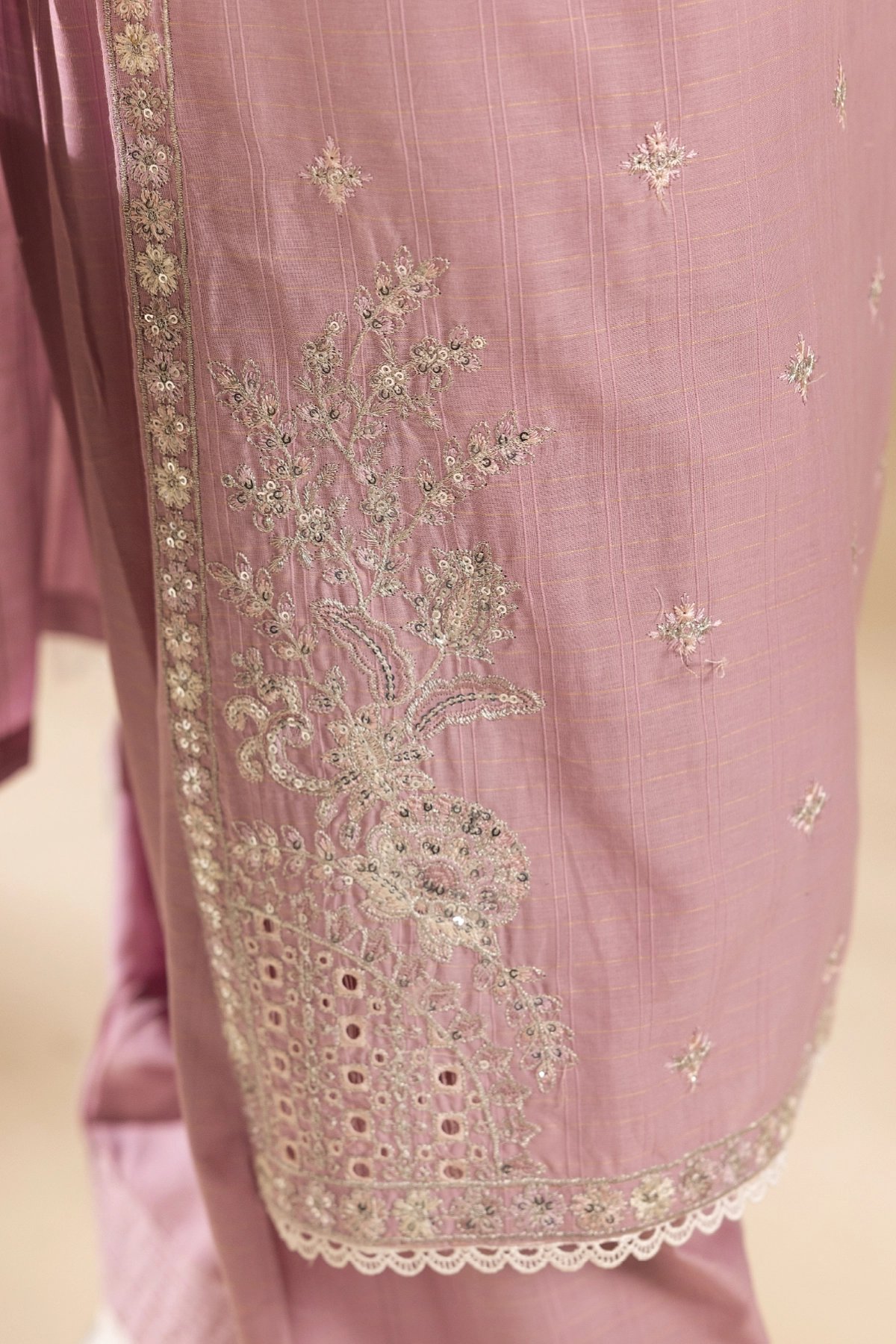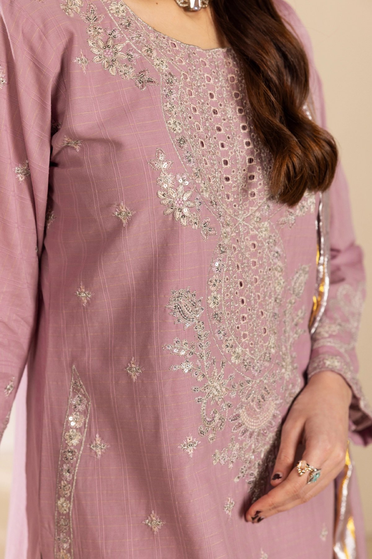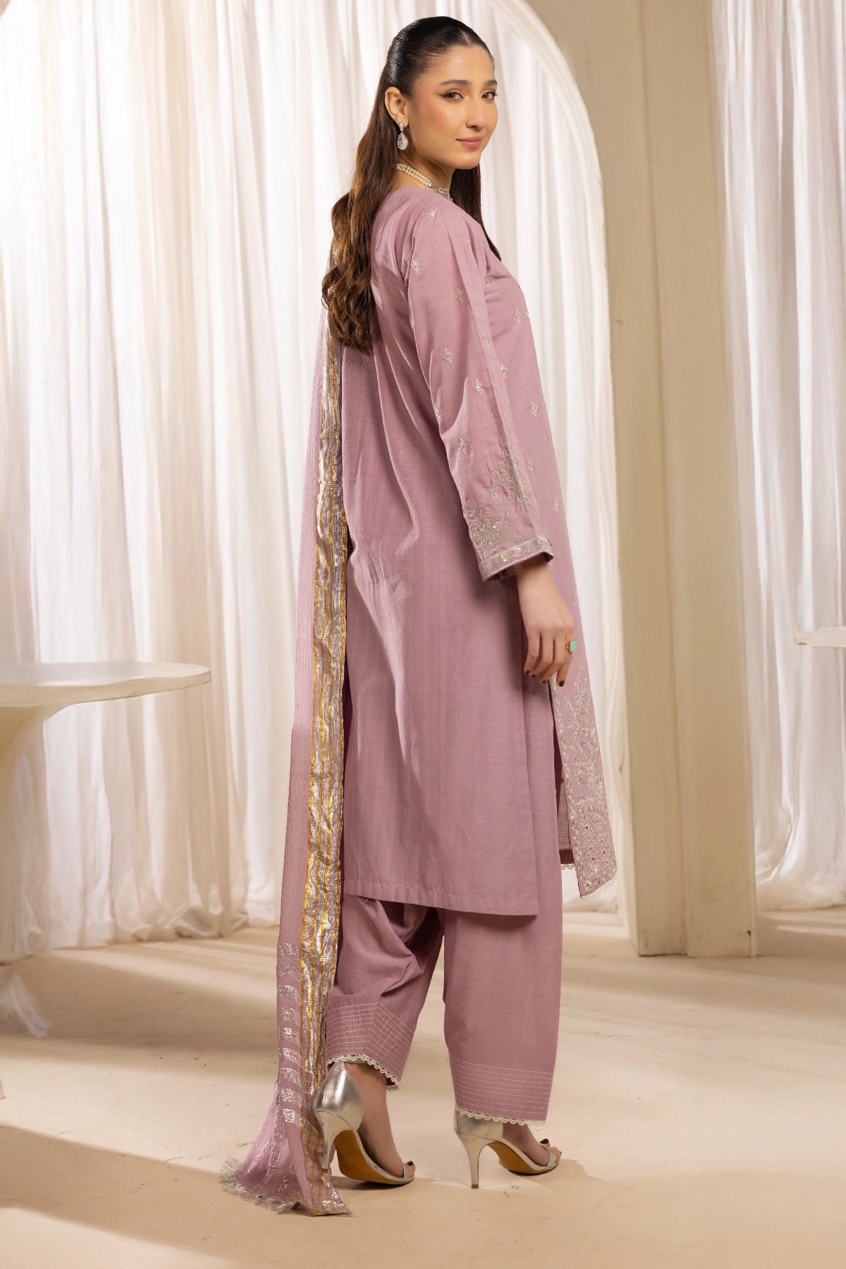 This beautiful 3-piece suit is crafted with exquisite embroidery on a soft lawn fabric, creating a refined and elegant look. The long, flowy silhouette is complemented by a traditional farshi shalwar, adding a regal touch to the outfit. The silk dupatta, adorned with delicate embellishments, enhances the ensemble with a graceful drape. A timeless outfit that’s classic and elegant, making it perfect for festive occasions and Eid wear.