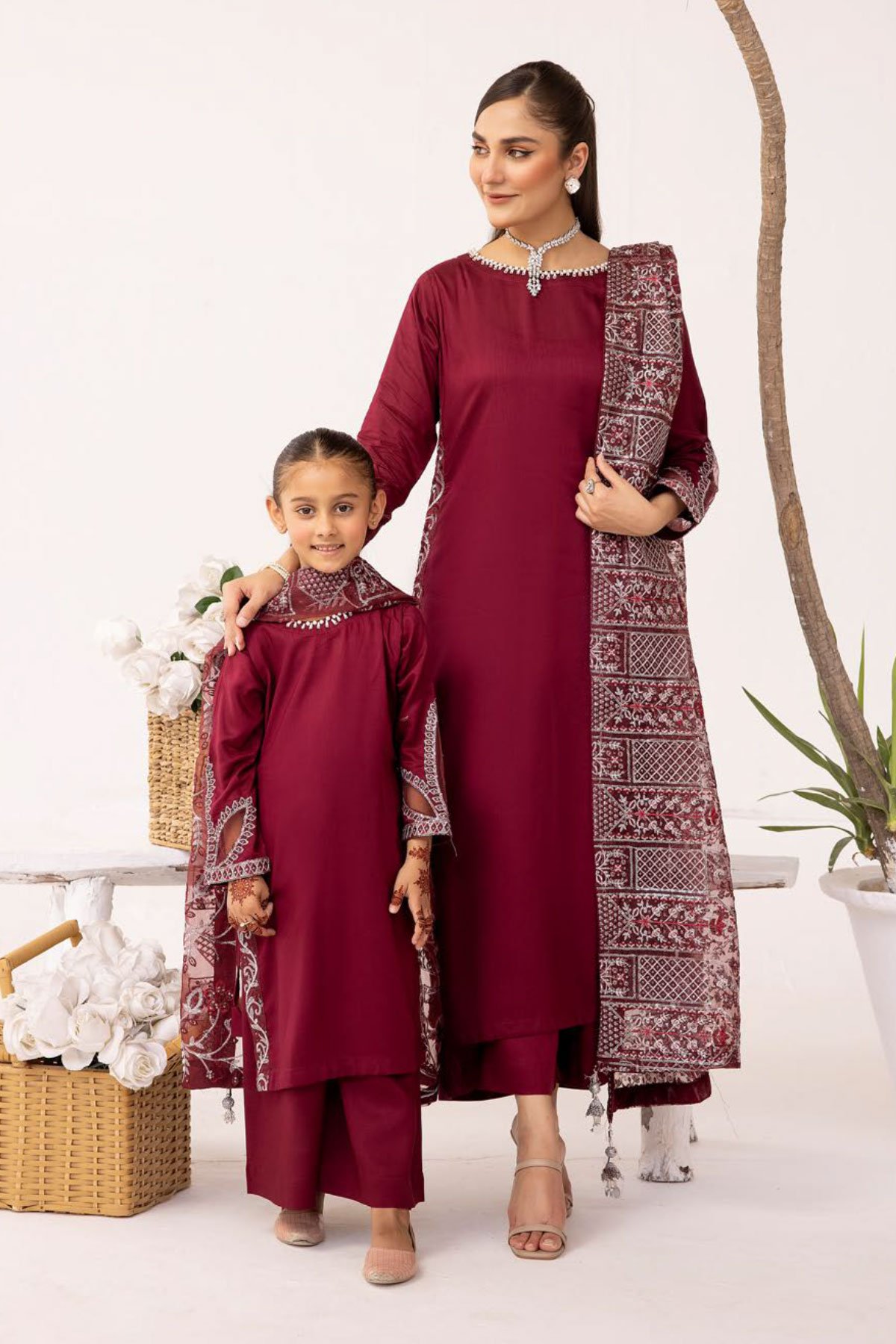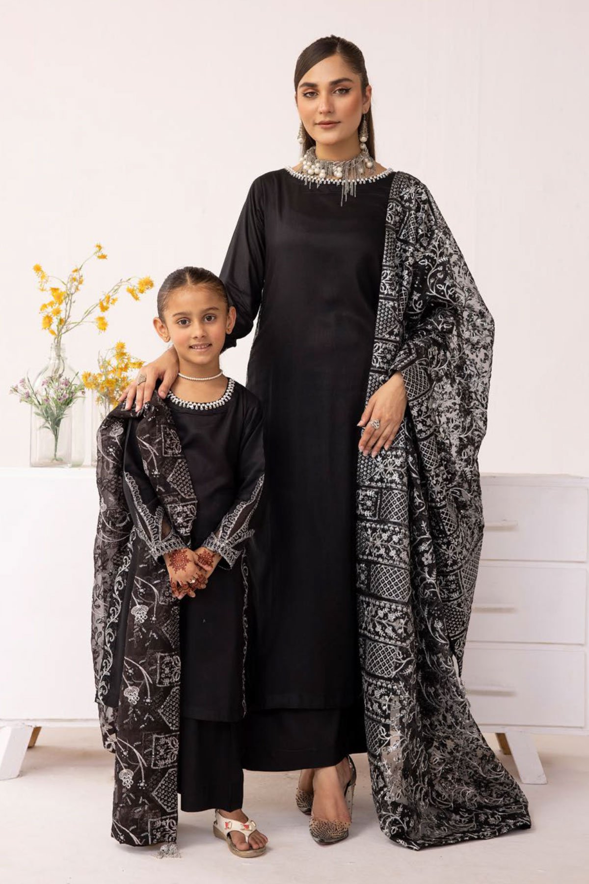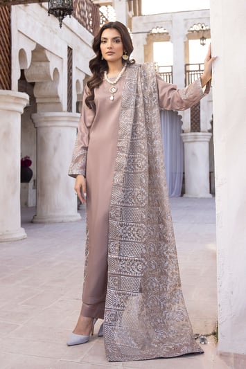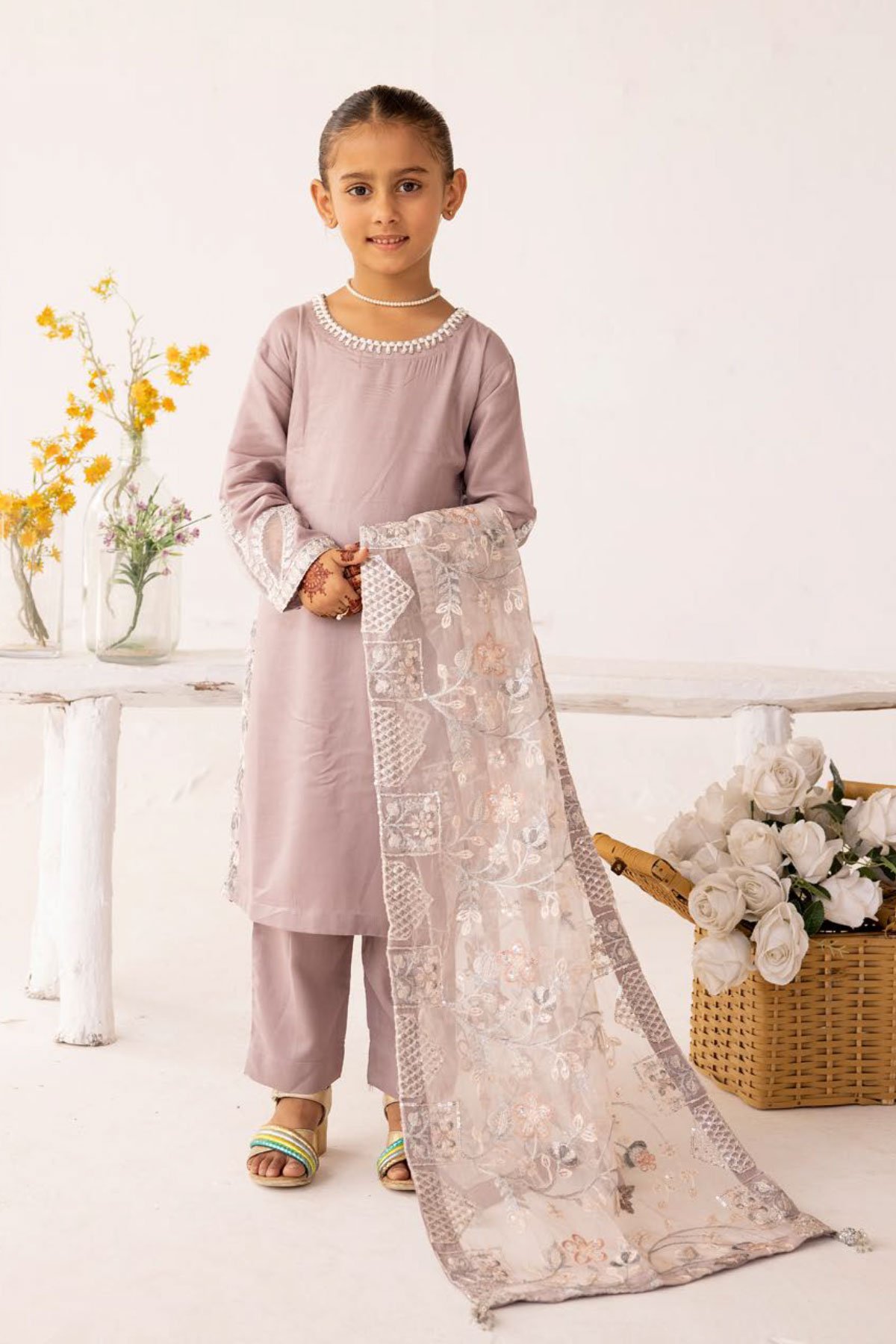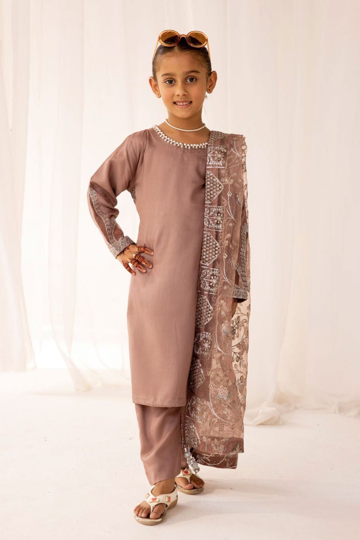 This beautiful 3 piece kids Sequence by Shiffonz suit features a straight shirt with bead embellishments on the round neckline along with sequence and thread work embroidery on the hems, finished with full length sleeves with embroidered cuffs. It comes with straight leg trousers and the look is finished with a luxury sequence and thread work embroidered dupatta.
