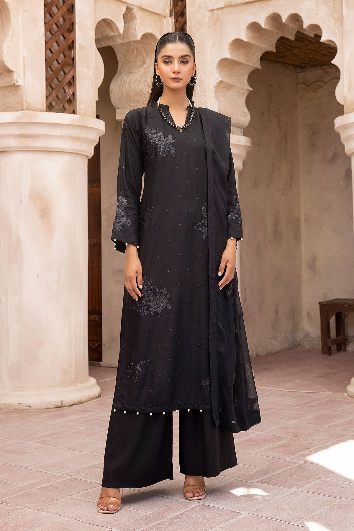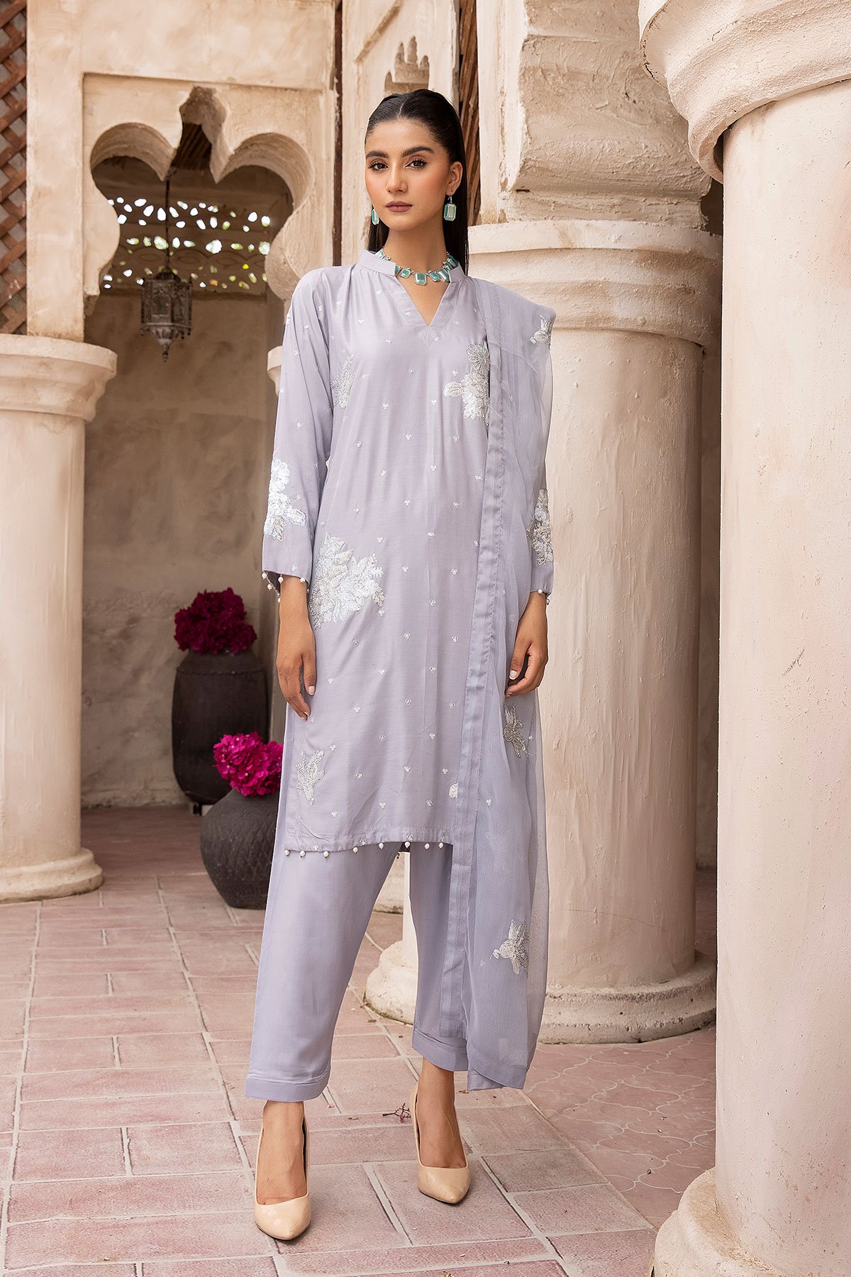 This beautiful 3 piece Sequence collection by Shiffonz features a straight shirt with sequence embroidered patterns along the front and full length sleeves finished with dangling beads on the border and cuffs. It comes with bell bottom trousers and the look is finished with a chiffon dupatta.