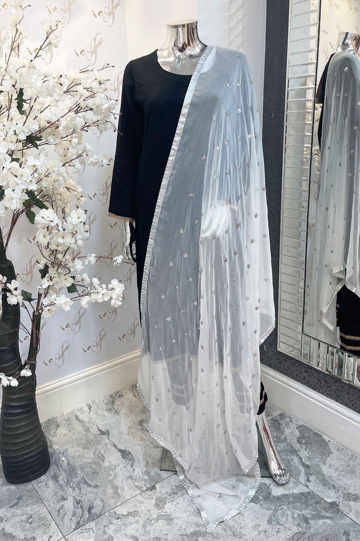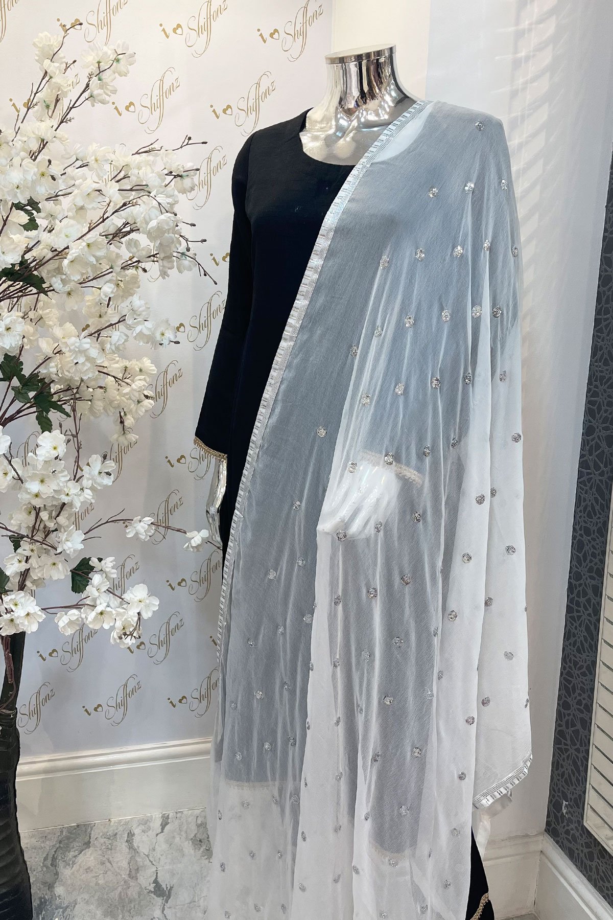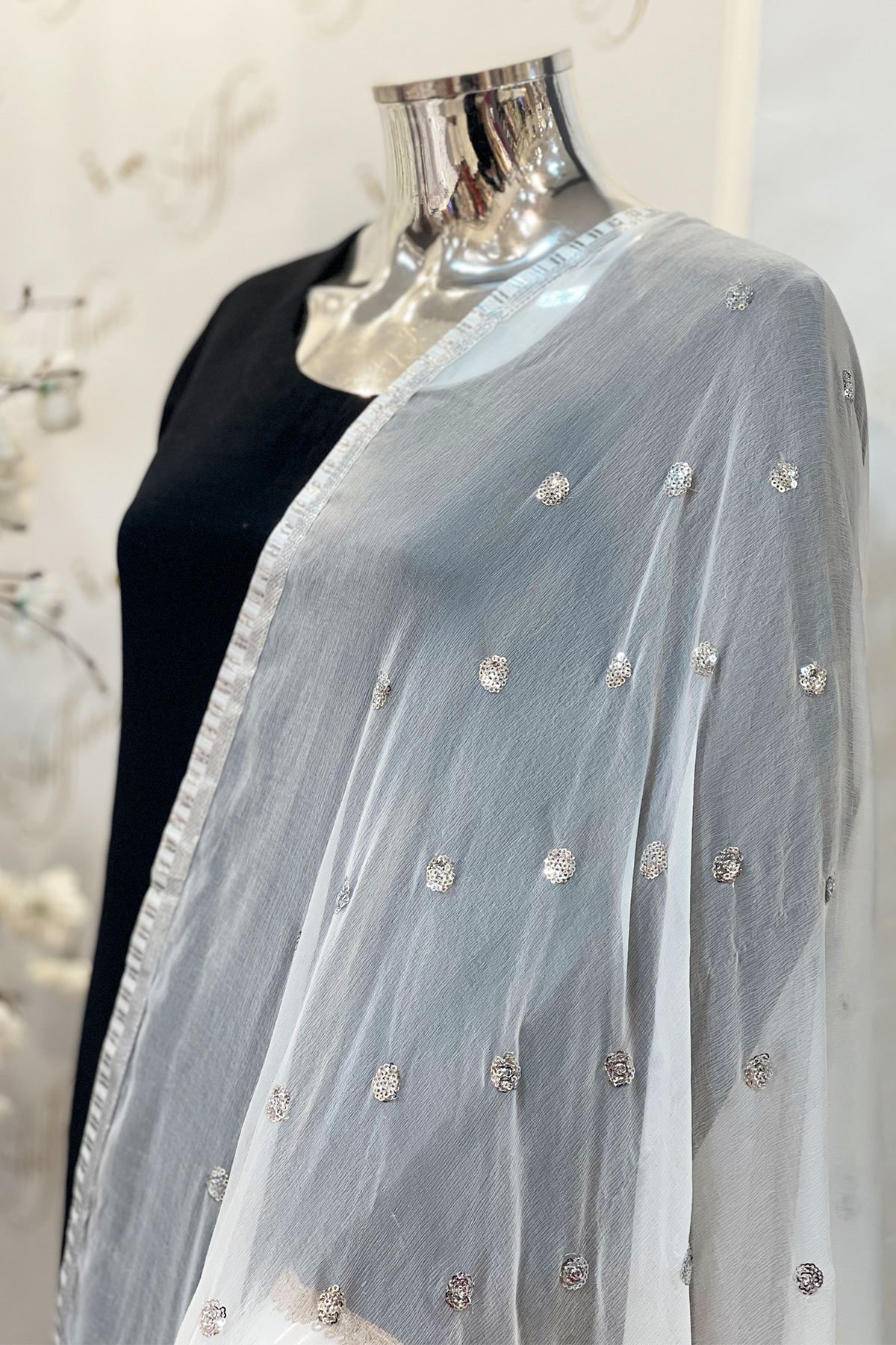 Add a touch of elegance to your wardrobe with this exquisite piece of splendid chiffon dupatta. Swathed with delicate sequence work, finished with silver lace on the border. This versatile stunner is a must in your collection.