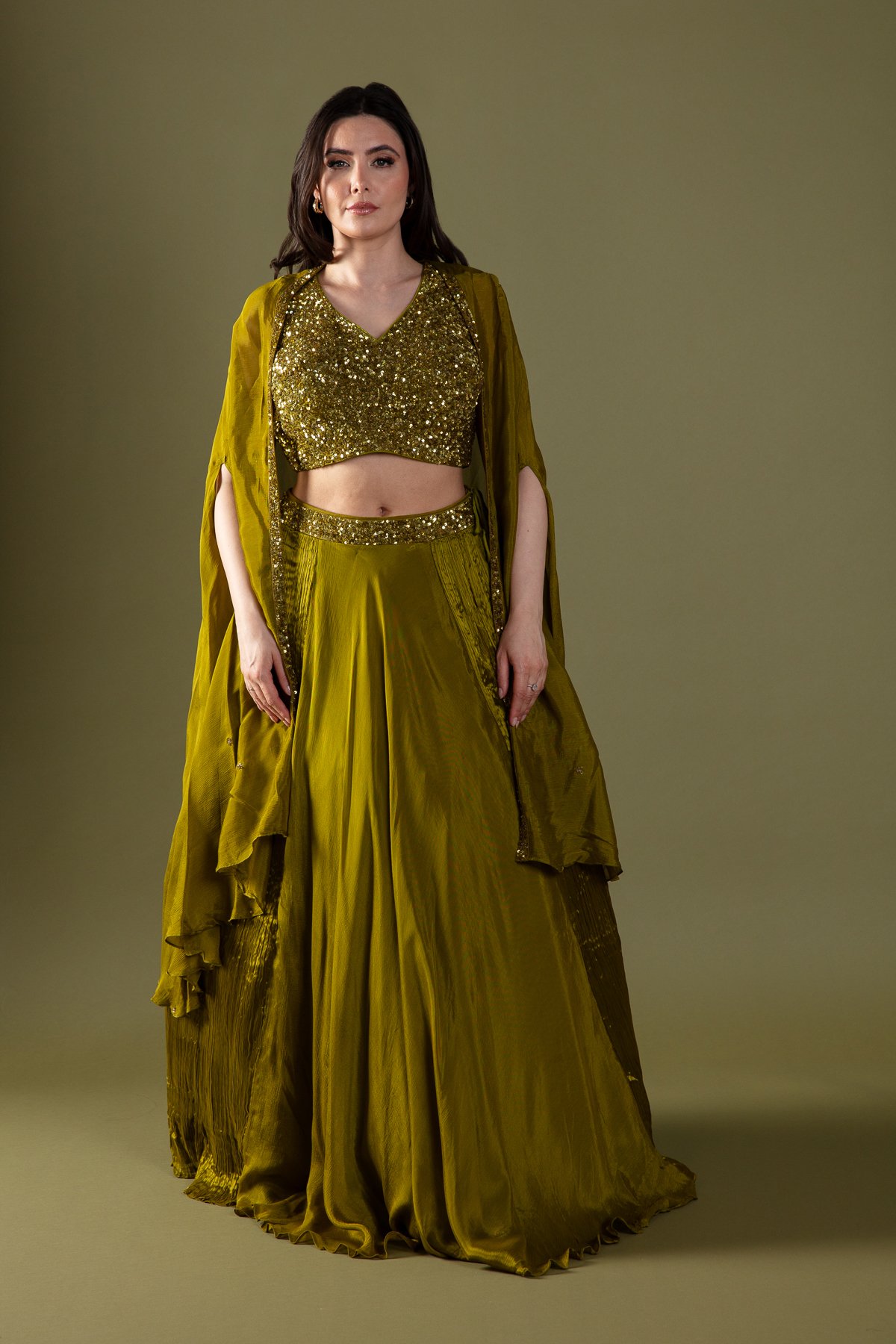 This beautiful 3 piece chiffon lengha choli features a short sequence embroidered top with a jacket style cape on top with a sequence embroidered border as shown in picture. The look is finished with a flared lengha with a sequence embroidered waist.