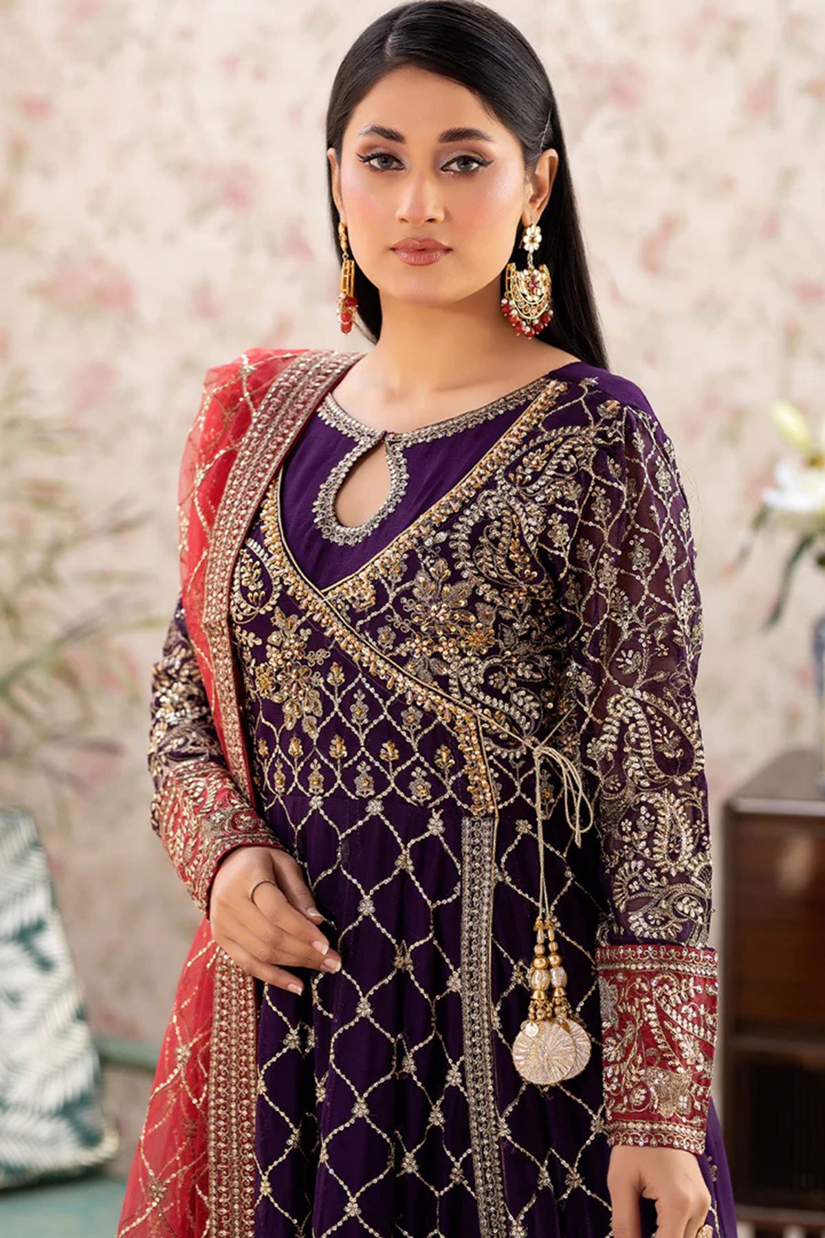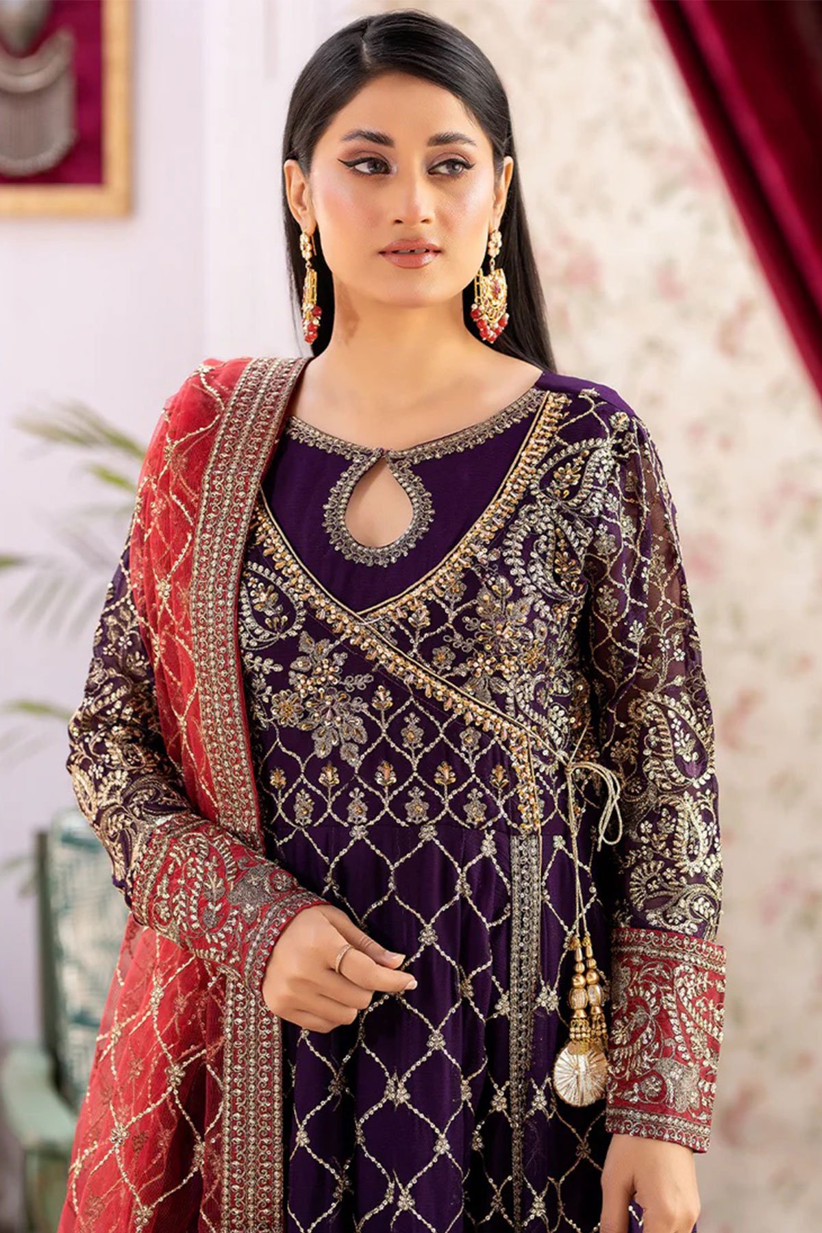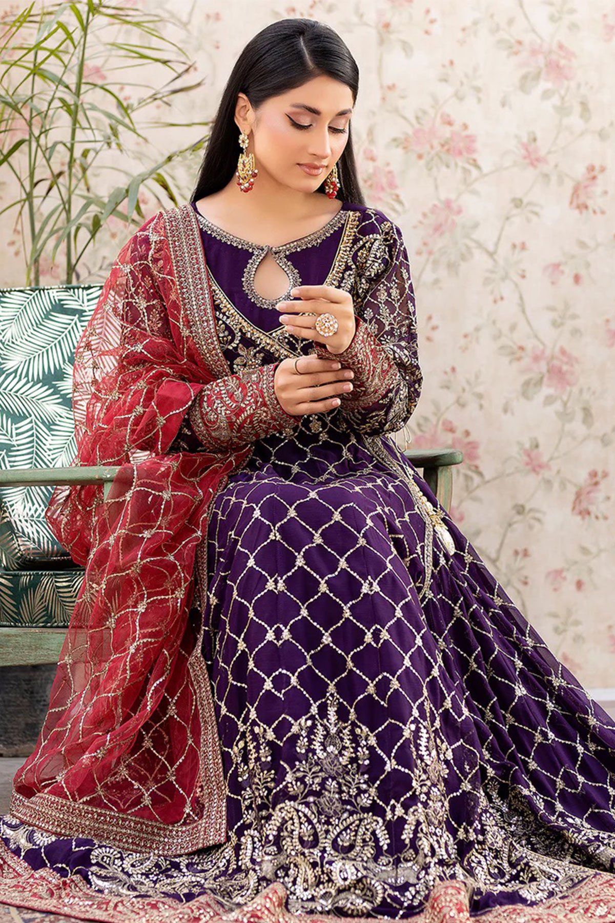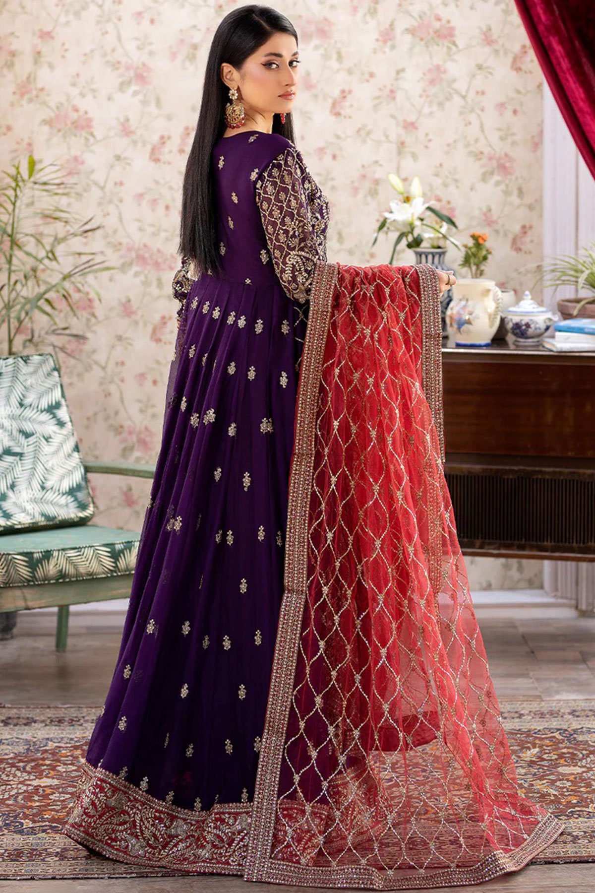 This beautiful 3 piece Shahjahan suit features a long dress. Chiffon maxi dresses are popular for their elegance and versatility. Angrakha style dress with luxury thread work and sequence embroidery throughout with a keyhole embroidered neckline, finished with full length embroidered sleeves. It comes with straight leg crepe trousers and the look is finished with a contrasted embroidered net dupatta.