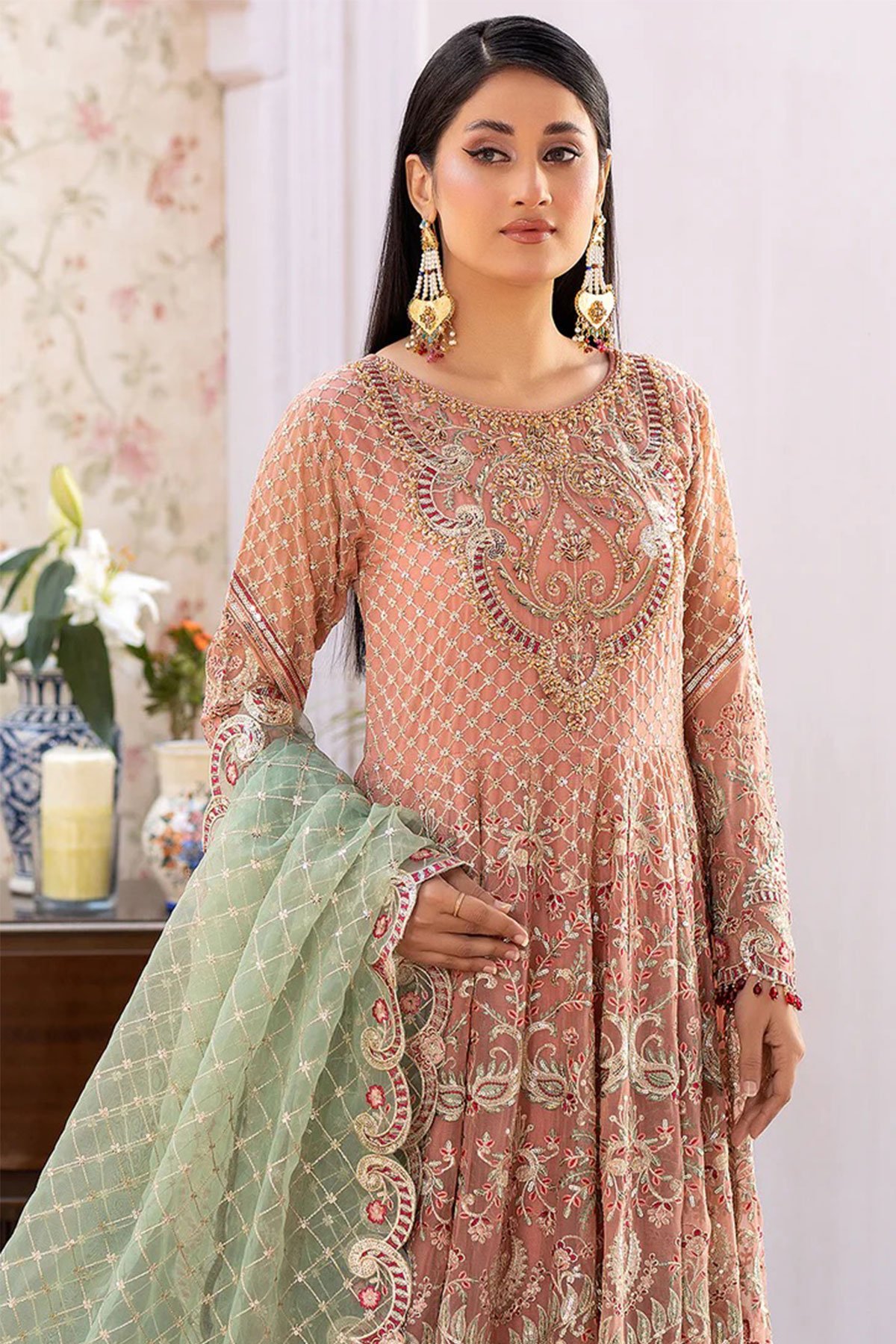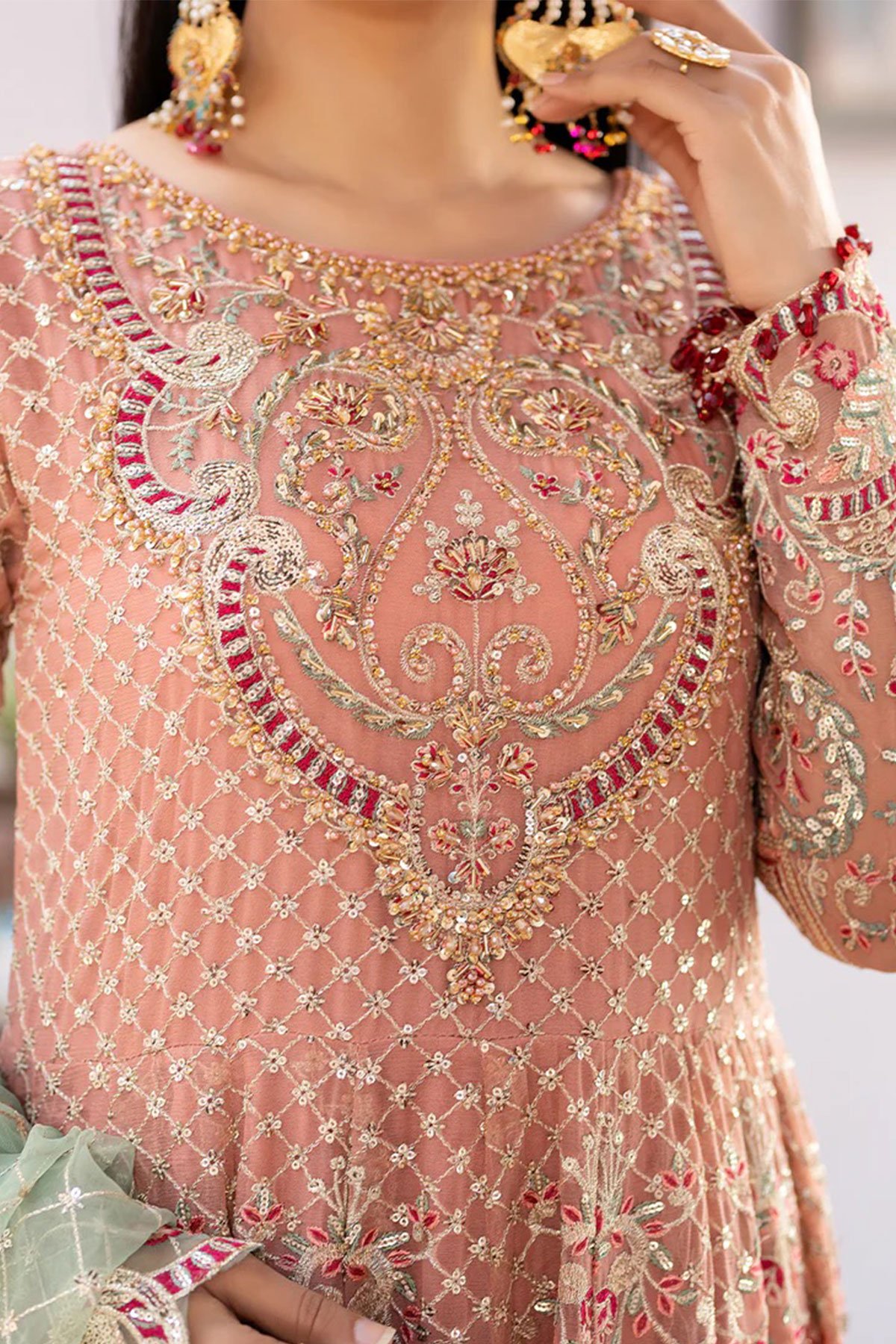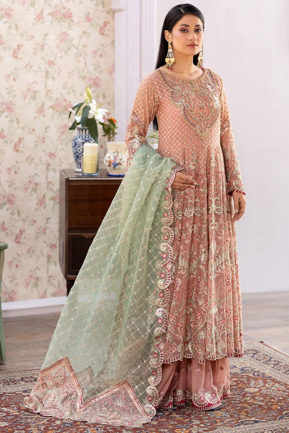 This beautiful 3 piece Shahjahan suit features a long dress. Chiffon peplum dresses are popular for their elegance and versatility. Peplum style dress with luxury thread work and beaded embroidery throughout, finished with full length embroidered sleeves. It comes with a chiffon embroidered gharara and the look is finished with a contrasted embroidered organza dupatta.