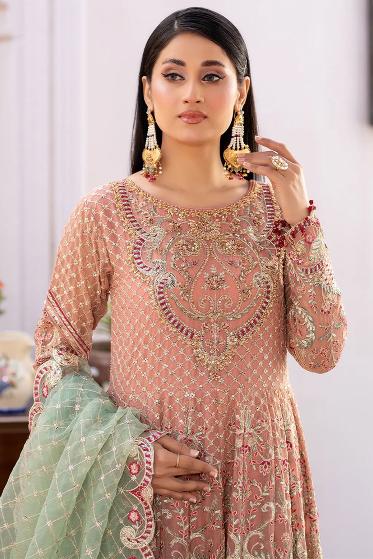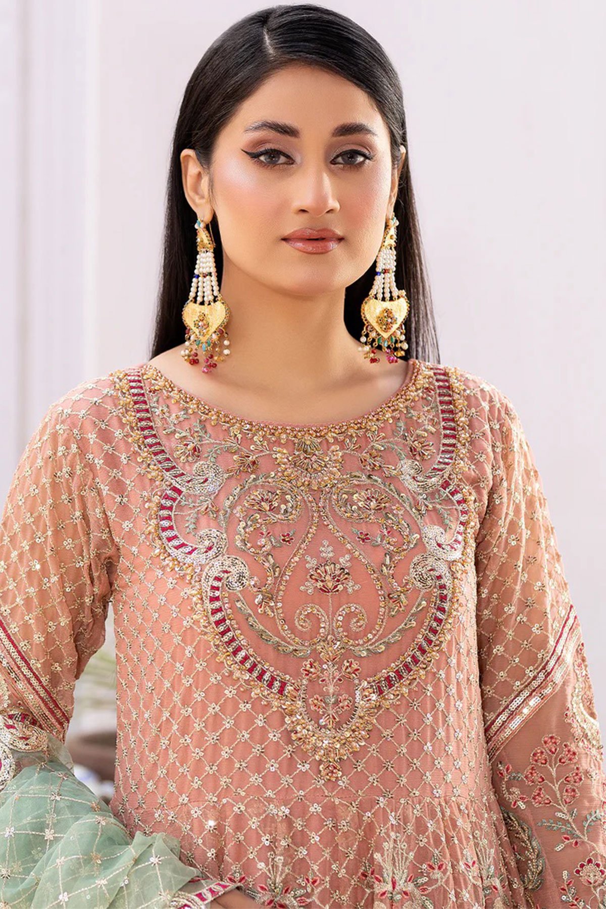 This beautiful 3 piece Shahjahan suit features a long dress. Chiffon peplum dresses are popular for their elegance and versatility. Peplum style dress with luxury thread work and beaded embroidery throughout, finished with full length embroidered sleeves. It comes with a chiffon embroidered gharara and the look is finished with a contrasted embroidered organza dupatta.