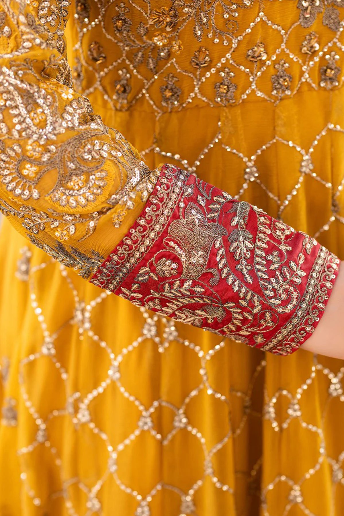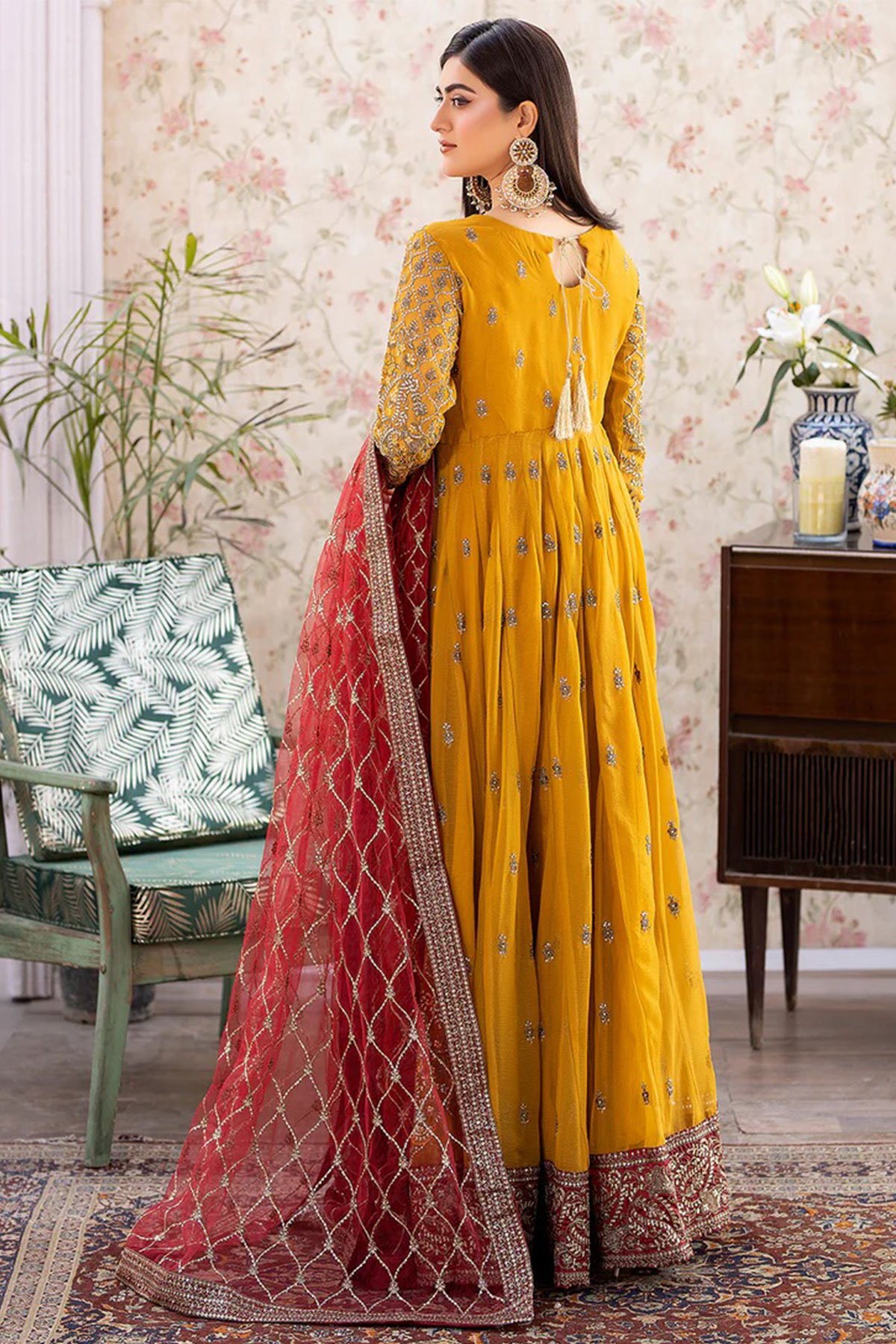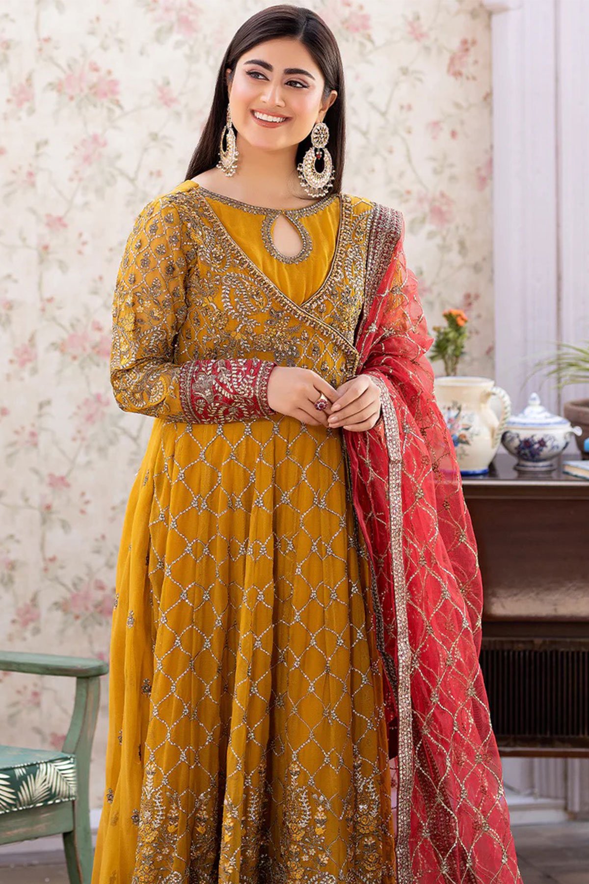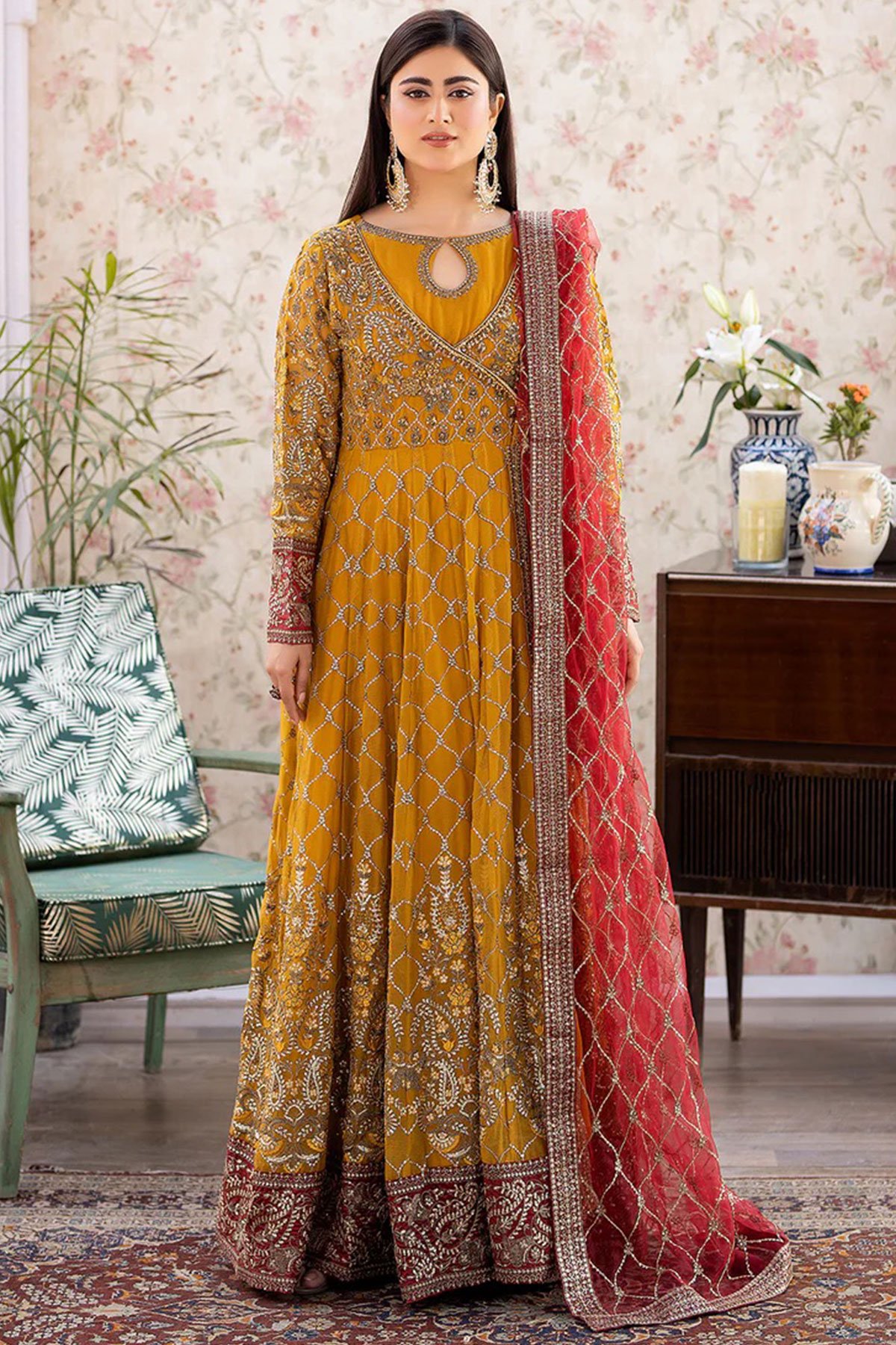 This beautiful 3 piece Shahjahan suit features a long dress. Chiffon maxi dresses are popular for their elegance and versatility. Angrakha style dress with luxury thread work and sequence embroidery throughout with a keyhole embroidered neckline, finished with full length embroidered sleeves. It comes with straight leg crepe trousers and the look is finished with a contrasted embroidered net dupatta.
