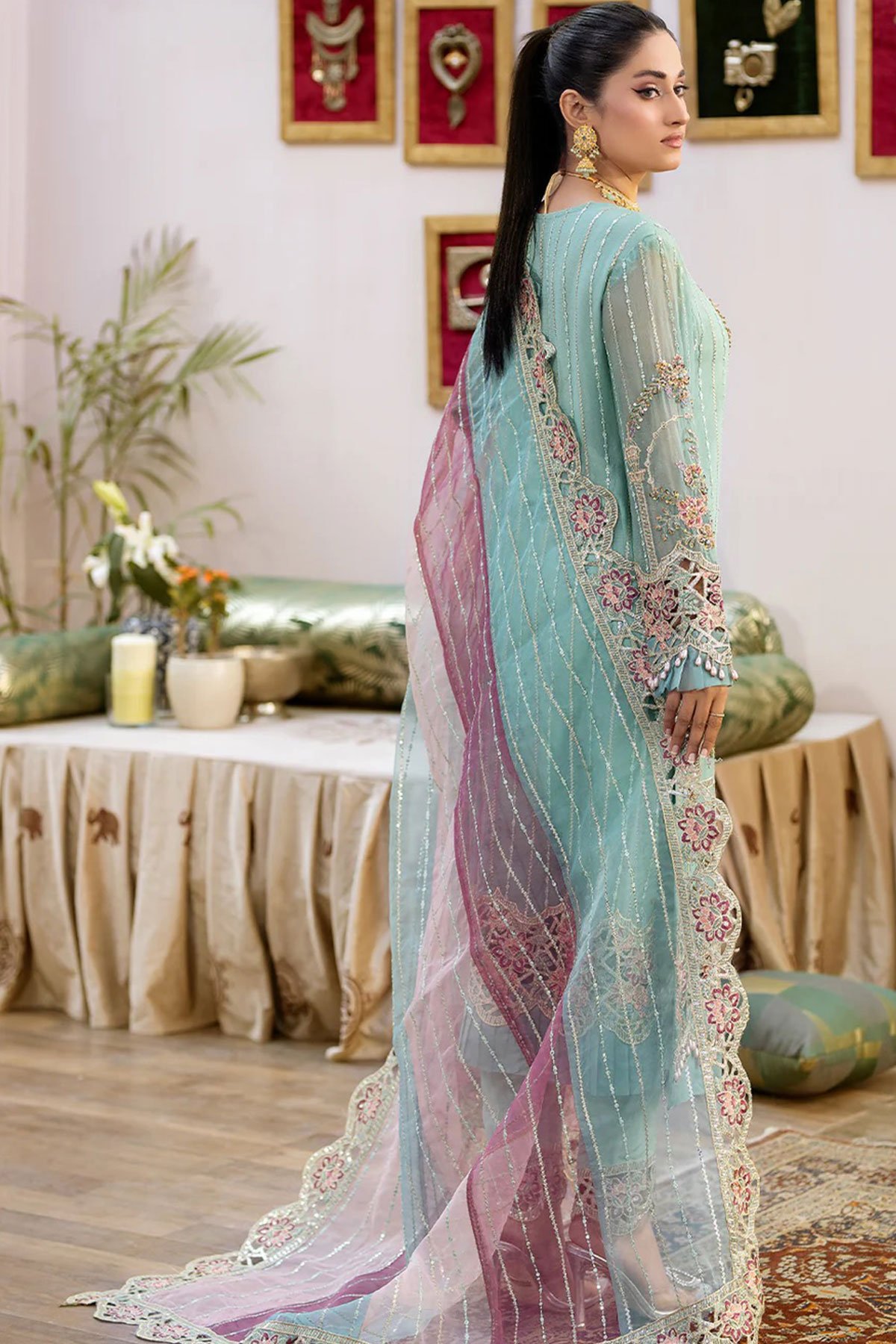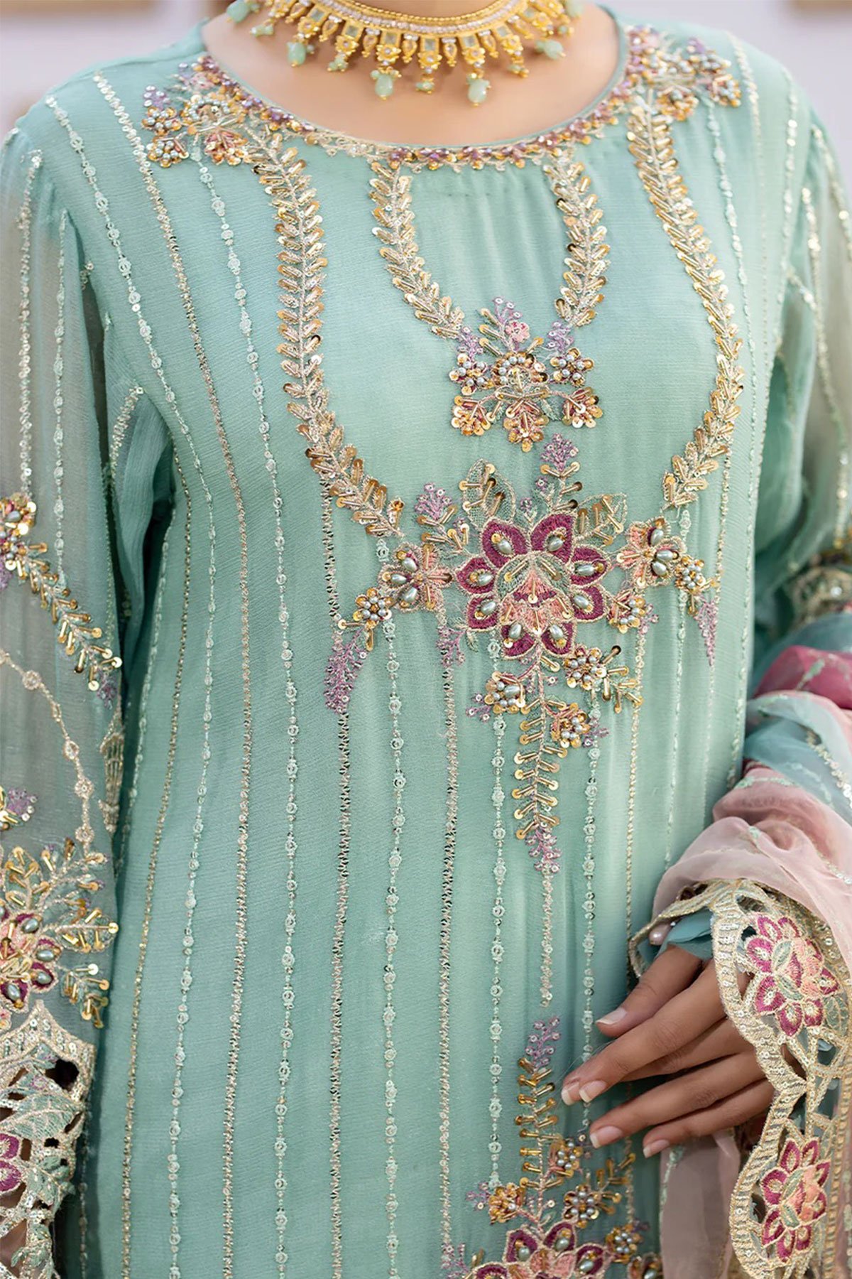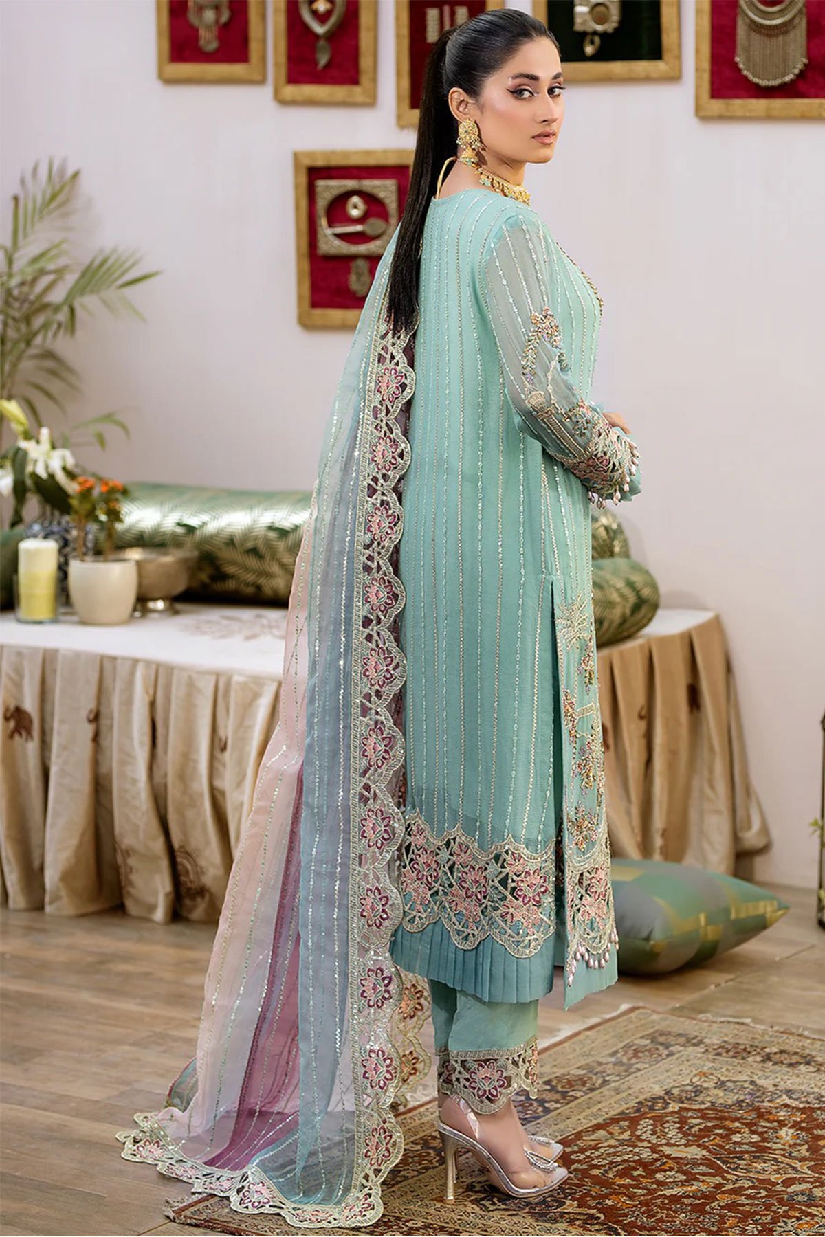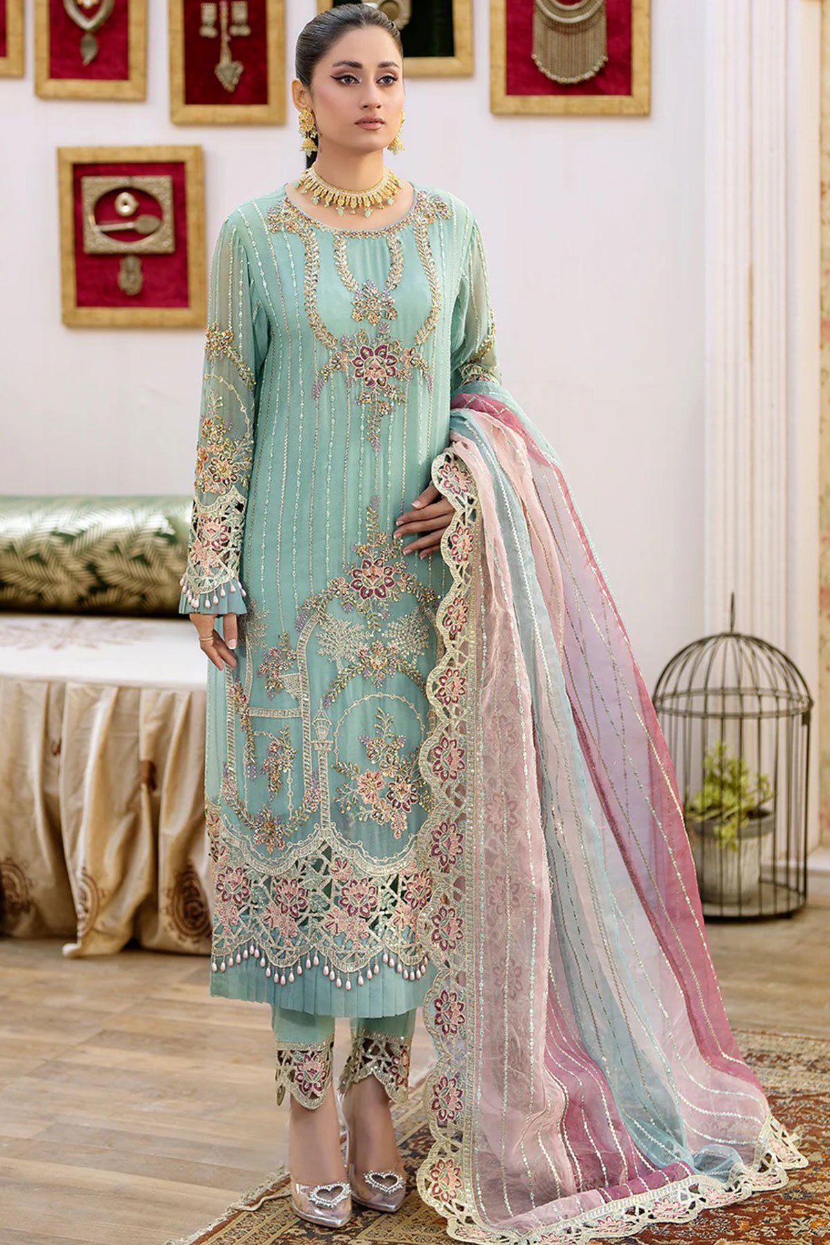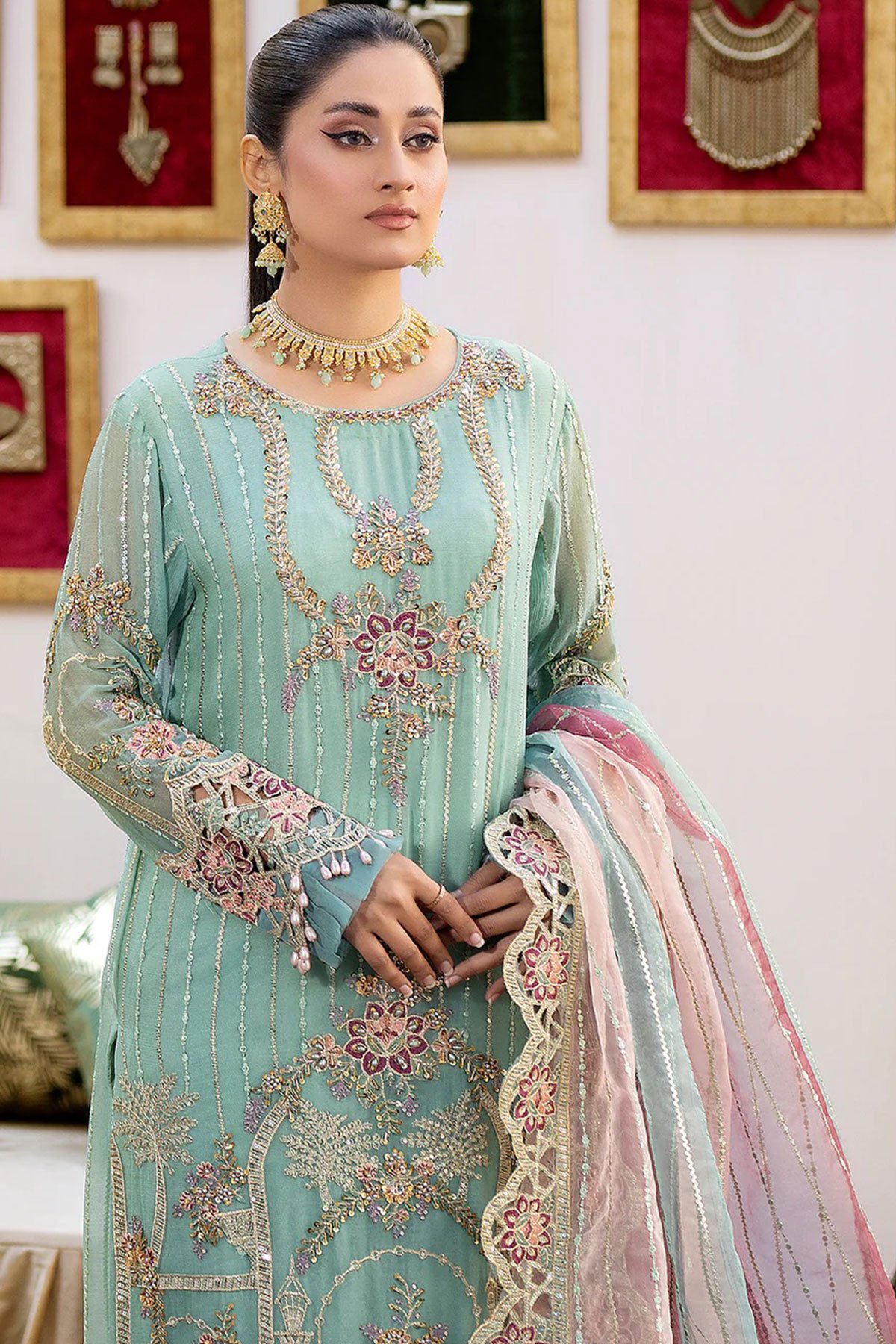 This beautiful 3 piece Shahjahan chiffon collection features a straight shirt with luxury adda and tilla work with sequence embellishments throughout, finished with full length embroidered sleeves and dangling beads on the border. It comes with straight leg crepe trousers and the look is finished with a contrasted organza embroidered dupatta.