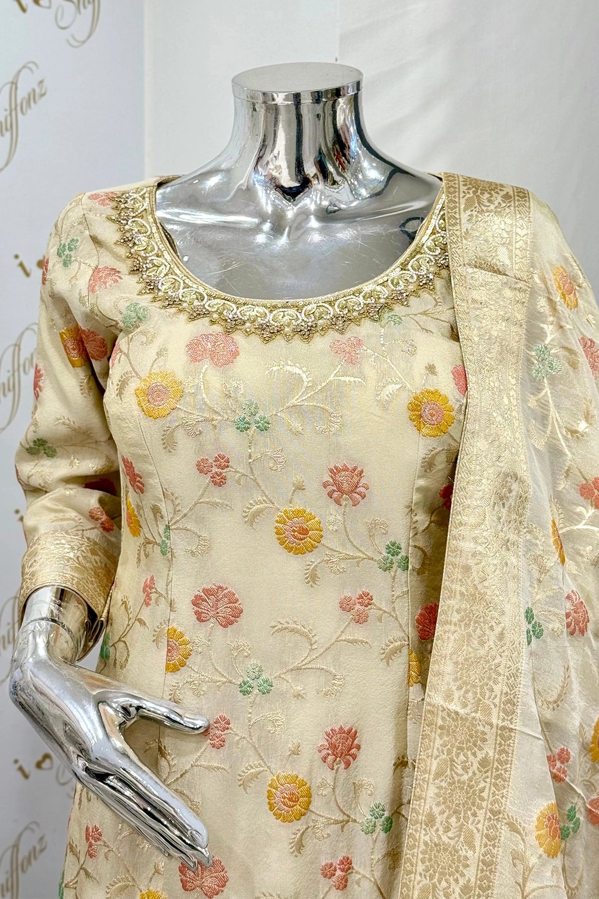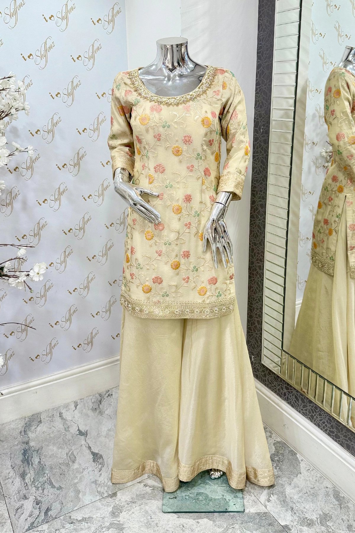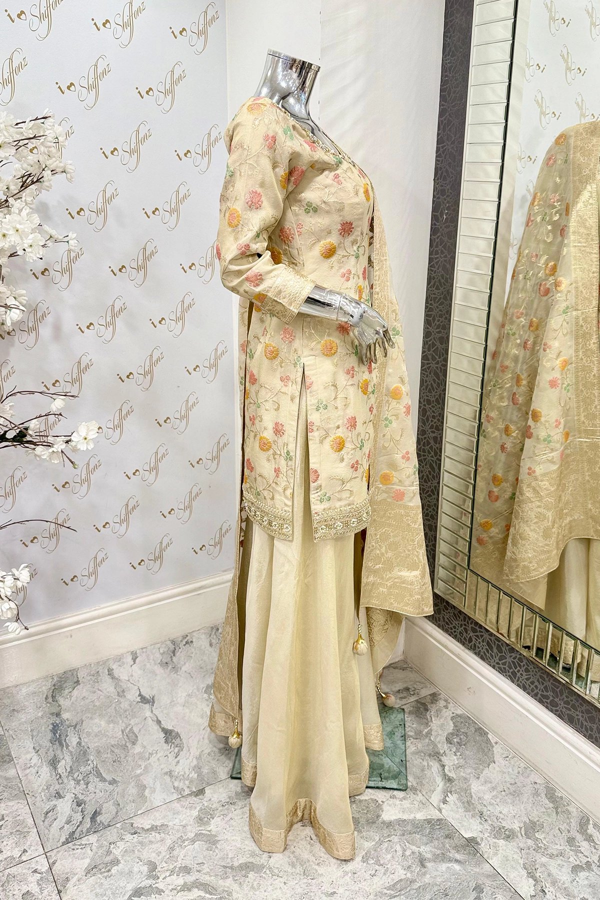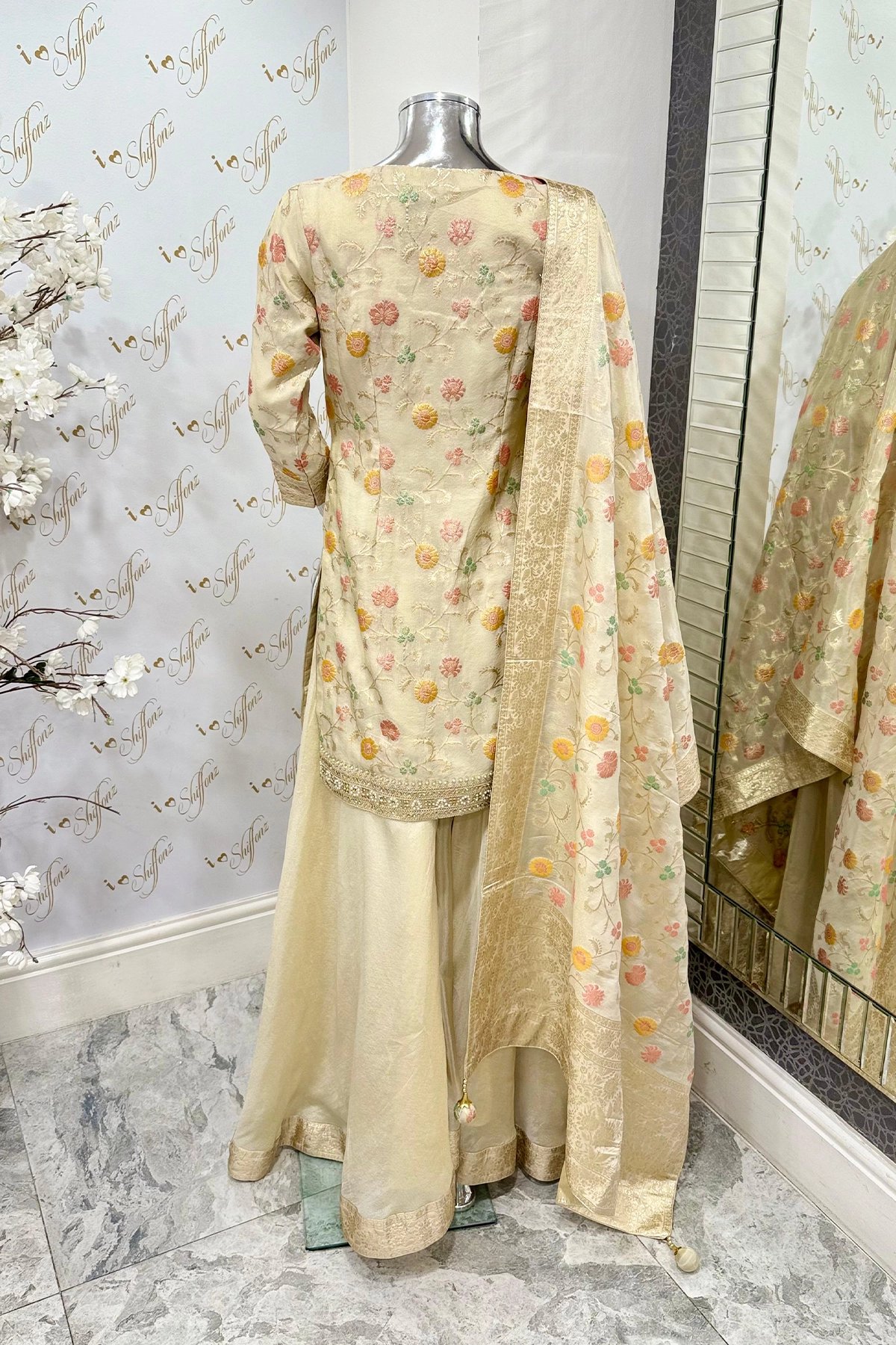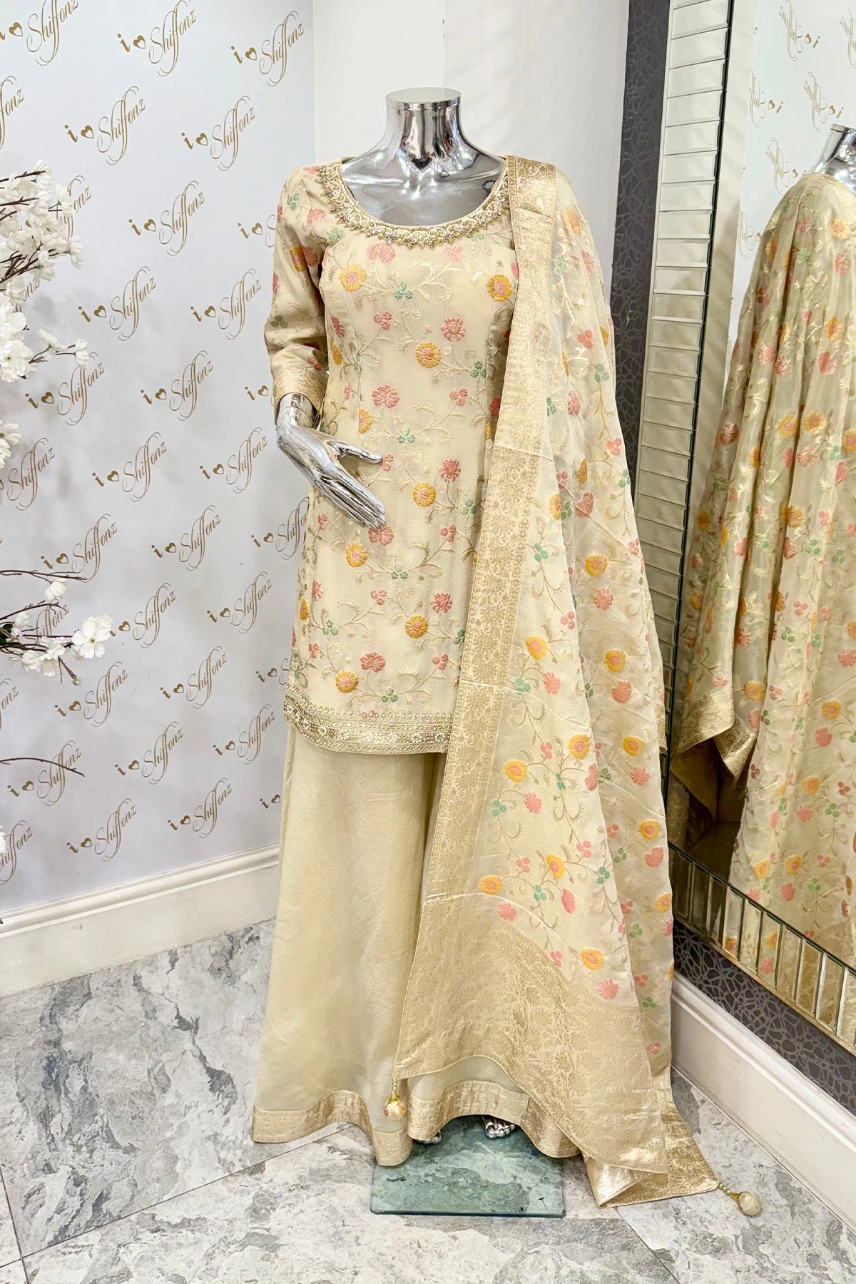 This beautiful 3 piece suit features a banarsi shirt with a luxurious embroidered round neckline and an elegant embroidered border, finished with full-length sleeves. It is paired with a pure shimmer sharara, and the ensemble is completed with a banarsi embroidered dupatta. Please note: Banarsi prints may vary on each suit. While renowned for their intricate designs and rich embellishments, the specific patterns, motifs, and types of embellishments can differ from suit to suit.