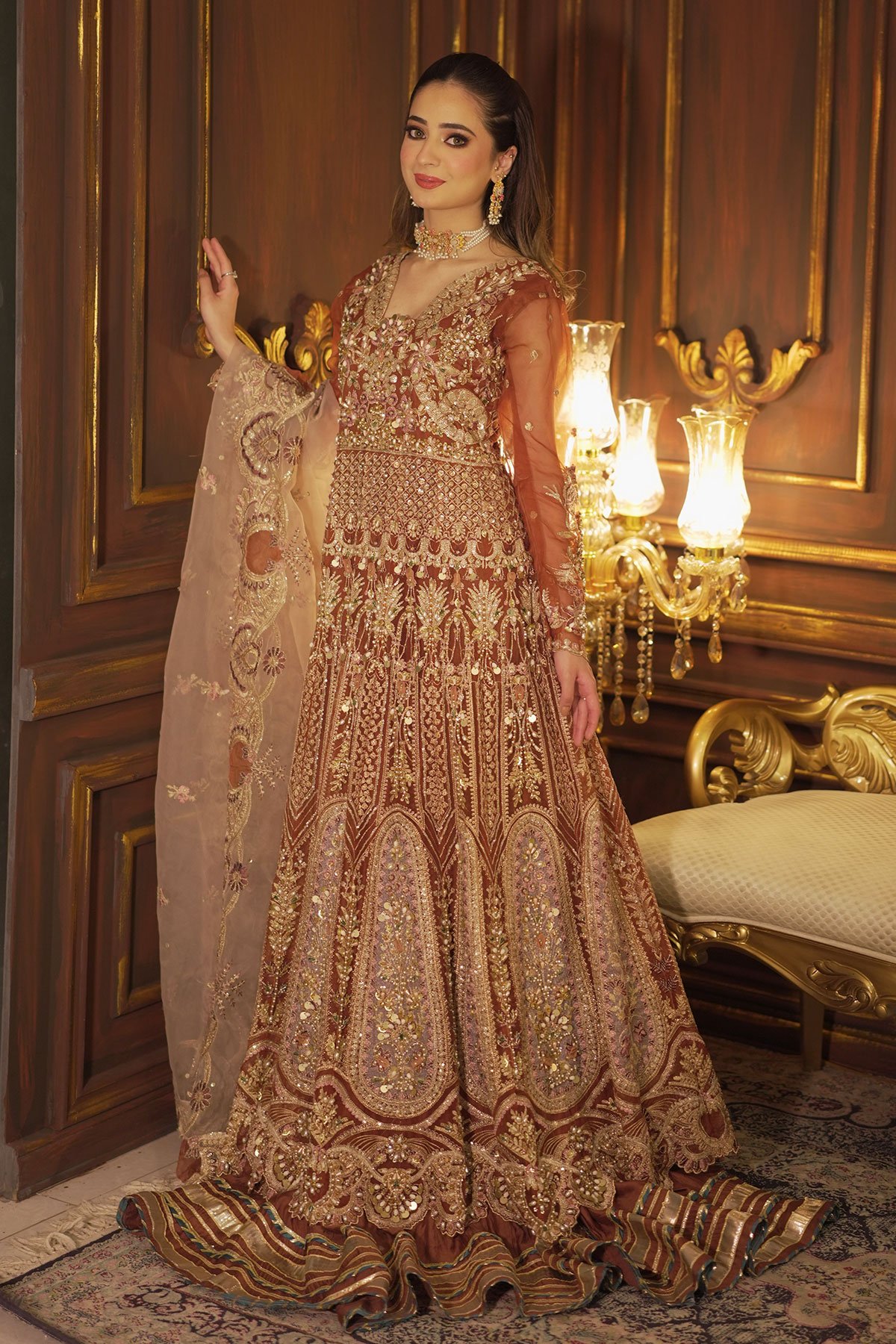 This beautiful Sherin wedding collection gown features luxury thread work embroidery with sequence bead and motif work throughout, finished with a longer inner gown with gold piping and full length embroidered sleeves. The look is finished with a contrasted embroidered dupatta. Note: Above catalogue picture is for design only.