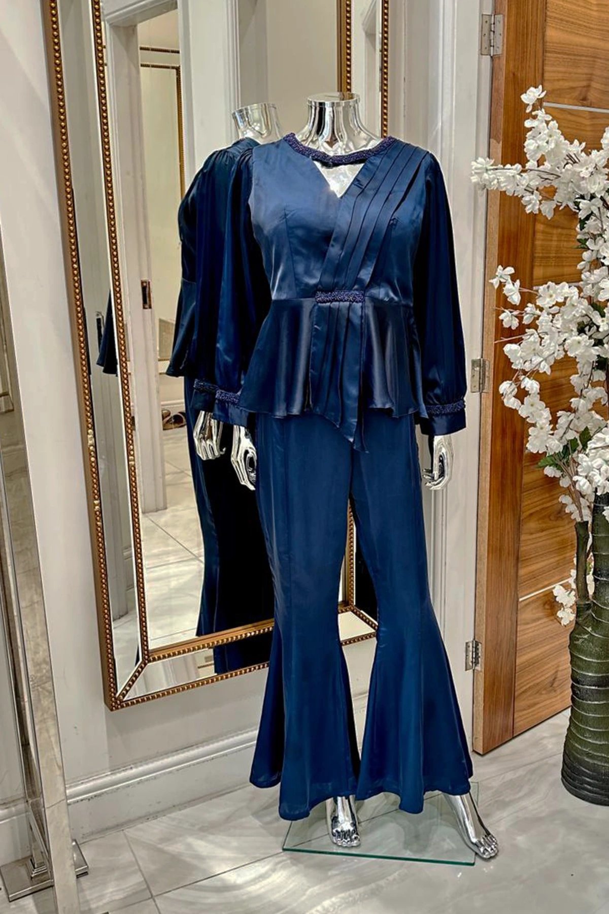 This beautiful 2 piece by Shiffonz features a short peplum top with pleated embellishment along with an embroidered neckline and waist style. Paired with flared plazo style trousers. This outfit is perfect for effortless style and comfort. Ideal for Eid celebrations and special occasions.