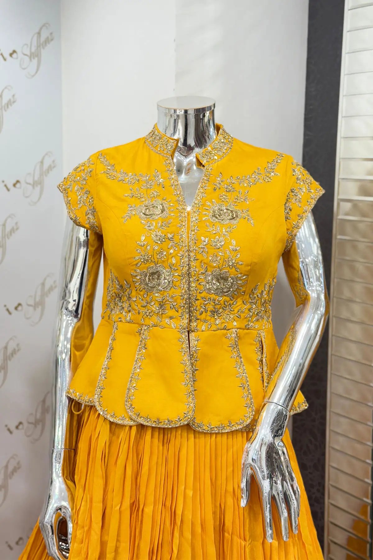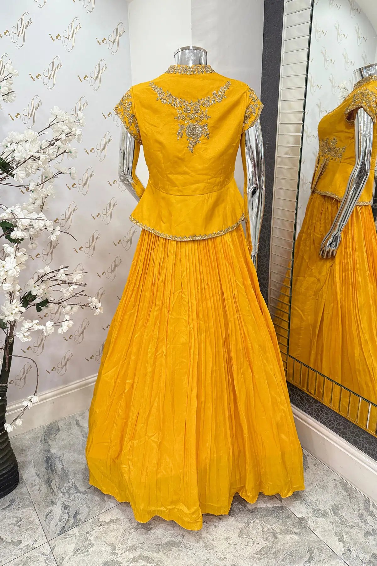 This beautiful 2 piece Shiffonz lengha choli features a short peplum style blouse with luxury thread work embroidery with sequence embellishments finished with short length embroidered sleeves. Paired with a pleated chiffon flared lengha with can can.