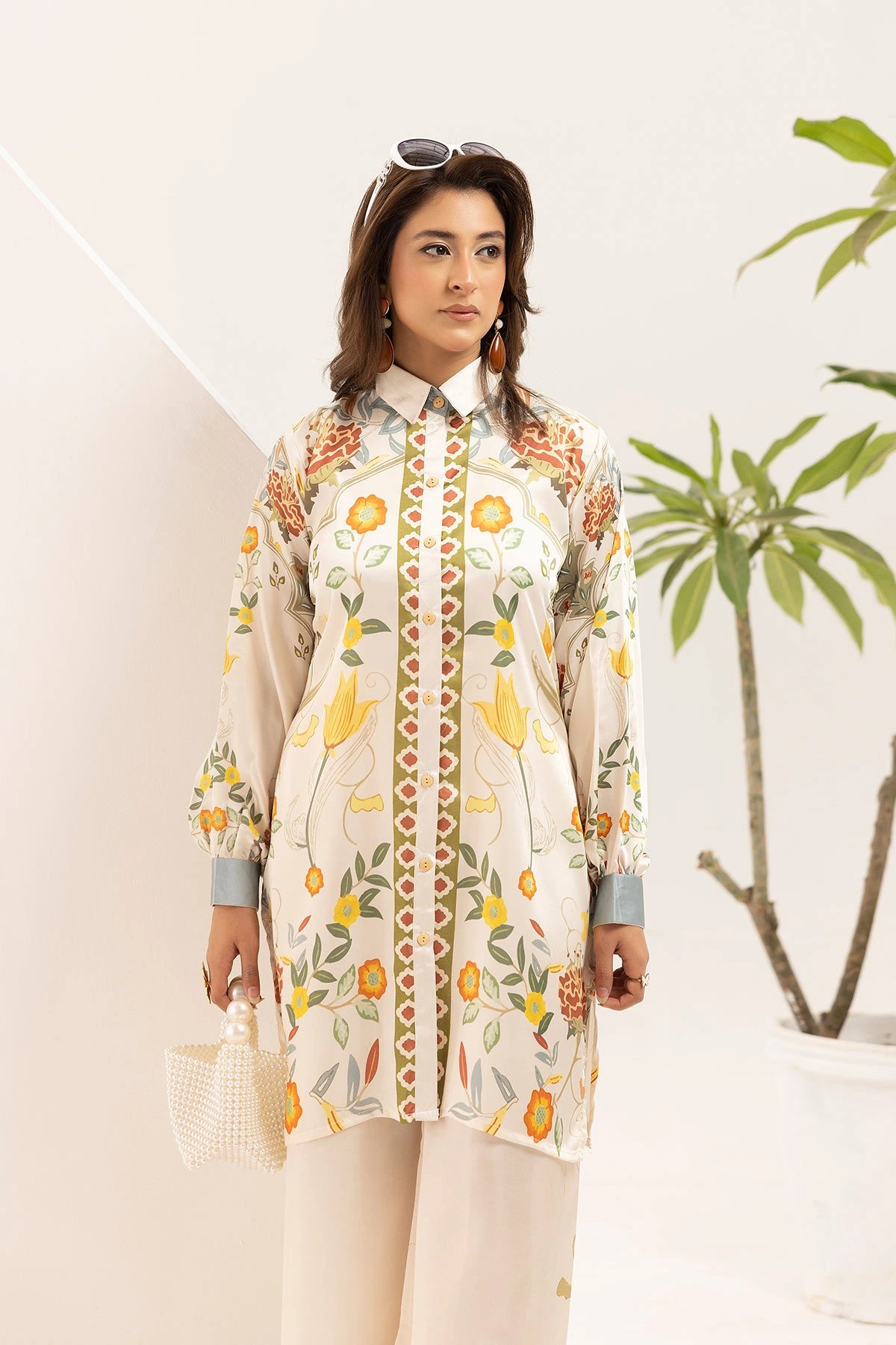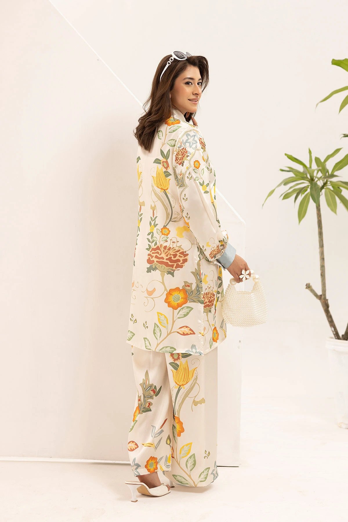 This beautiful 2-piece co-ord set is designed for effortless elegance and comfort. A straight shirt crafted from french silk crepe fabric, features a captivating printed design that adds a modern and stylish touch. Paired with matching printed plazo trousers, this ensemble offers a fluid and relaxed silhouette, perfect for both casual and semi-formal occasions. A versatile addition to your wardrobe, ideal for all-day wear with a chic and contemporary appeal. Note: The printed patterns on the borders may vary in each piece.