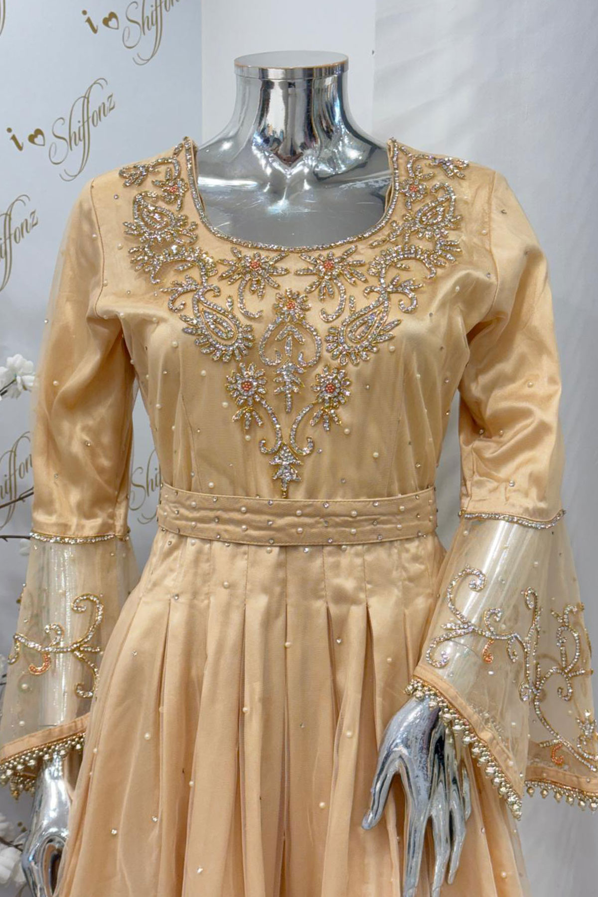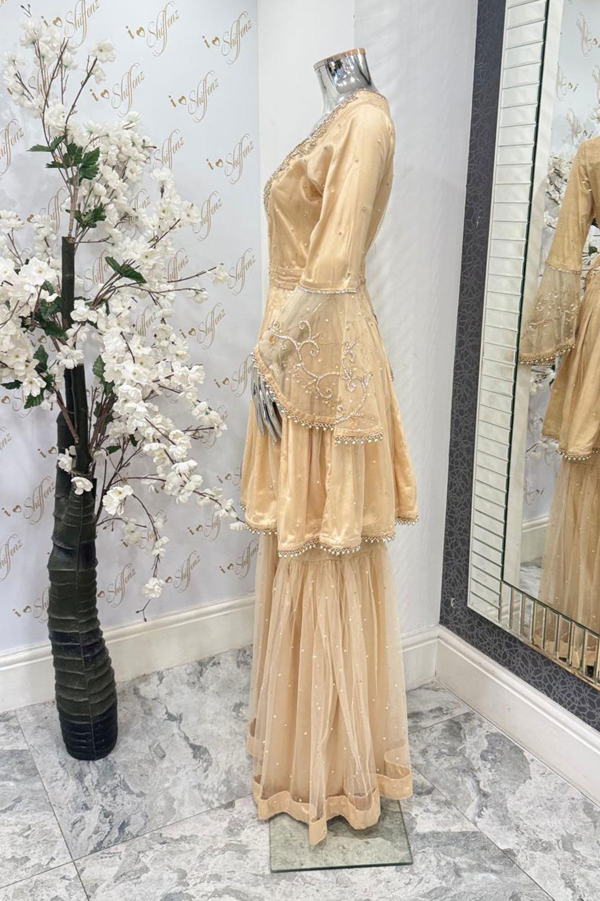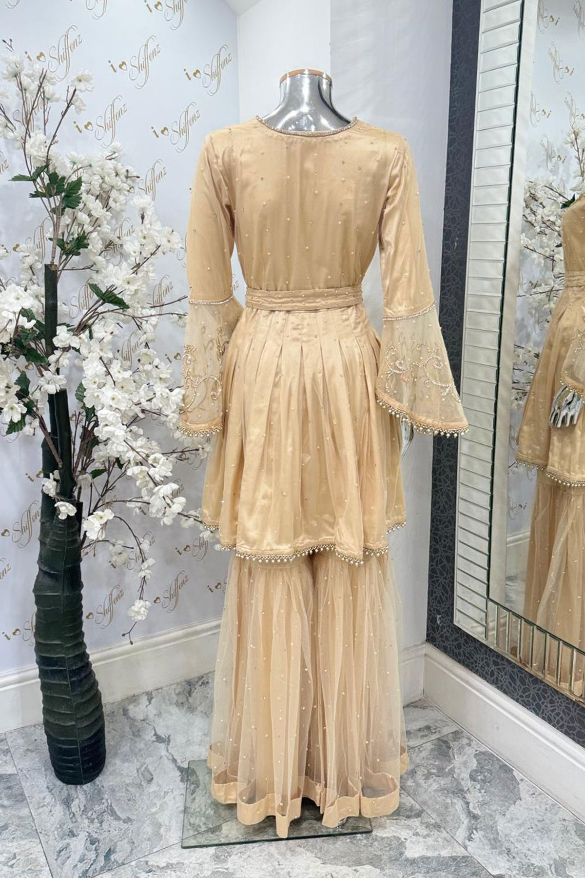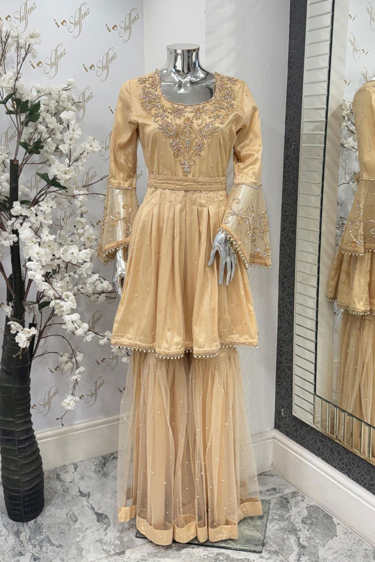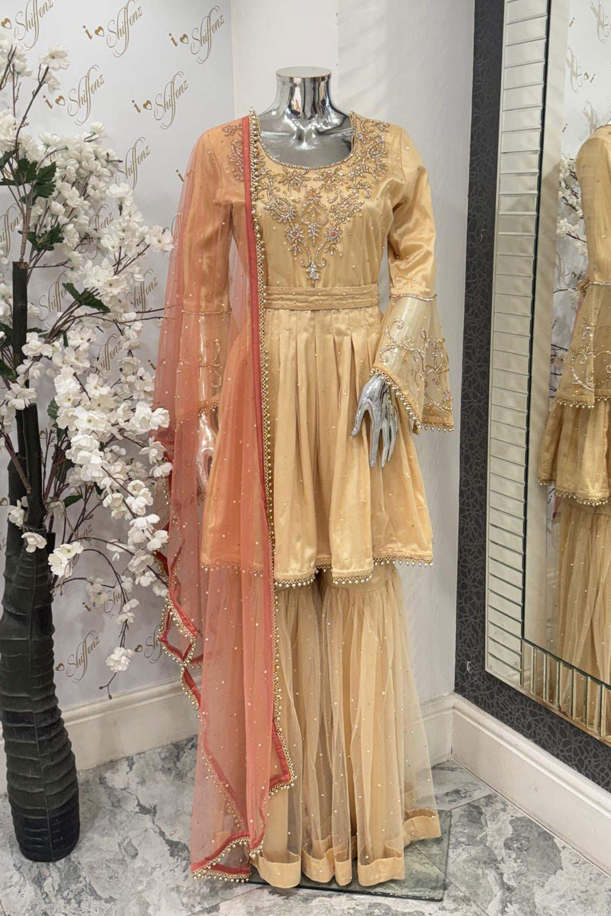 This beautiful 3 piece suit features a peplum anarkali shirt with luxury bead work embroidered neckline with scattered pearls throughout finished with dangling beads on the border. It comes with full length embroidered sleeves. Paired with an embellished gharara and the look is finished with a contrasted embroidered dupatta.