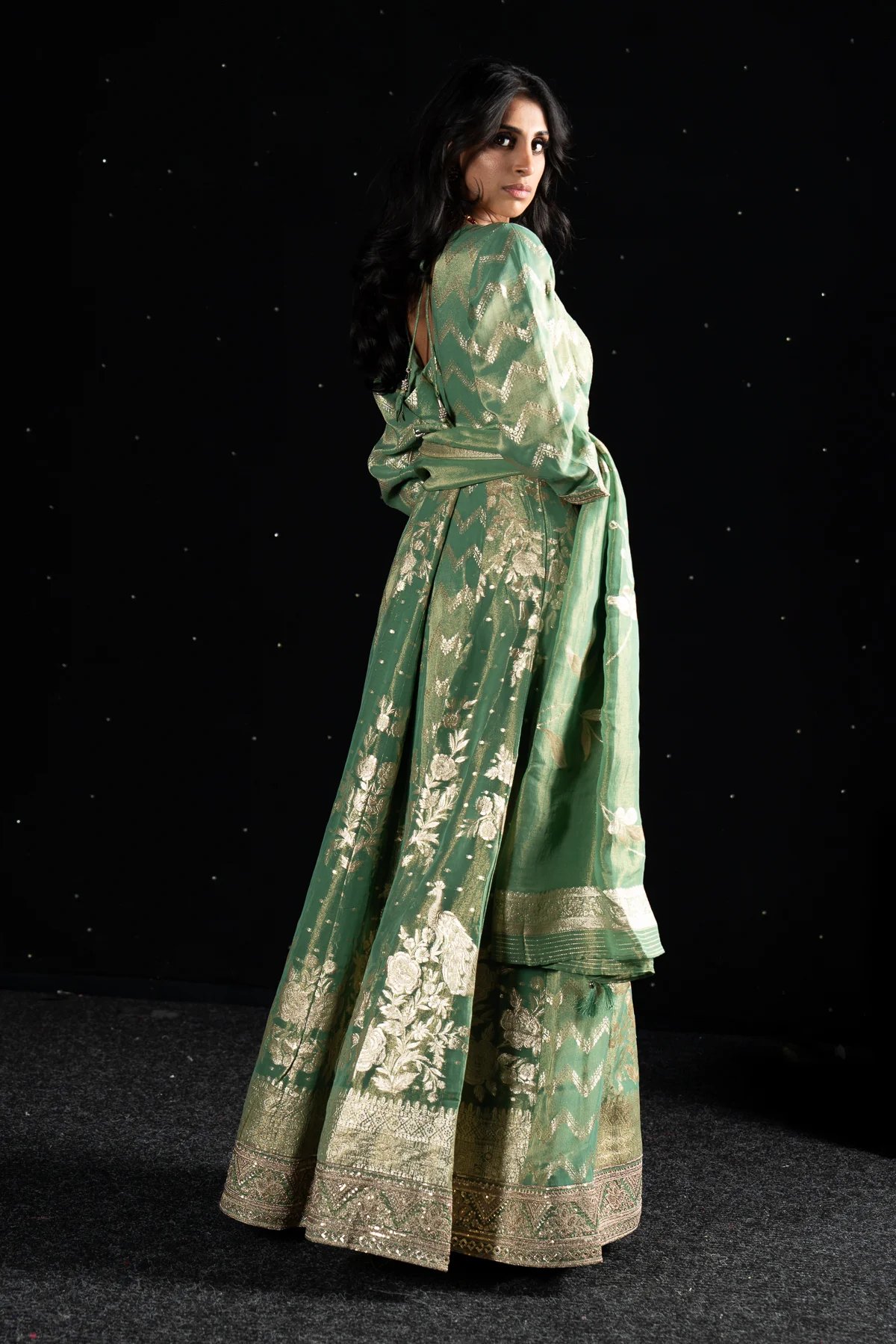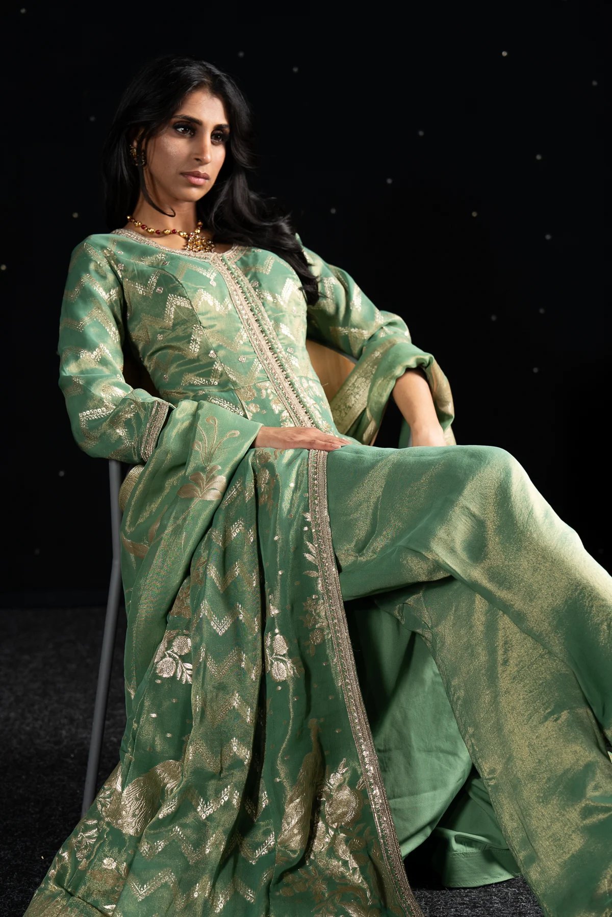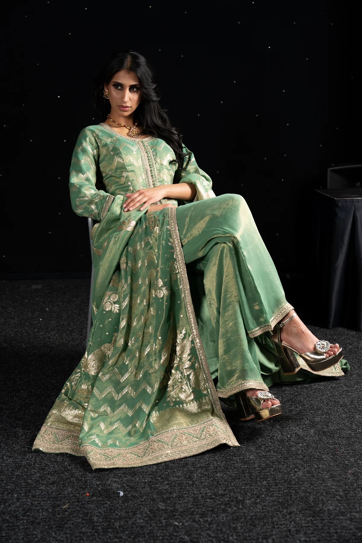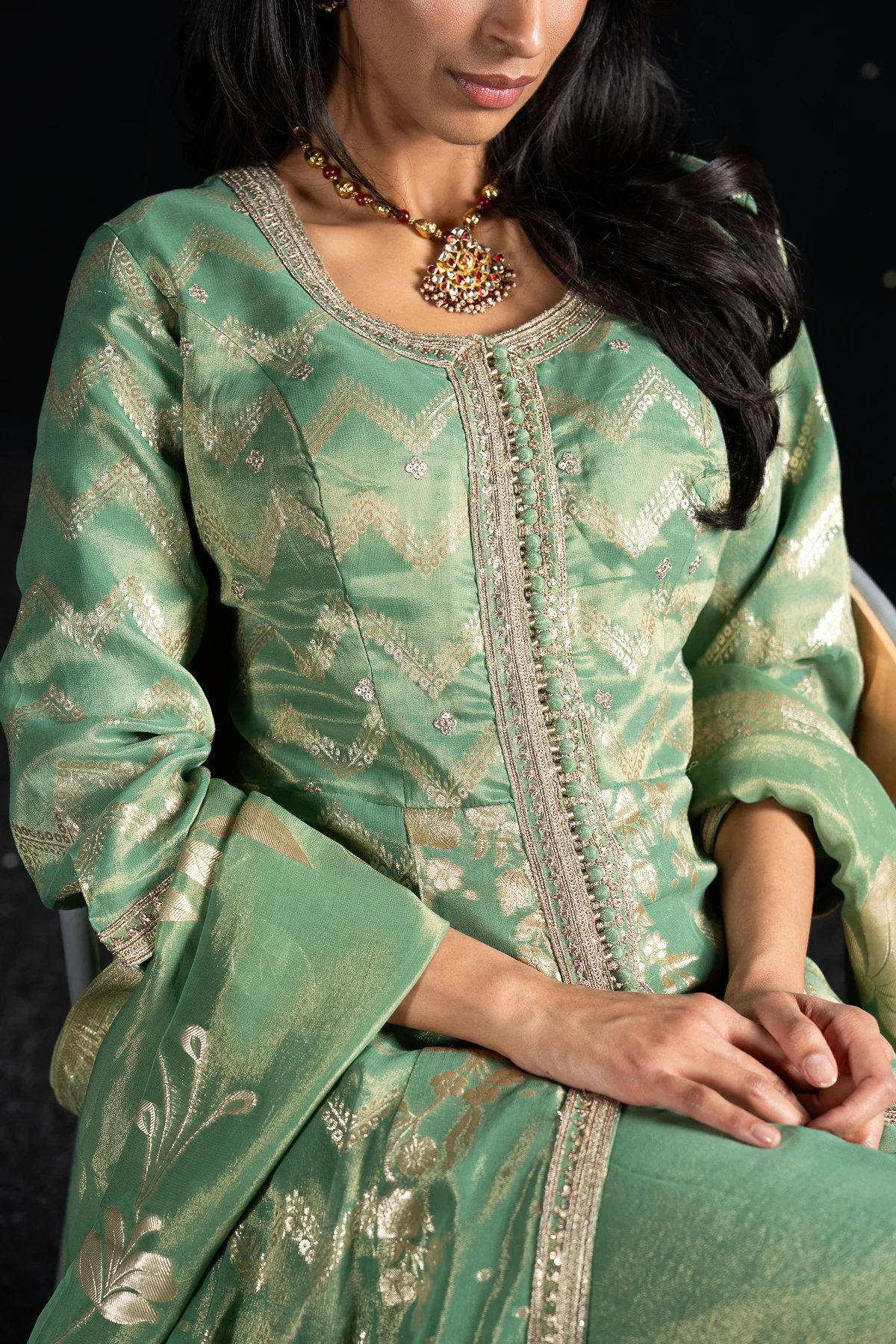 This beautiful 3 piece suit features a banarsi long dress with button embellishments on the front with a slit along the middle and deep back neckline with dori embellishment. Paired with massori (pure shimmer) straight leg trousers and the look is finished with a banarsi printed dupatta. Note: it comes with extra lining to attach on the deep back line.