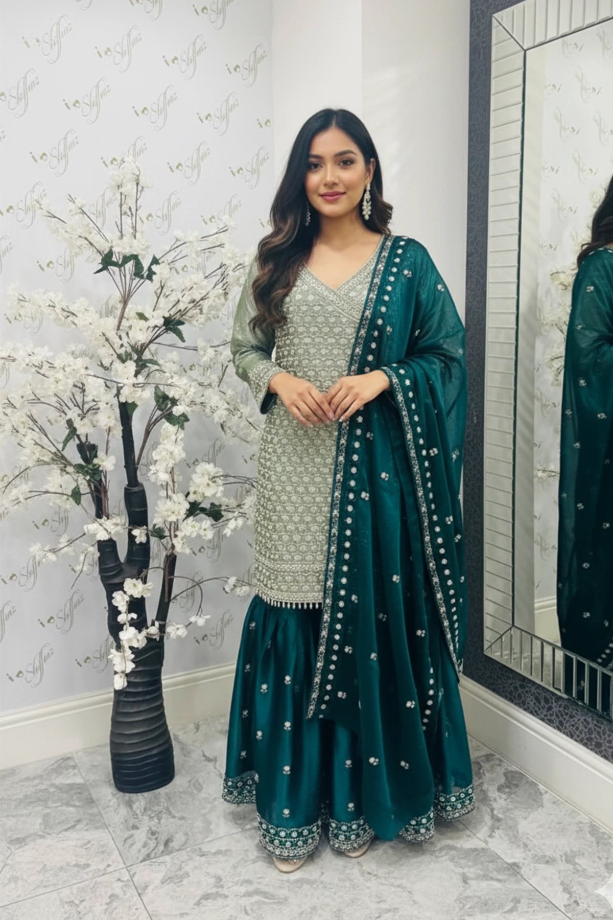 This beautiful 3 piece raw silk suit features an angrakha style shirt with thread work embroidery and silver diamantes throughout making it look luxury. Paired with a contrasted luxury embroidered raw silk gharara and an embroidered dupatta.