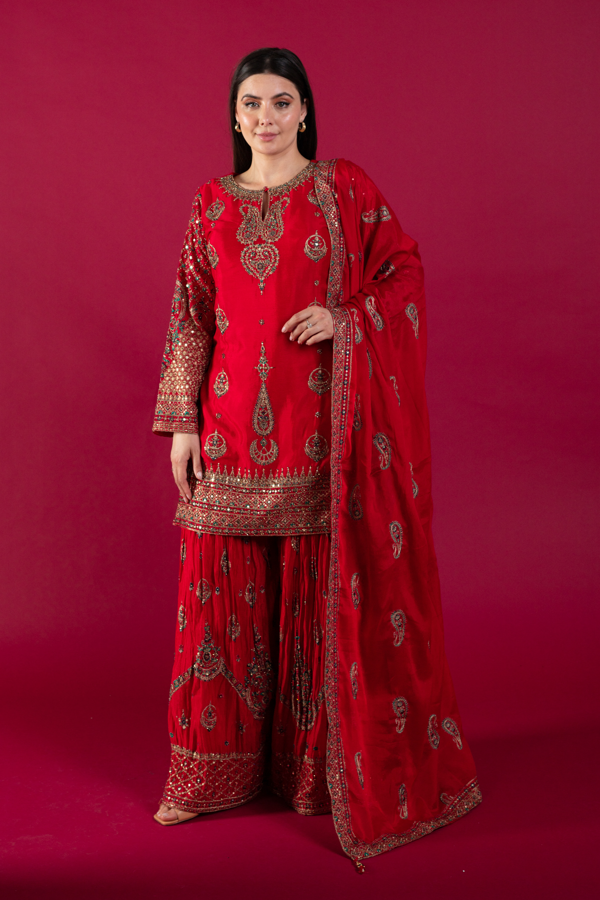 This beautiful 3 piece chiffon suit features a straight shirt with luxury bead work embroidery throughout with thread work embellishments, finished with full length embroidered sleeves. Paired with a luxury embroidered gharara and the look is finished with a chiffon embroidered dupatta.
