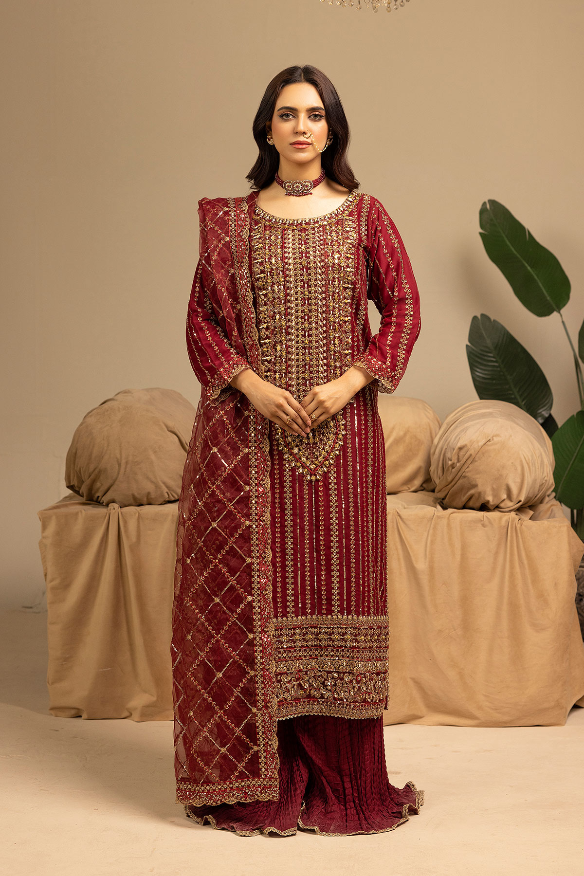 This beautiful Shiffonz 3 piece suit features a straight organza shirt with luxury thread work embroidery throughout with sequin and bead embellishments, finished with full length embroidered sleeves. Paired with crushed plazo trousers and the look is finished with a net embroidered dupatta.