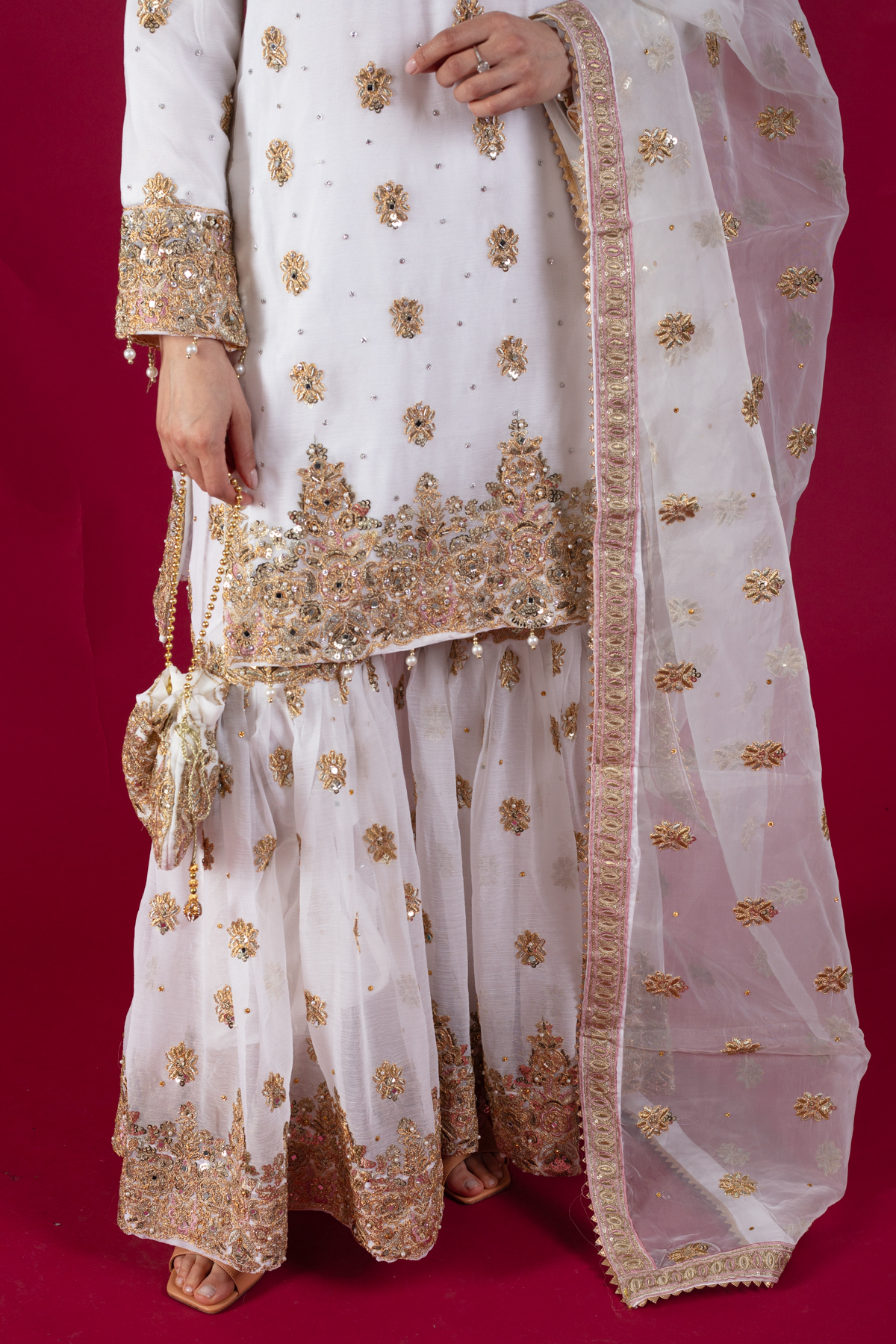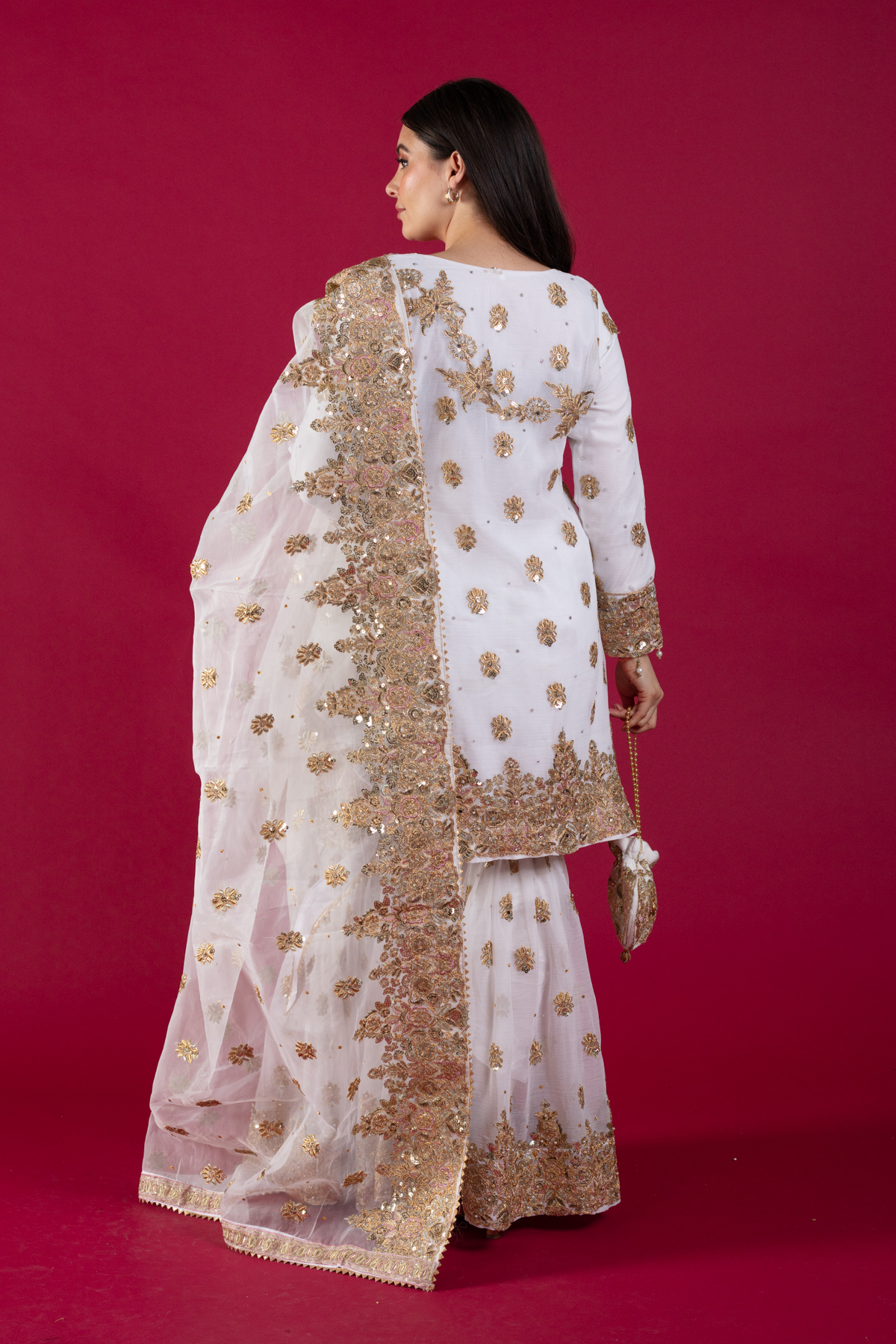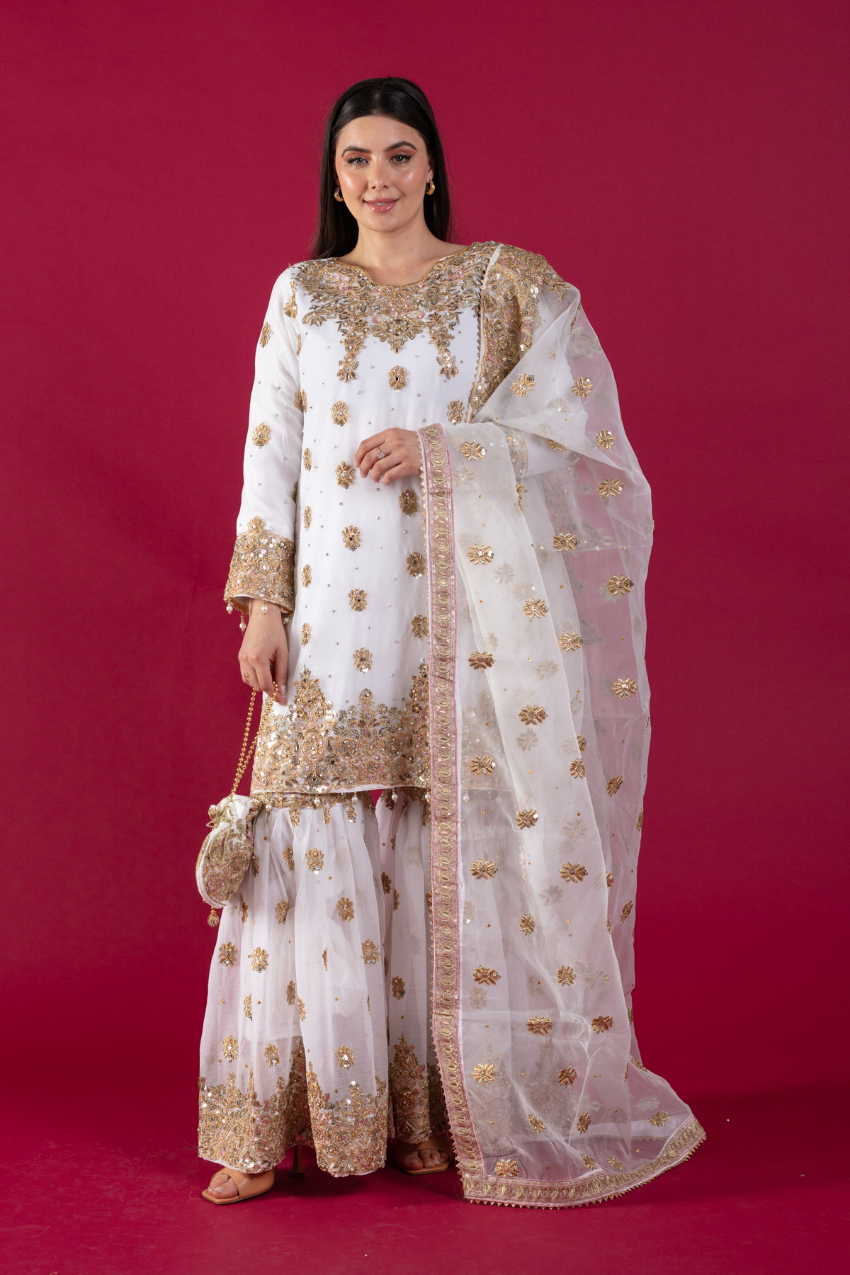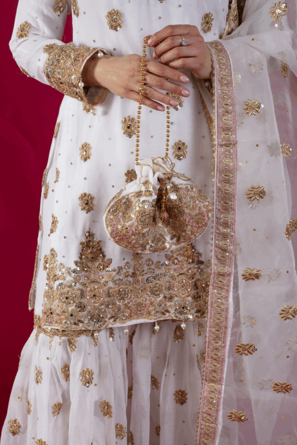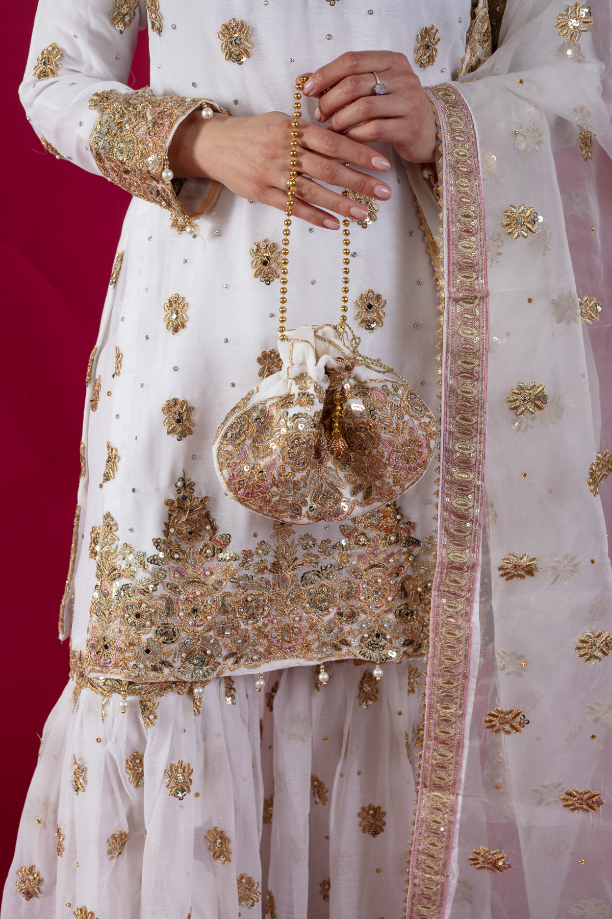 This beautiful 3 piece chiffon suit features a straight shirt with luxury dori work embroidery throughout with scattered mirror diamantés, finished with dangling beads on the border. It comes with full length embroidered sleeves and paired with an embroidered chiffon gharara. The look is finished with an embroidered organza dupatta. Potli bag is also included to enhance the look.