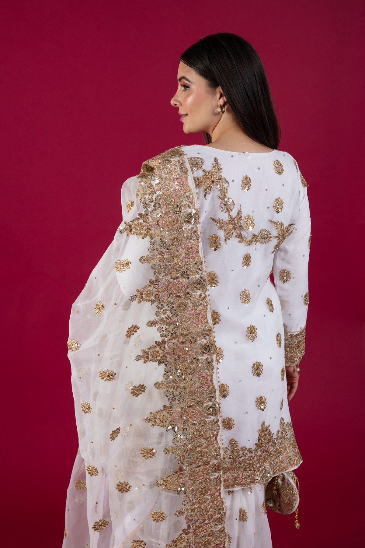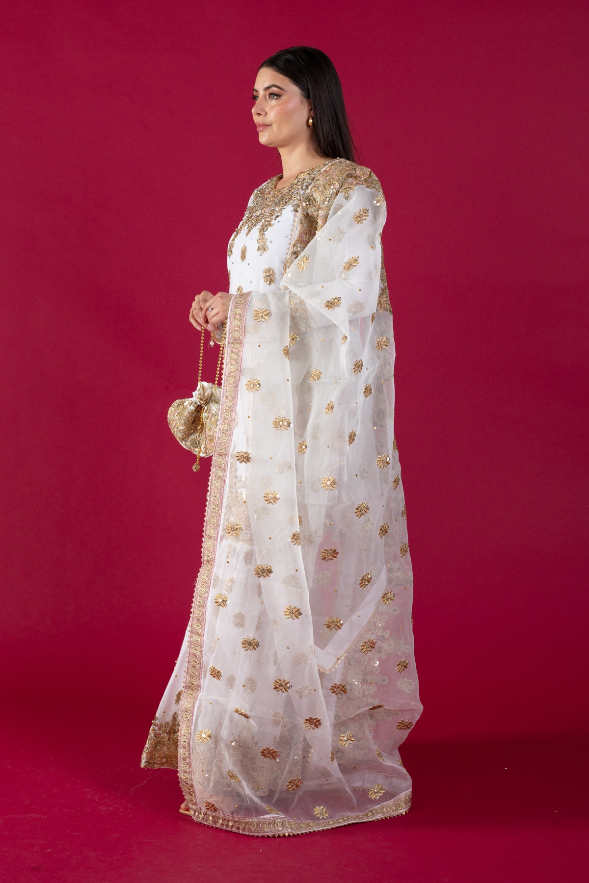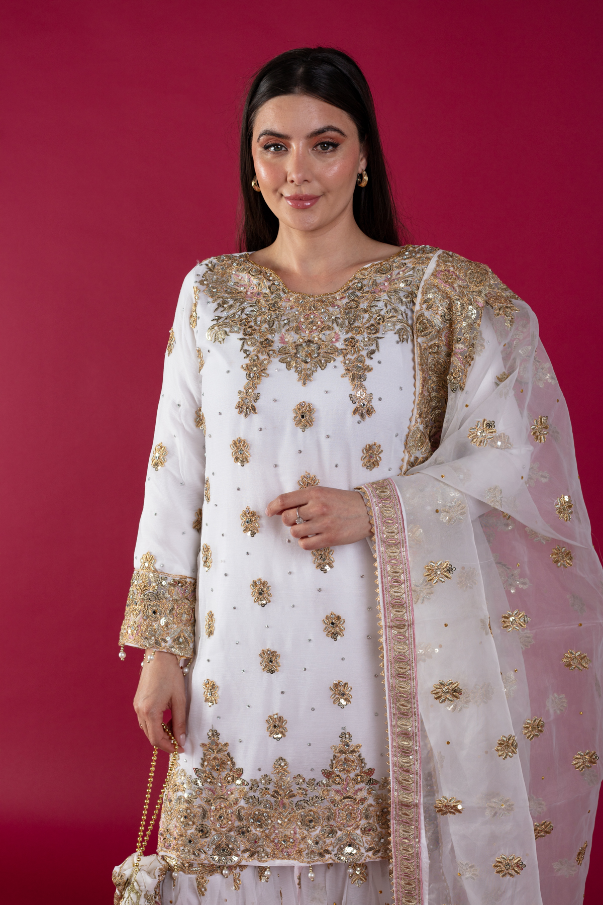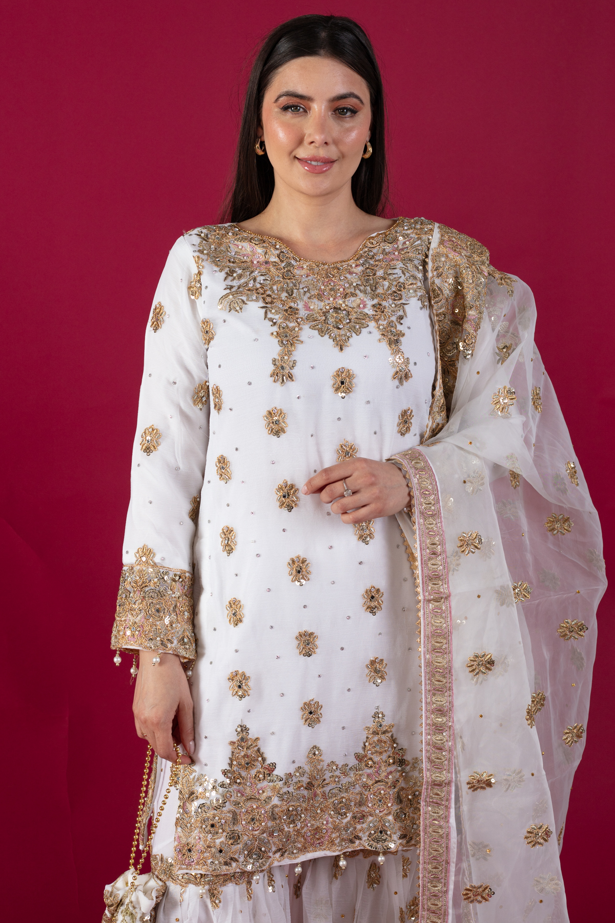 This beautiful 3 piece chiffon suit features a straight shirt with luxury dori work embroidery throughout with scattered mirror diamantés, finished with dangling beads on the border. It comes with full length embroidered sleeves and paired with an embroidered chiffon gharara. The look is finished with an embroidered organza dupatta. Potli bag is also included to enhance the look.
