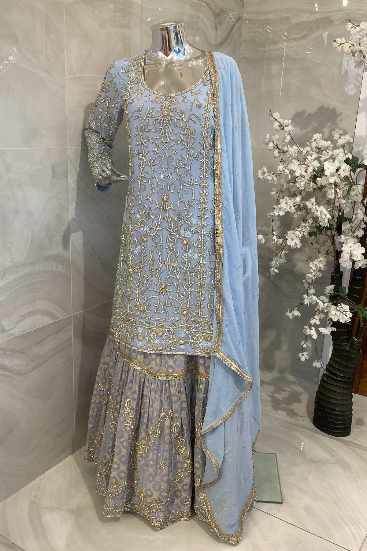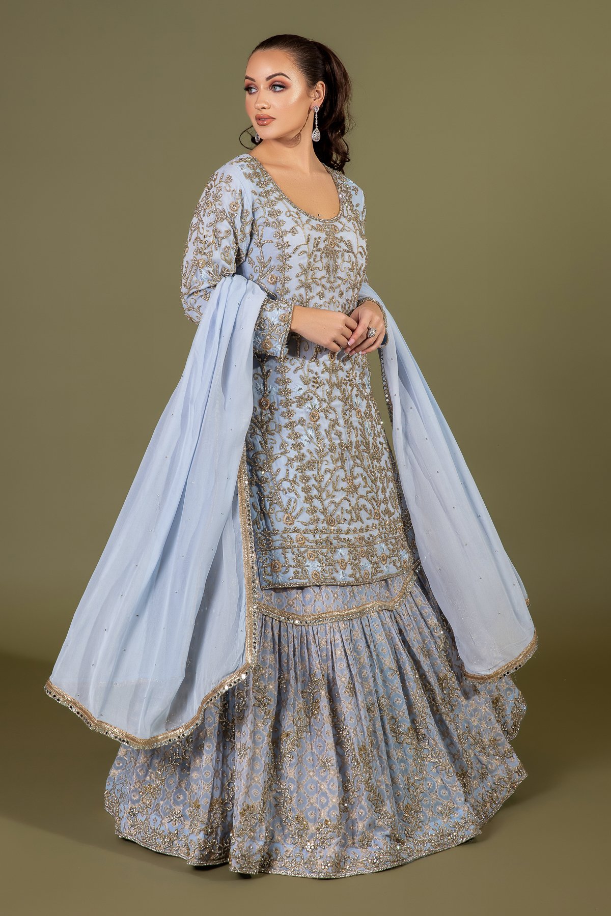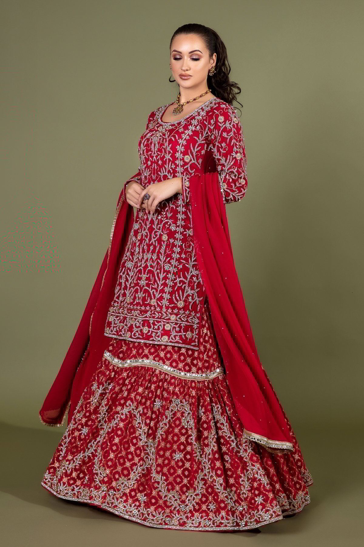 This beautiful 3 piece luxury lengha suit a straight shirt with luxury zari work embroidery throughout the front with full length embroidered sleeves. It comes with a luxury embroidered lengha and the look is finished with a chiffon dupatta.