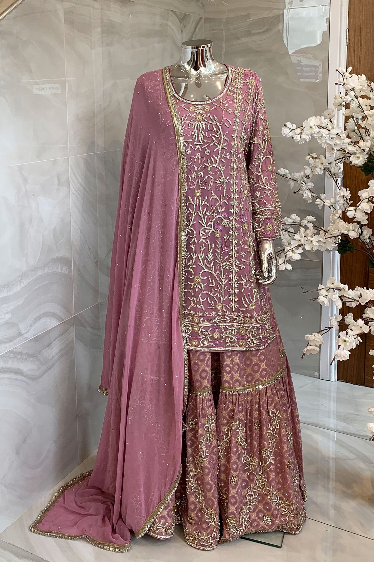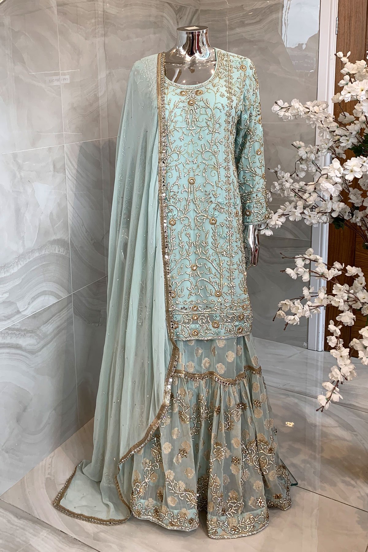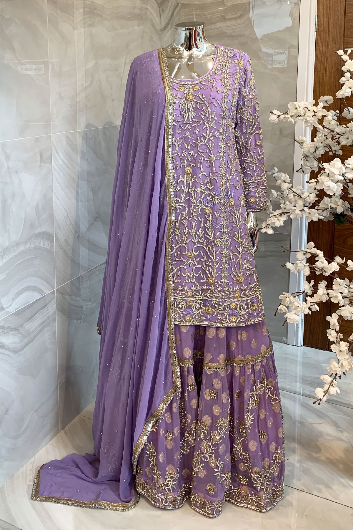 This beautiful 3 piece luxury lengha suit a straight shirt with luxury zari work embroidery throughout the front with full length embroidered sleeves. It comes with a luxury embroidered lengha and the look is finished with a chiffon dupatta.