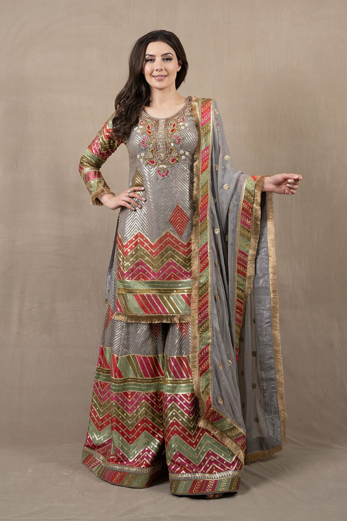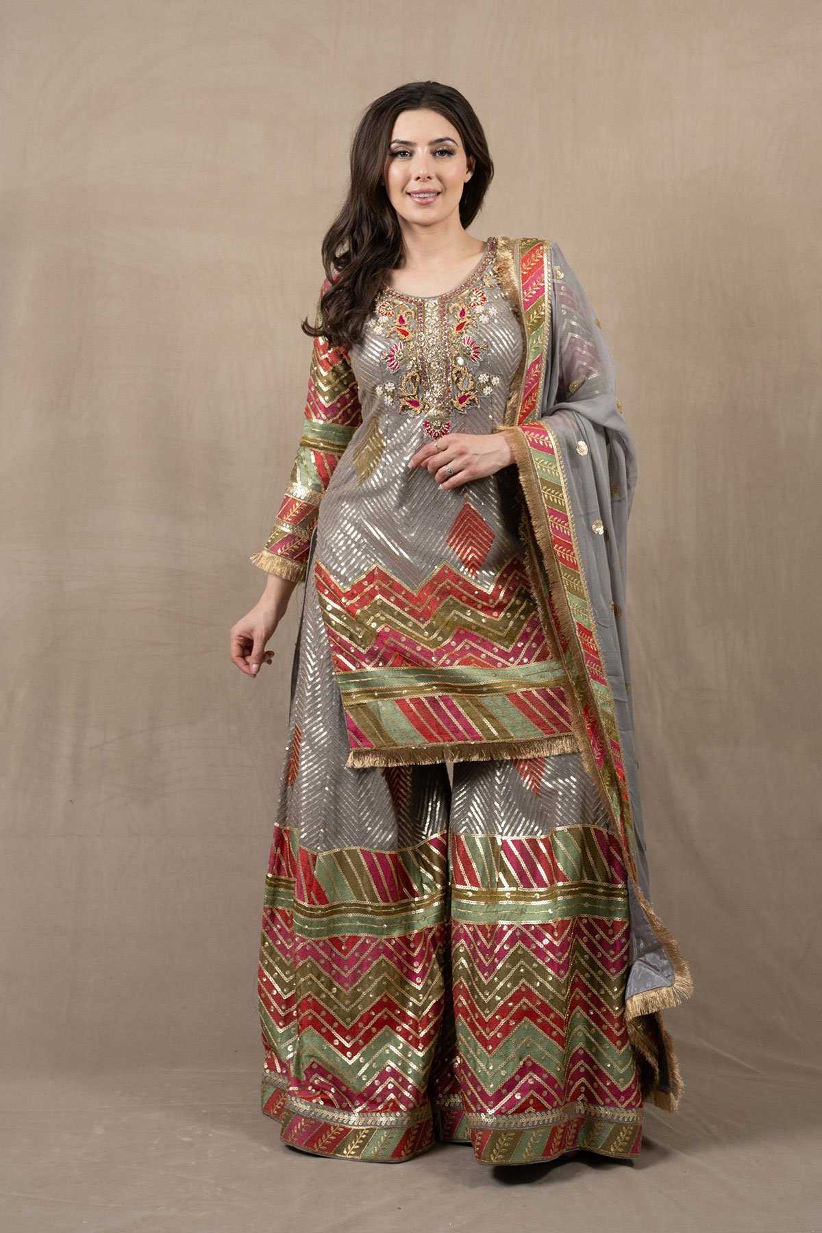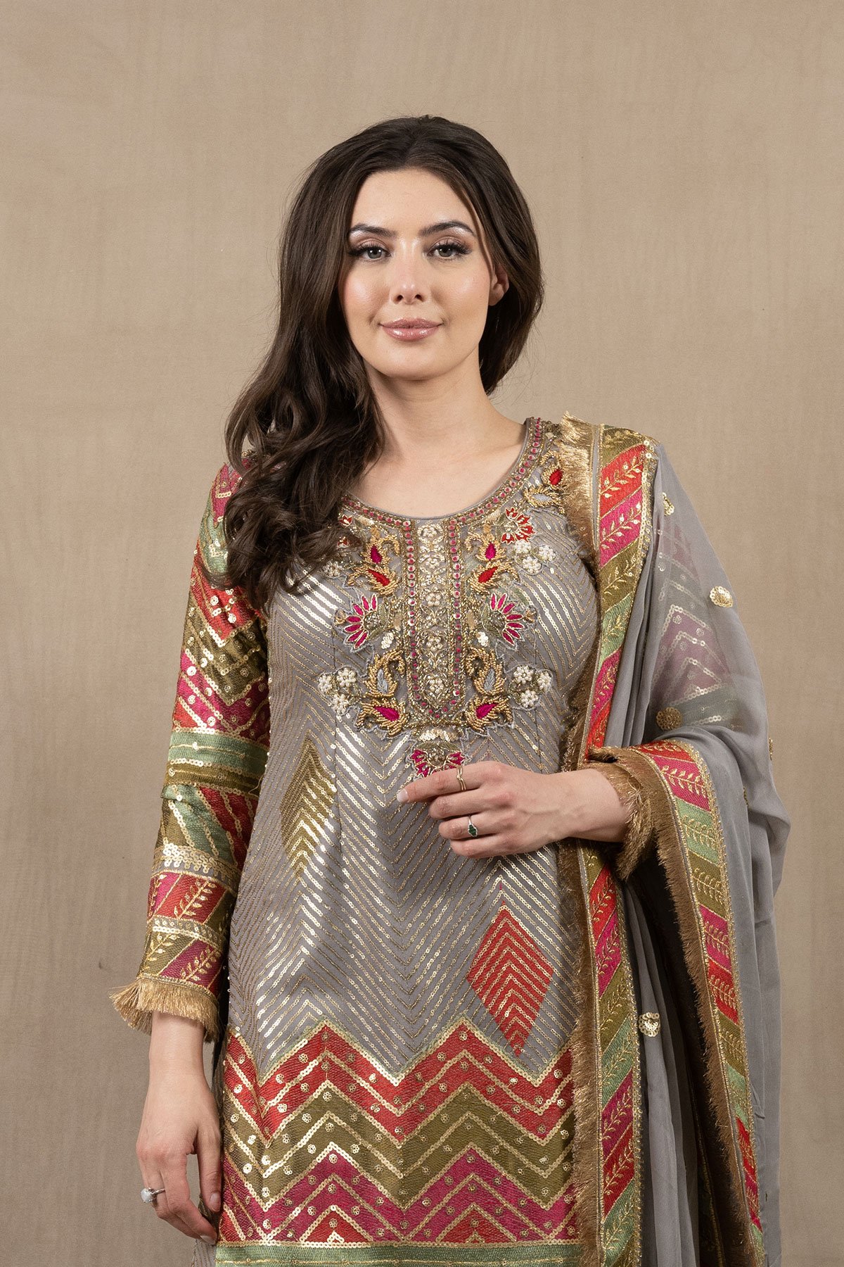 This beautiful 3 piece chiffon suit features a straight shirt with luxury thread and sequence work embroidery with luxury bead work embellishments on the front, finished with gold kiran on the border. It comes with full length embroidered sleeves and a luxury multi coloured embroidered sharara. The look is finished with a chiffon embroidered dupatta.