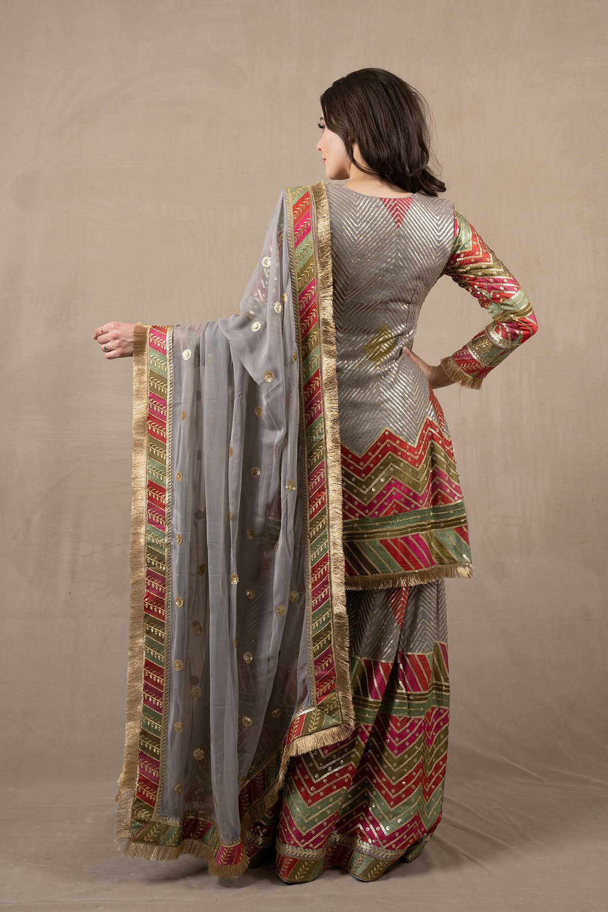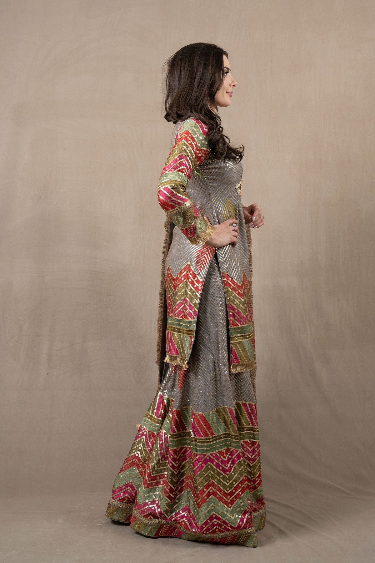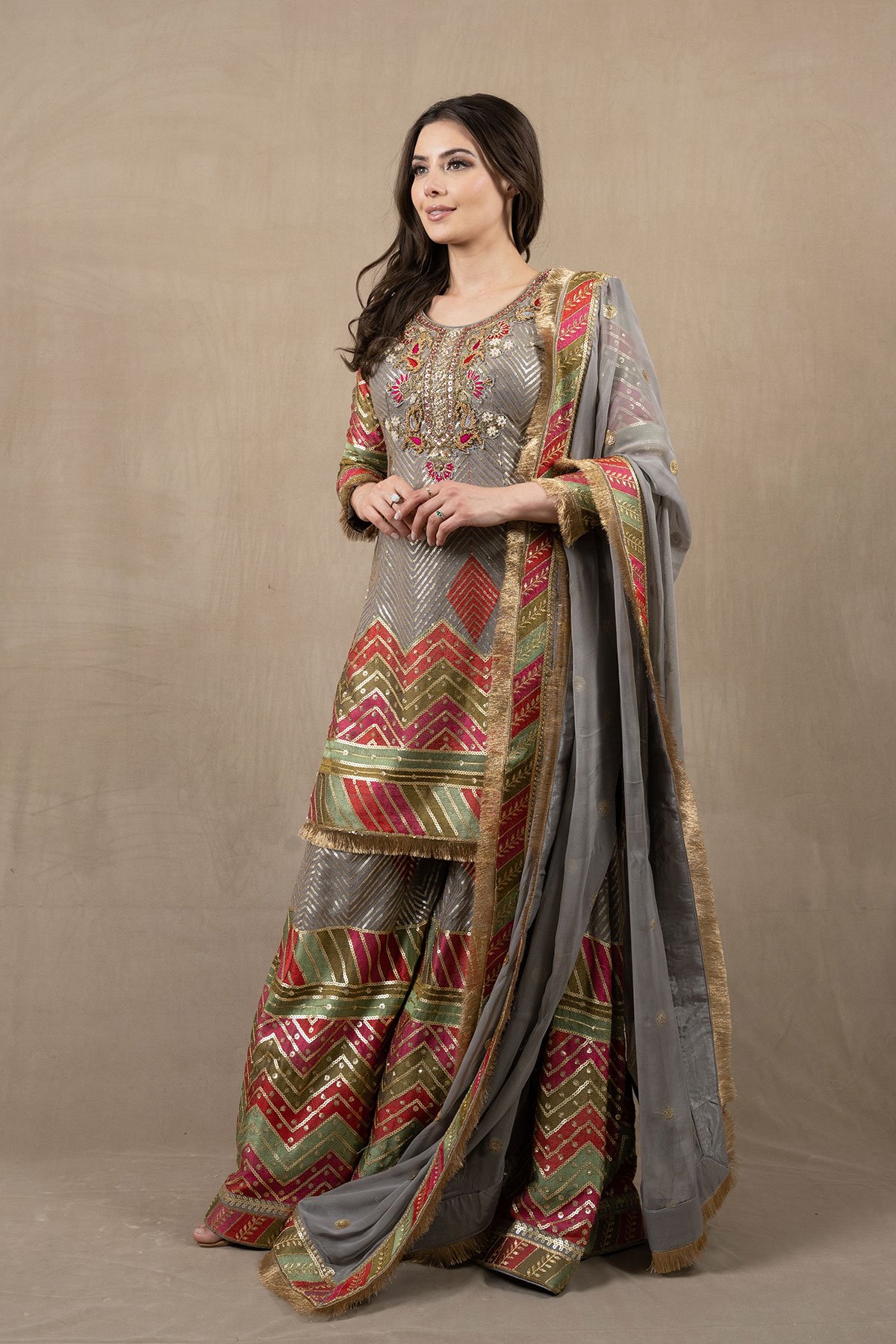This beautiful 3 piece chiffon suit features a straight shirt with luxury thread and sequence work embroidery with luxury bead work embellishments on the front, finished with gold kiran on the border. It comes with full length embroidered sleeves and a luxury multi coloured embroidered sharara. The look is finished with a chiffon embroidered dupatta.