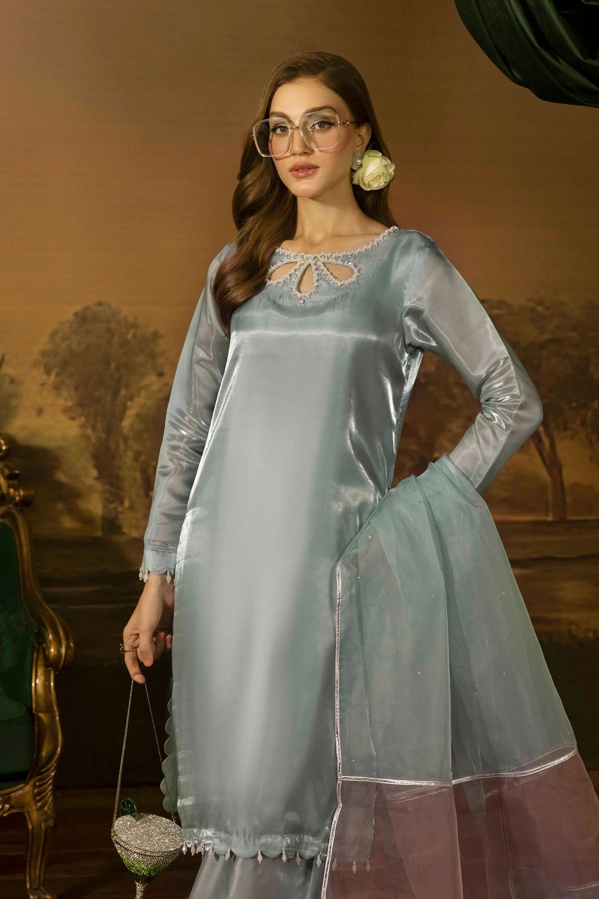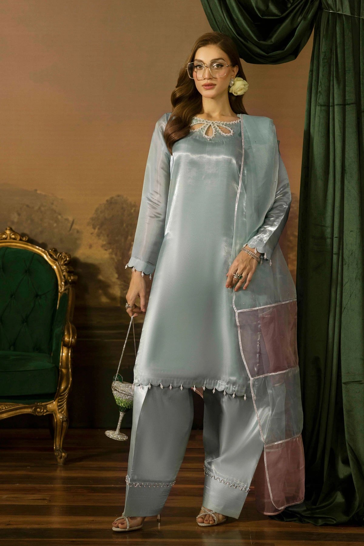 This beautiful 3 piece suit features a straight shirt with an embroidered neckline finished with full length sleeves with dangling beads on the cuffs and border. Paired with a plain farshi shalwar and the look is finished with an organza contrasted dupatta. Perfect casual festive collection for this Eid.