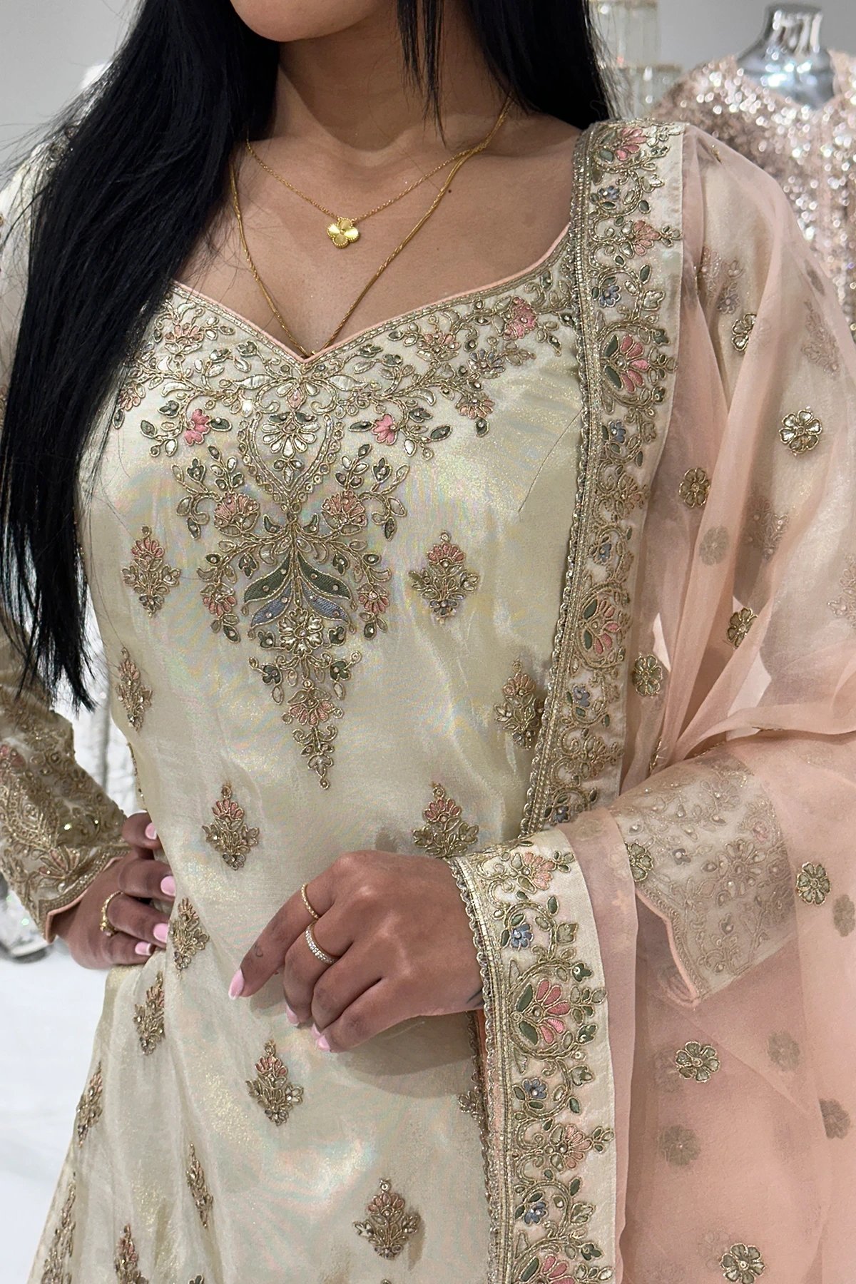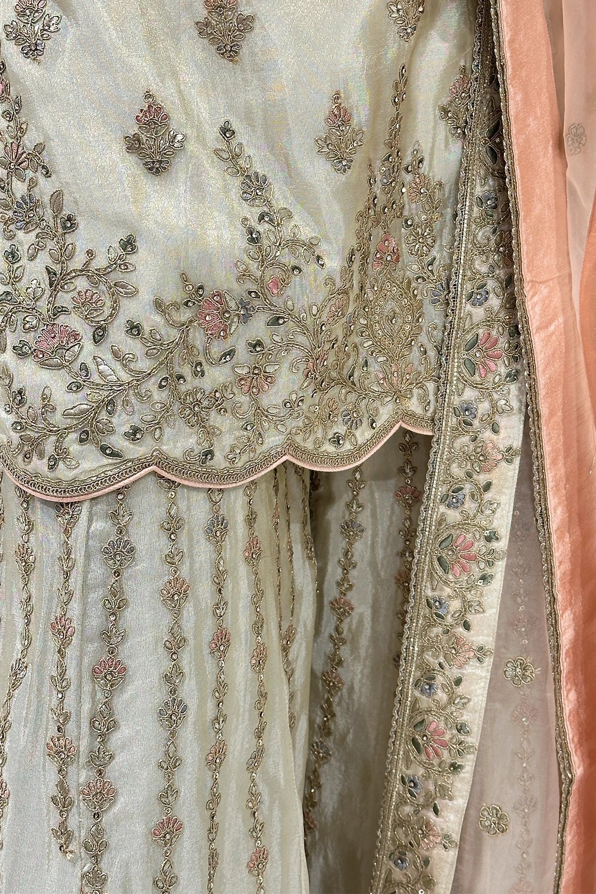 This beautiful 3 piece suit in the shimmer silk overlay features a straight shirt with luxury dori work embroidery with motif and diamantés embellishments throughout the front, back and full length sleeves. Paired with an embroidered sharara and the look is finished with a contrasted organza embroidered dupatta.