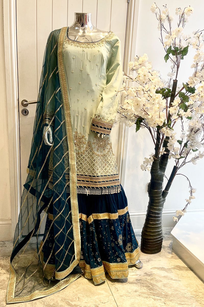 This beautiful 3 piece chiffon suit features a straight shirt with luxury thread and beaded embroidery throughout the front, finished with luxury dangling tassels from the border. It comes with full length embroidered sleeves with banarsi piping on the cuffs. It comes with a luxury embroidered gharara and the look is finished with a net embroidered dupatta.