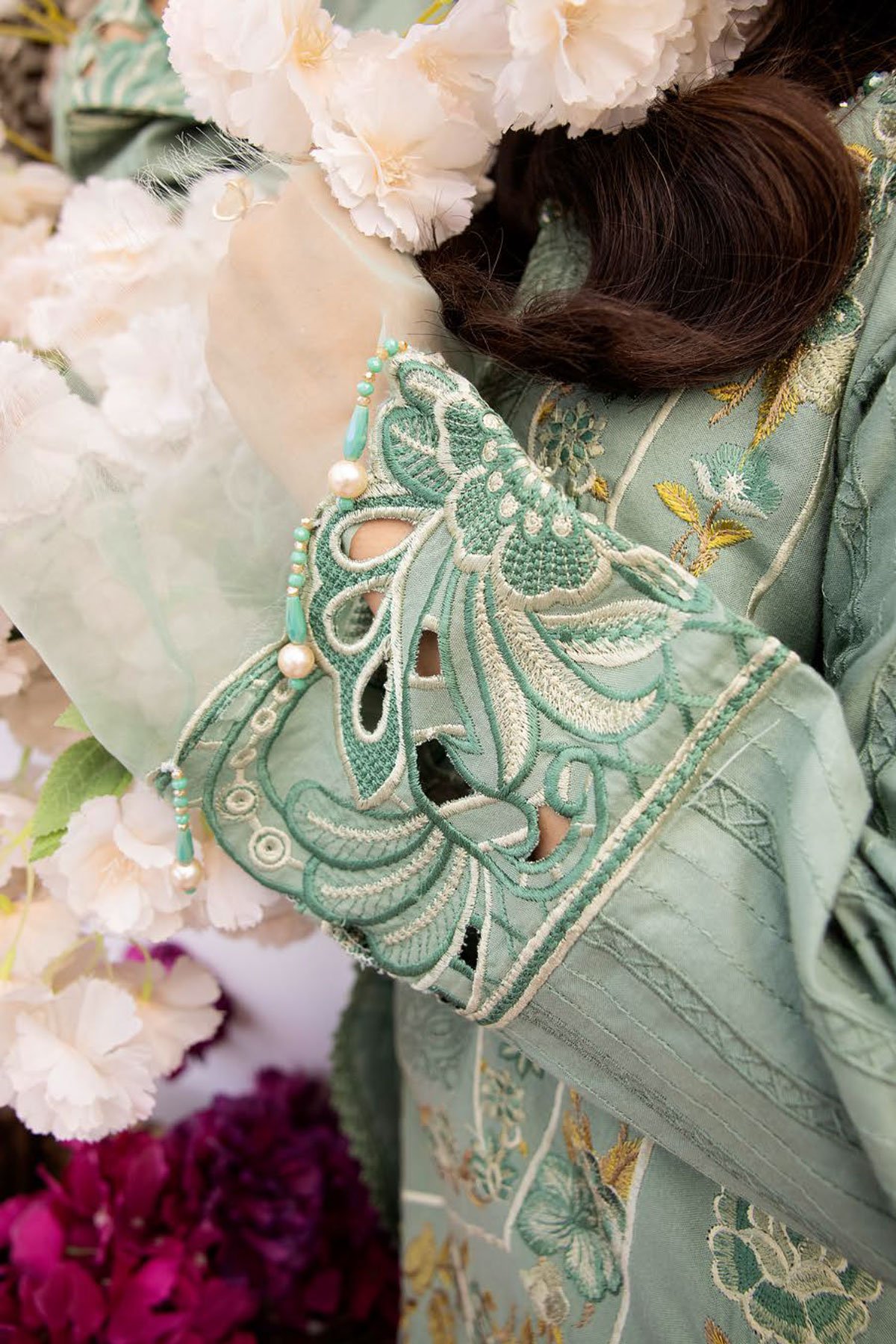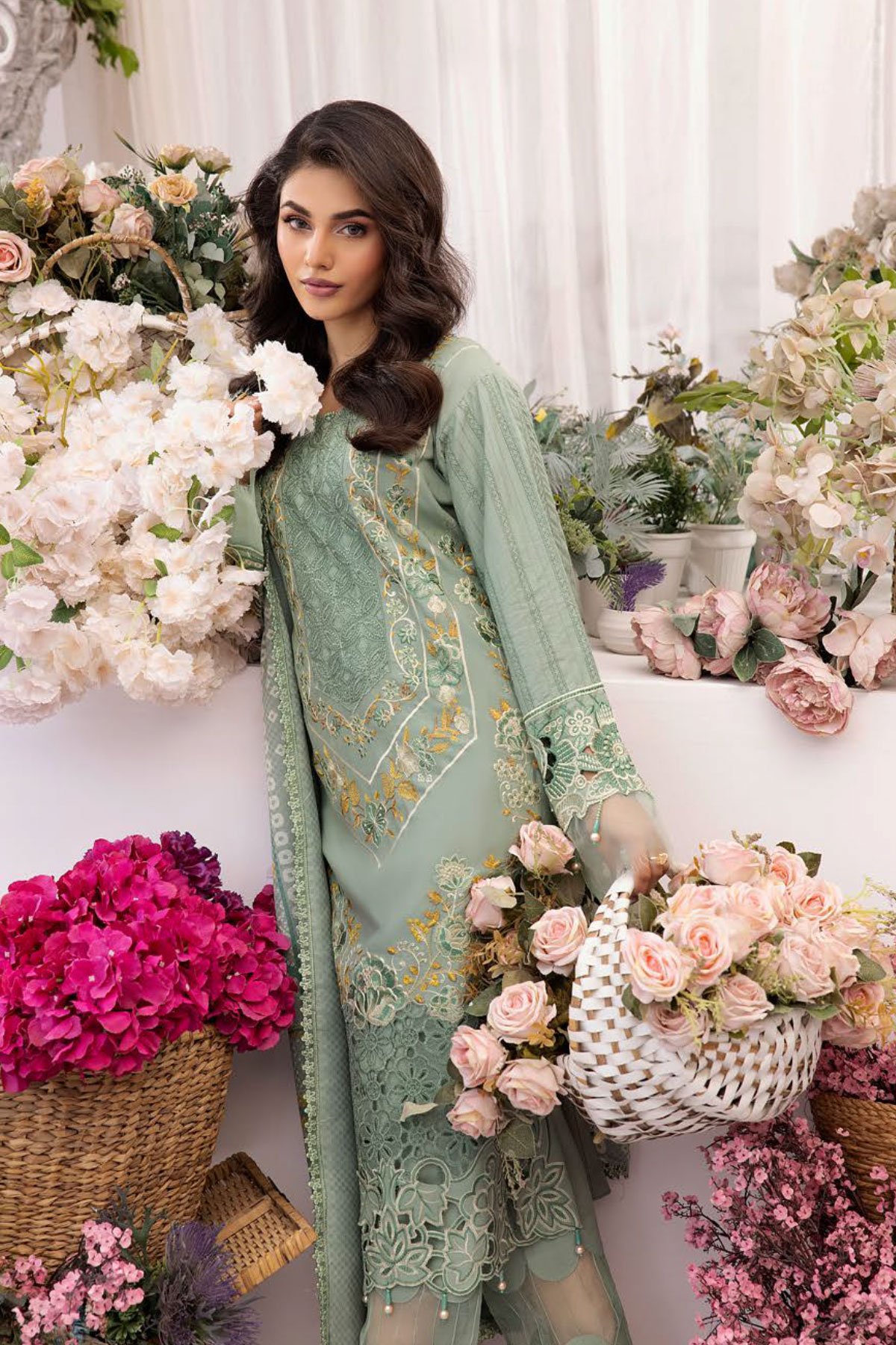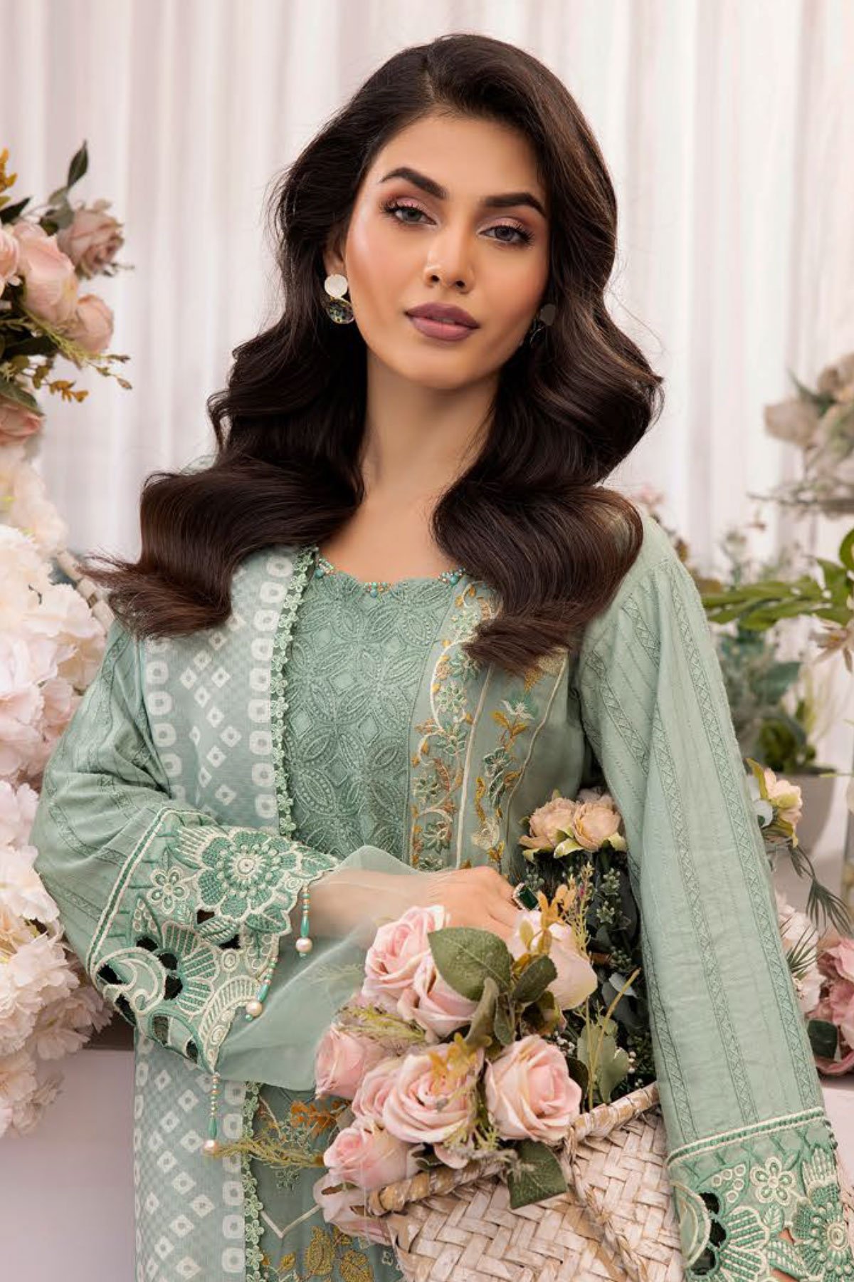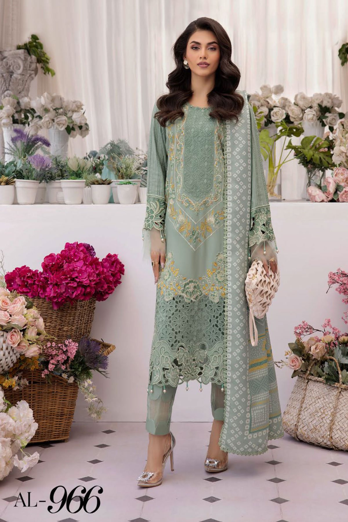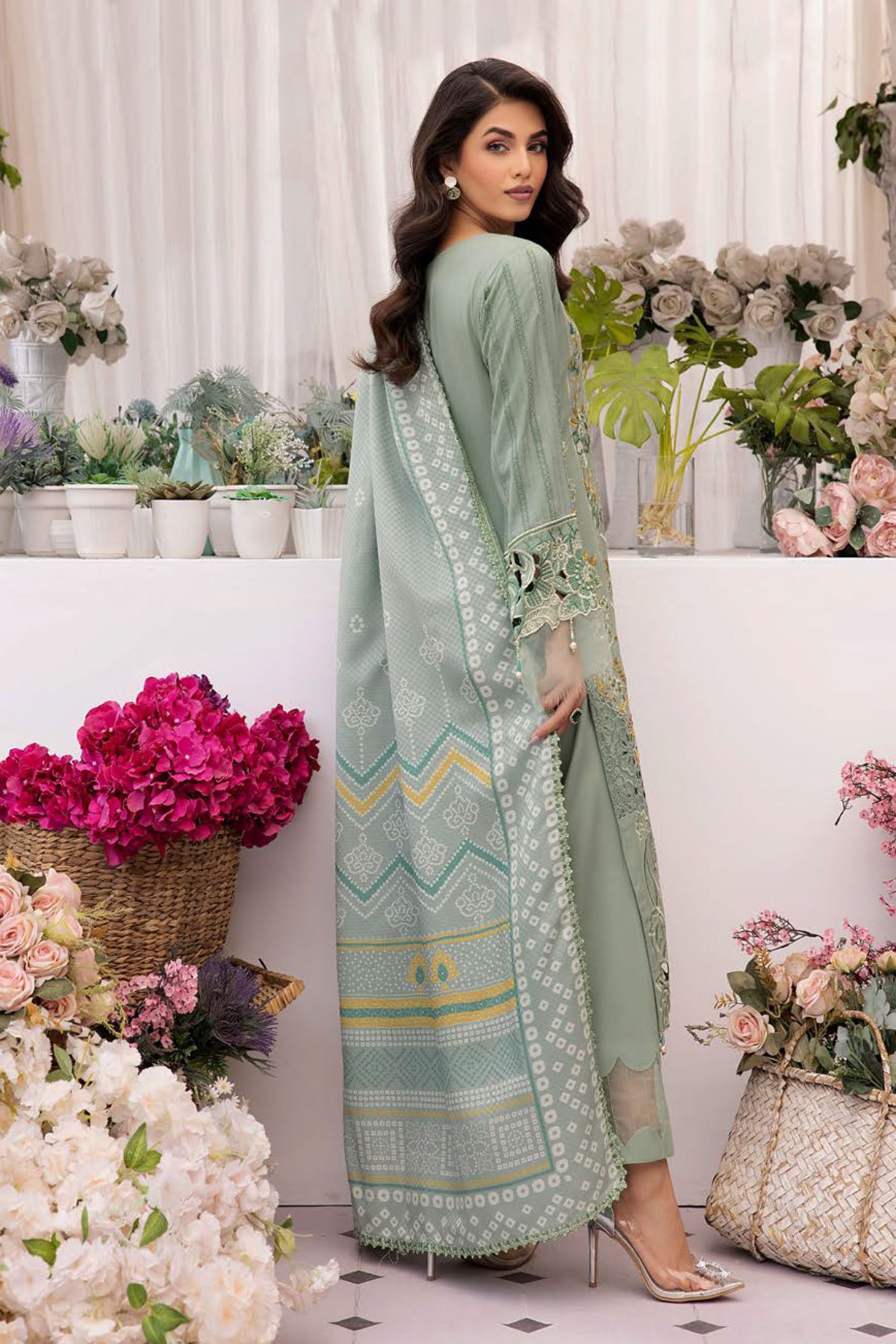 This beautiful luxury linen collection 3 piece suit features a straight shirt with luxury thread work embroidered front, finished with a chikankari border with dangling beads. It comes with full length embroidered sleeves and straight leg trousers. The look is finished with a linen printed dupatta. Perfect seasonal collection for this winter.