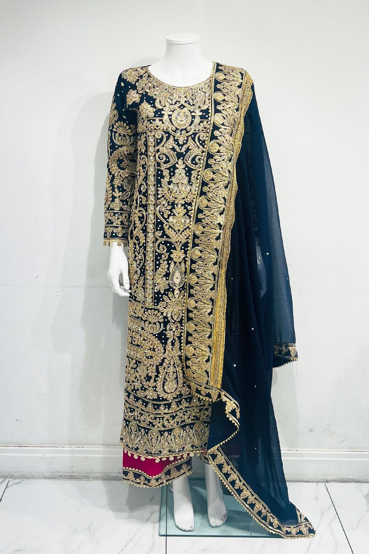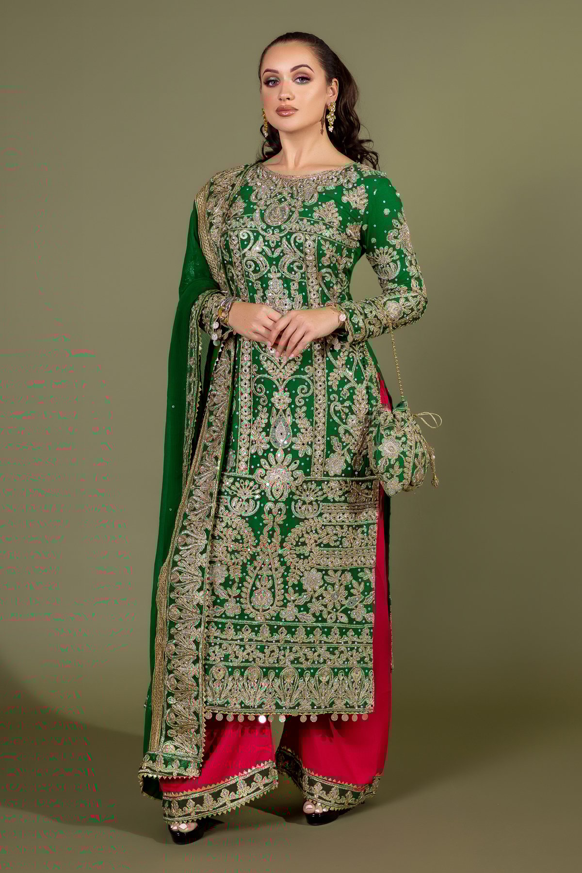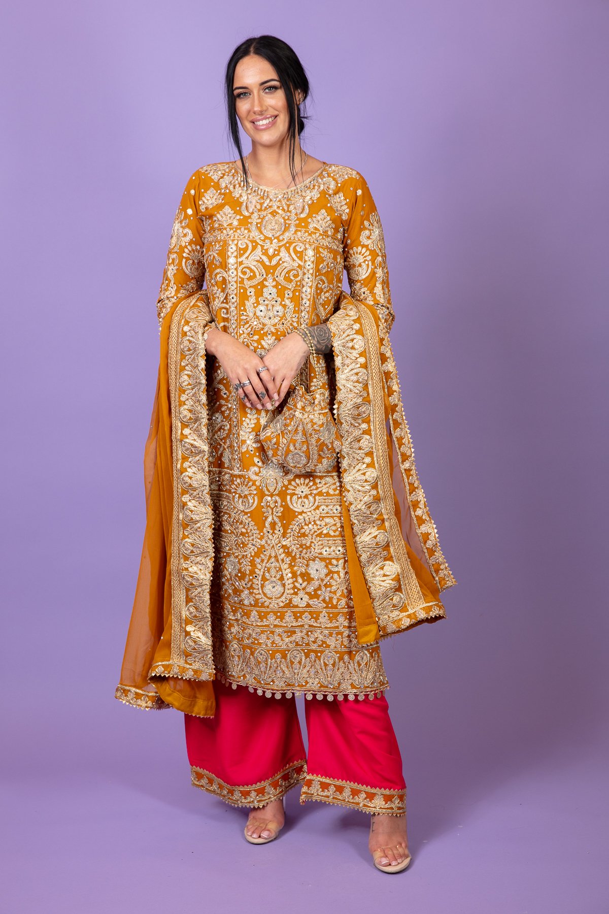 This beautiful 3 piece Shiffonz mehndi collection features a straight long length shirt with luxury dori work embroidery along with scattered diamanté’s throughout, finished with coin gold tassels on the border and full length embroidered sleeves. It comes with wide leg plazo contrasted trousers and the look is finished with a chiffon dupatta. A potli bag is also included. Note: The colour of the trousers may vary within sizes.