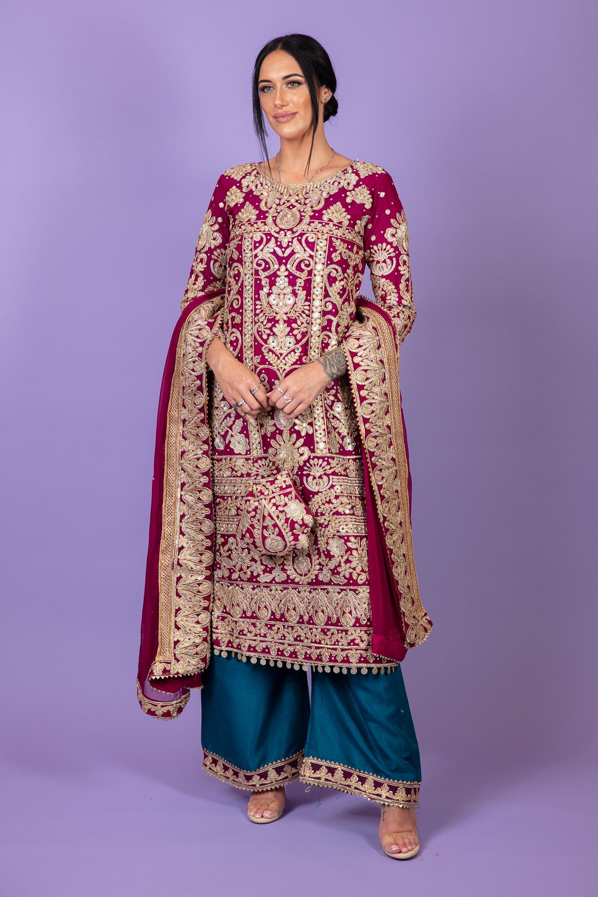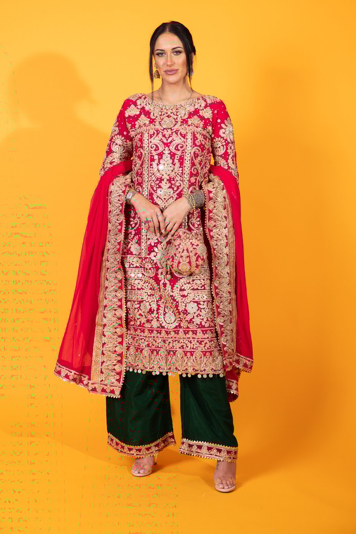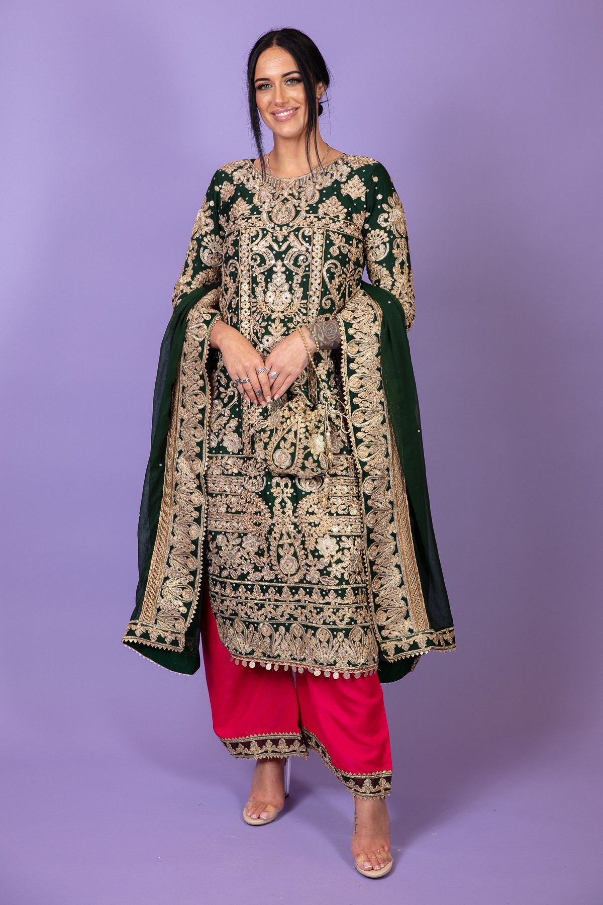 This beautiful 3 piece Shiffonz mehndi collection features a straight long length shirt with luxury dori work embroidery along with scattered diamanté’s throughout, finished with coin gold tassels on the border and full length embroidered sleeves. It comes with wide leg plazo contrasted trousers and the look is finished with a chiffon dupatta. A potli bag is also included. Note: The colour of the trousers may vary within sizes.
