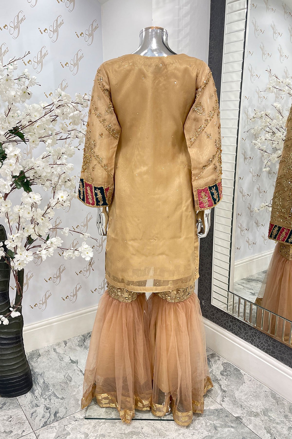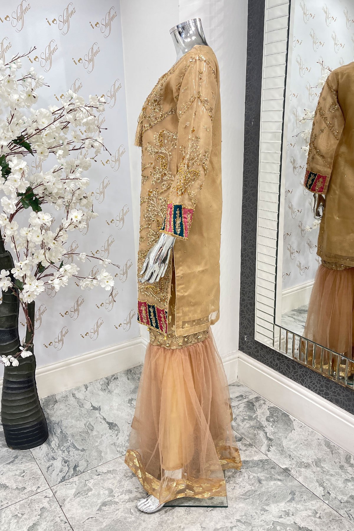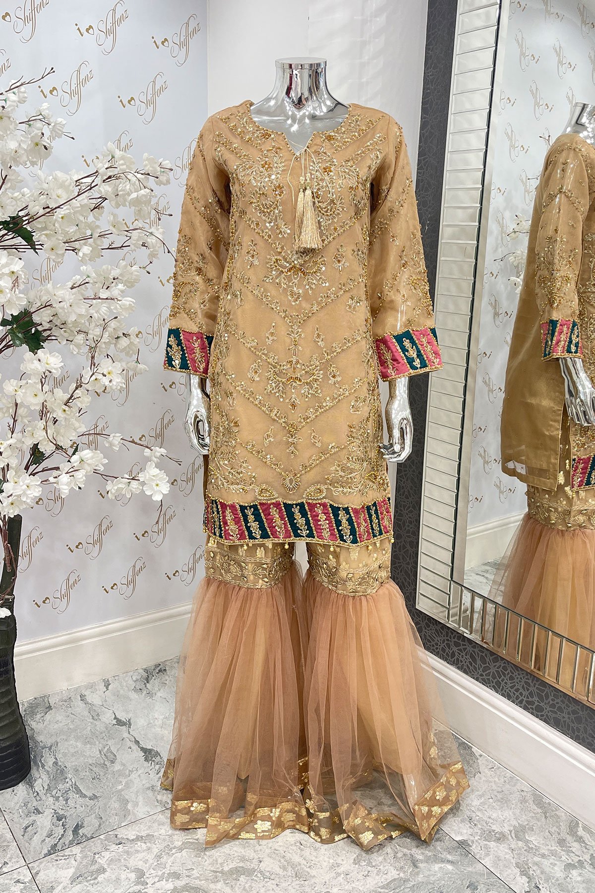 This beautiful Shiffonz organza suit features a straight shirt with luxury thread and sequence embroidery through out the front with dori embellishments on the neckline, finished with a coloured embroidered border with dangling beads. It comes with full length embroidered sleeves and a net gold gharara. The look is finished with a gold organza dupatta with a printed border.