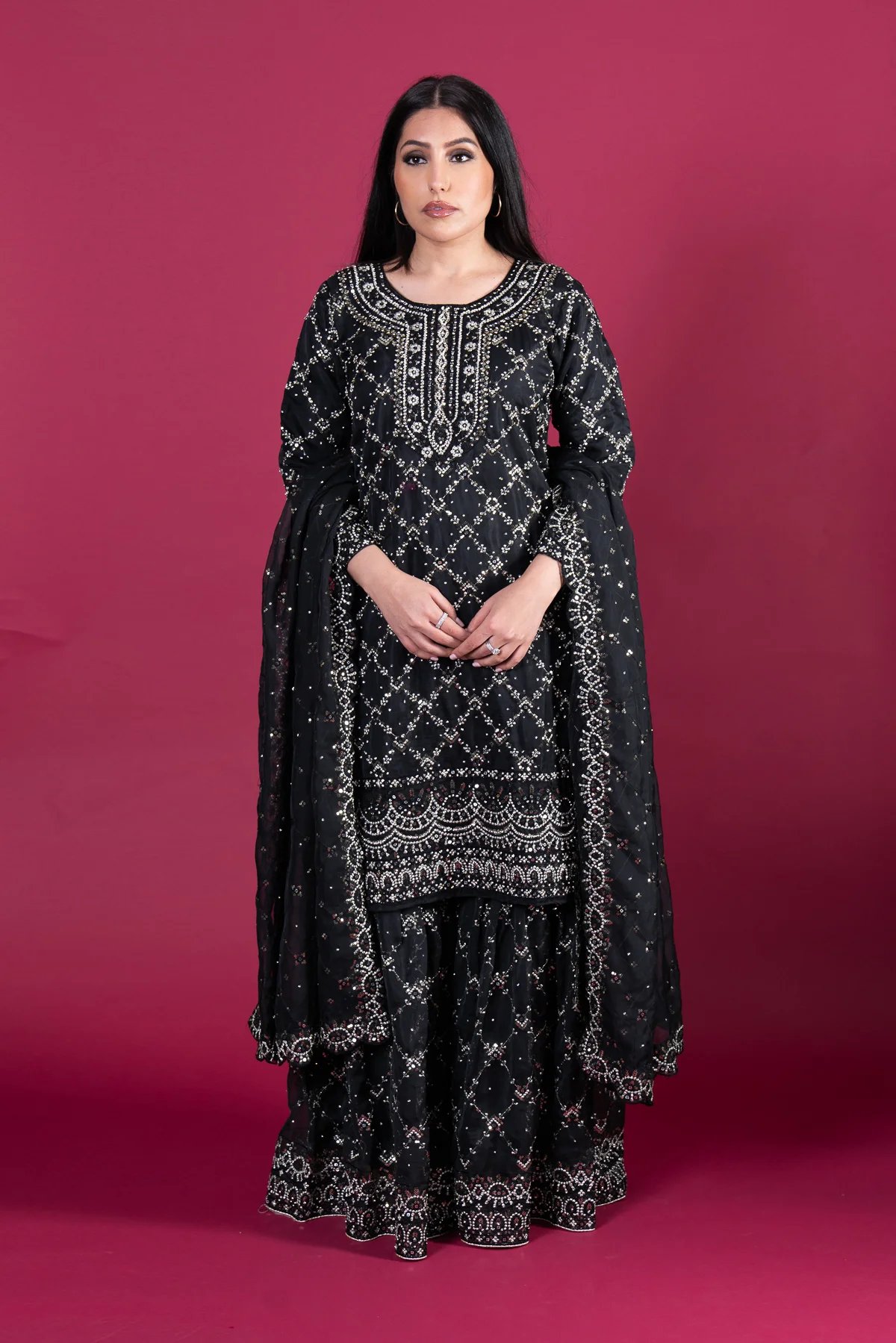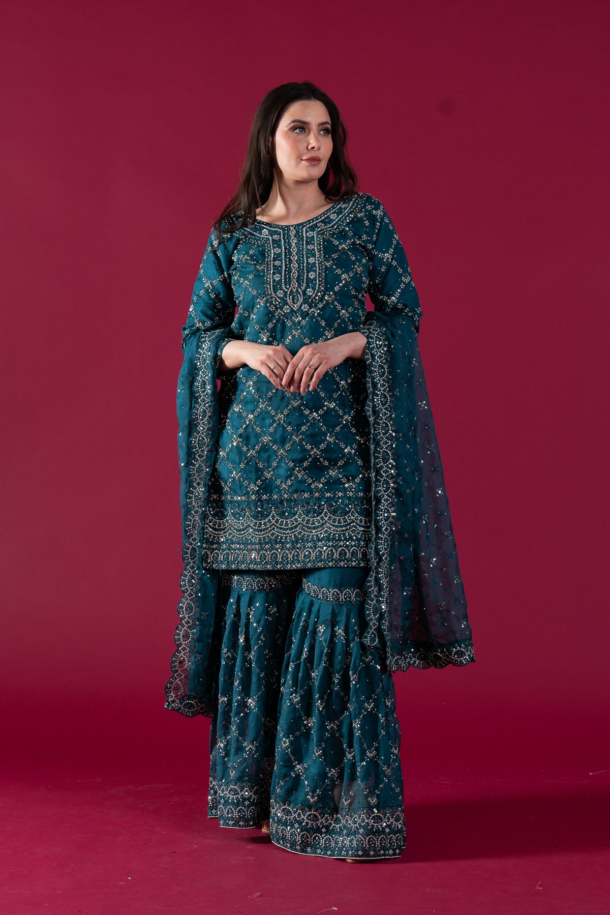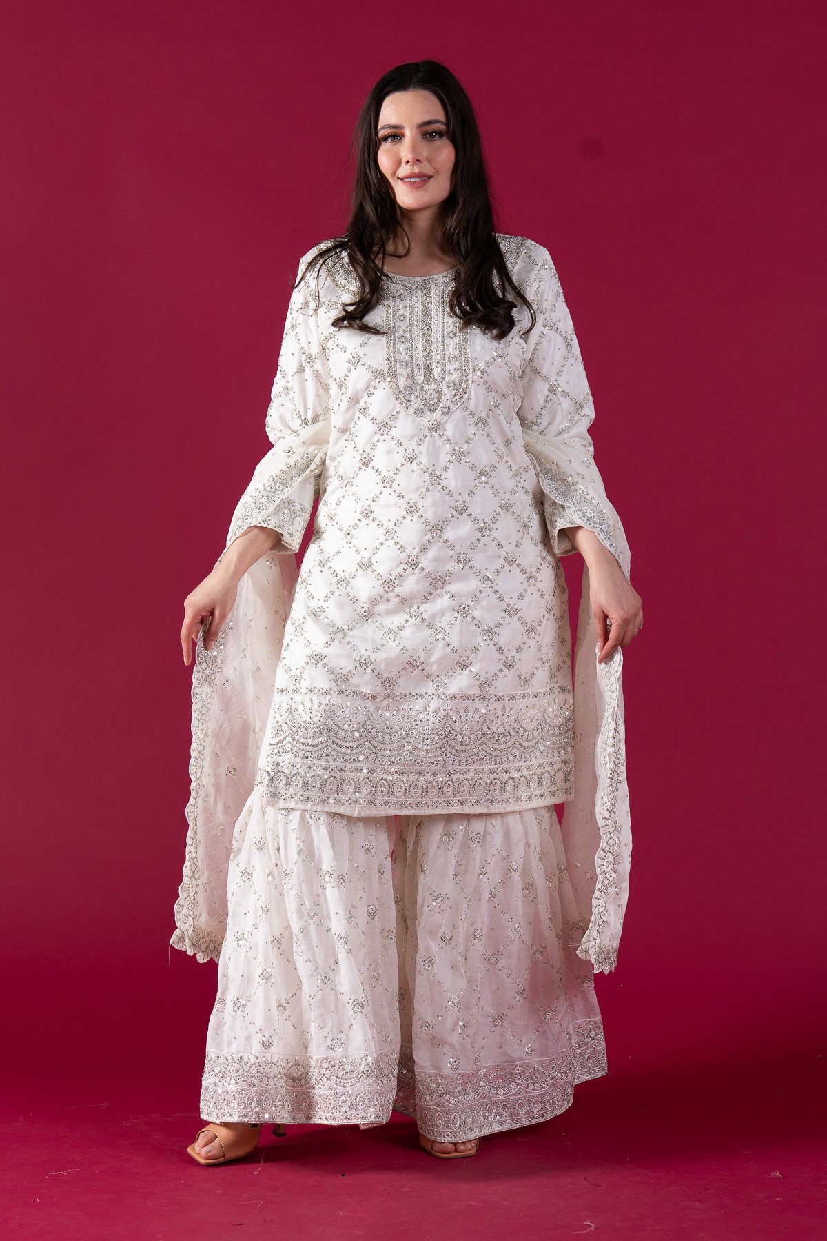 This beautiful 3 piece suit features a soft organza straight shirt with luxury thread work embroidery with silver scattered diamantés, finished with full length sleeves. Paired with and embroidered organza gharara and the look is finished with a soft organza embroidered dupatta.