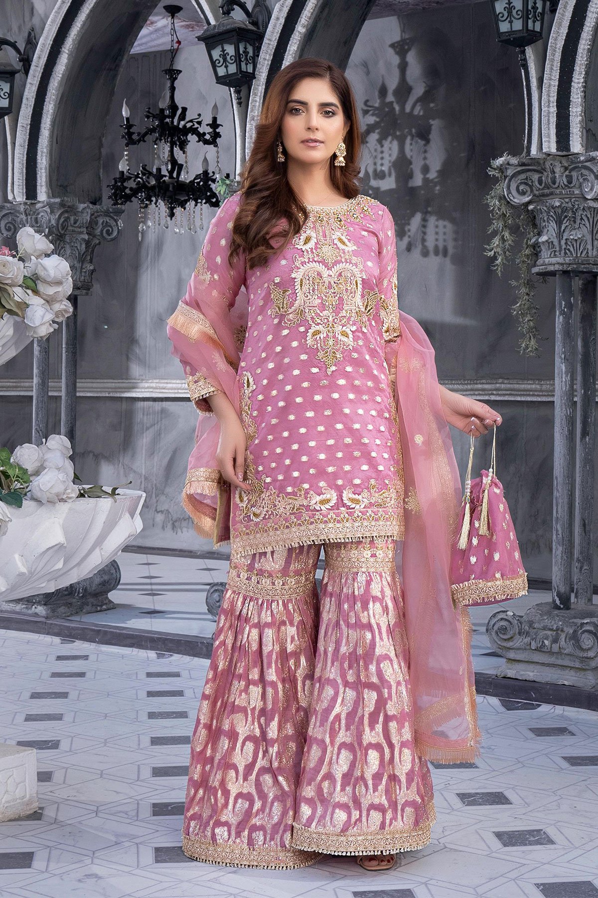 This beautiful organza 3 piece suit features a straight shirt with contrasted foil along with thread work embroidery throughout, finished with bead embroidered neckline and full length embroidered sleeves, It comes with a printed gharara and the look is finished with an organza dupatta.
