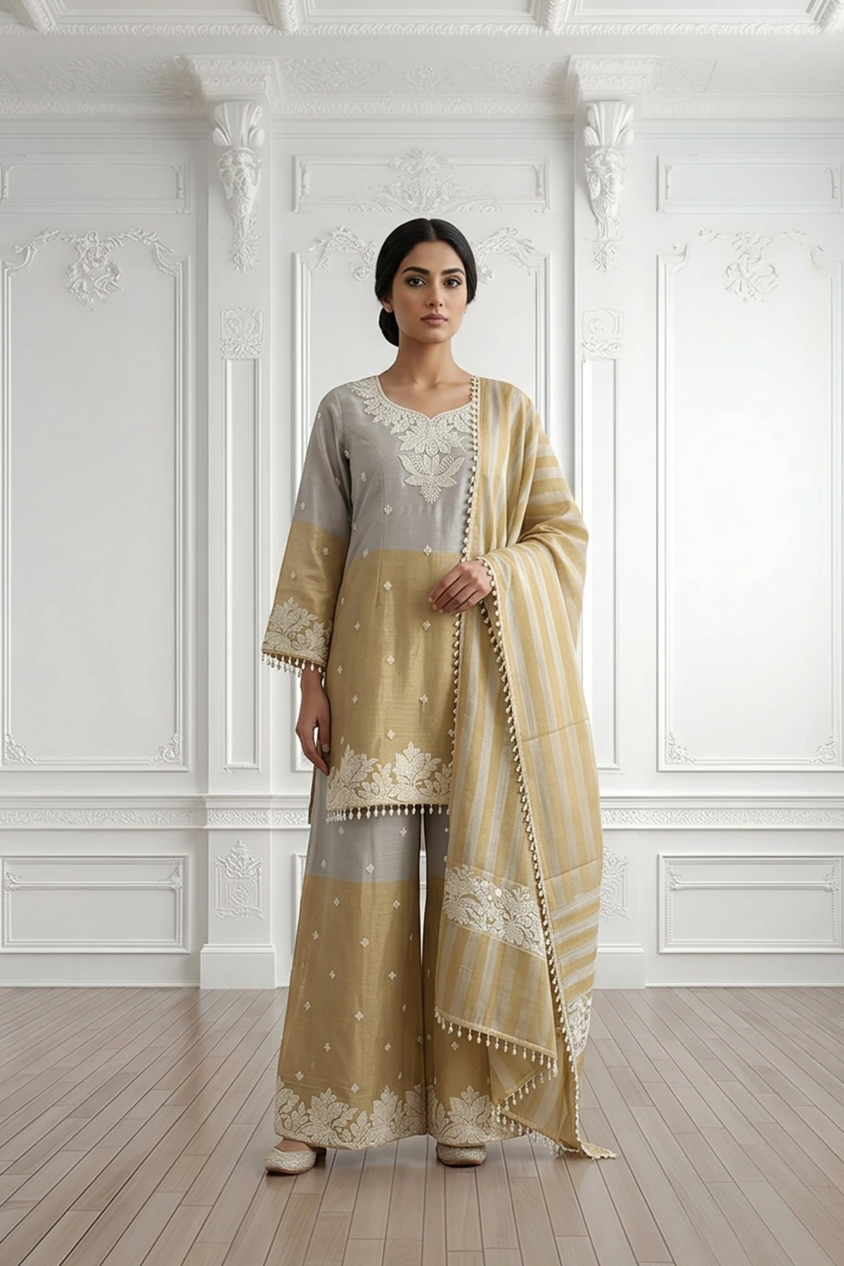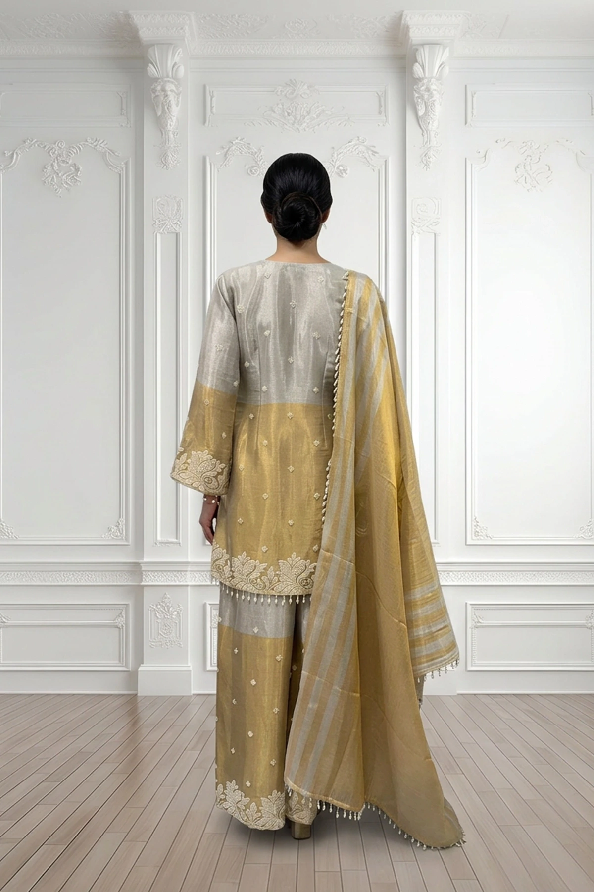This beautiful 3 piece soft raw silk suit features a straight shirt with luxury handwork pearl embroidered neckline with a pearl embroidered border with dangling tassels. It comes with full length sleeves and its paired with a raw silk pearl embroidered sharara and the look is finished with a raw silk dupatta.