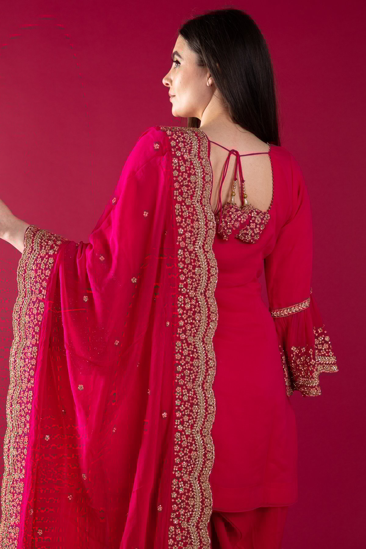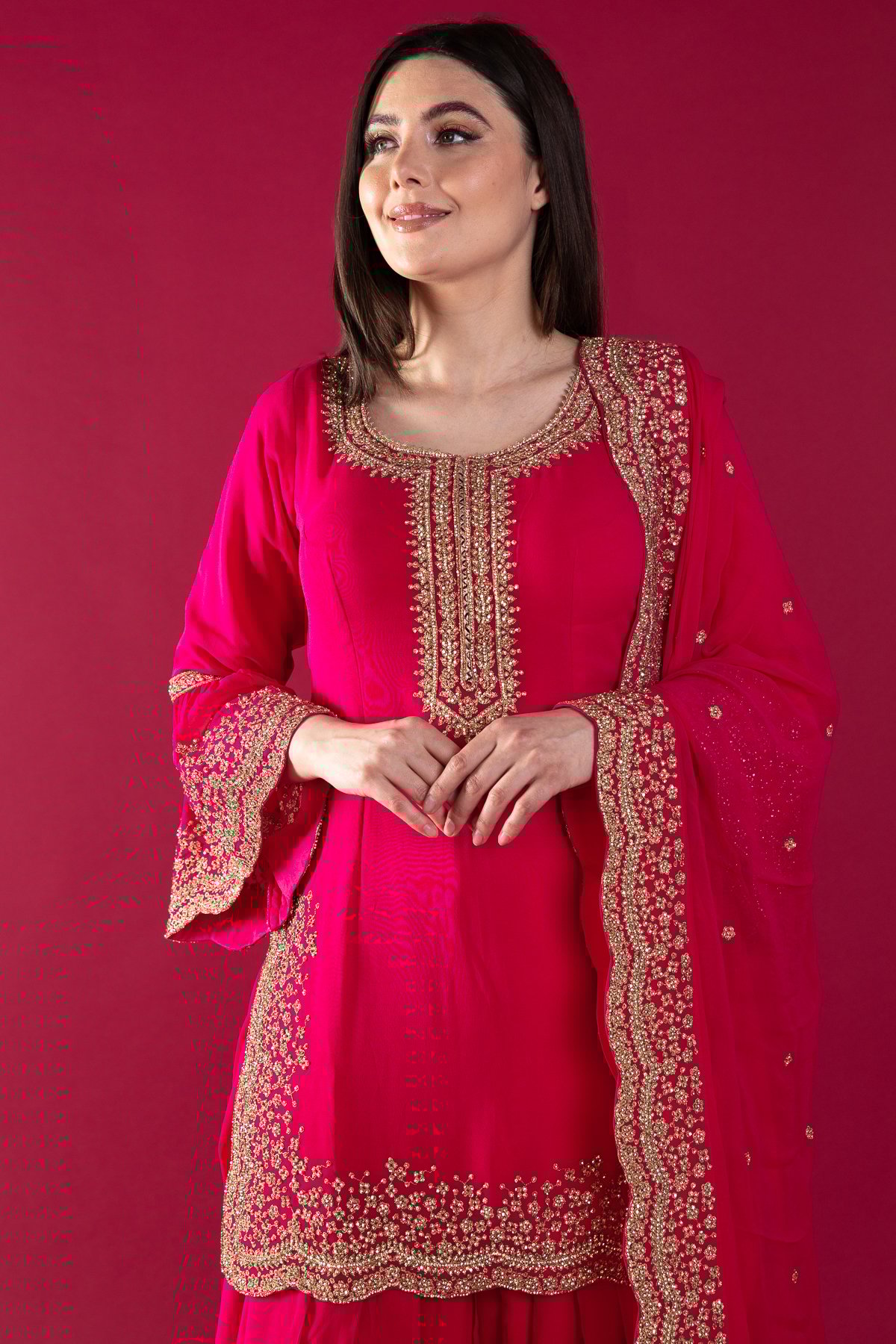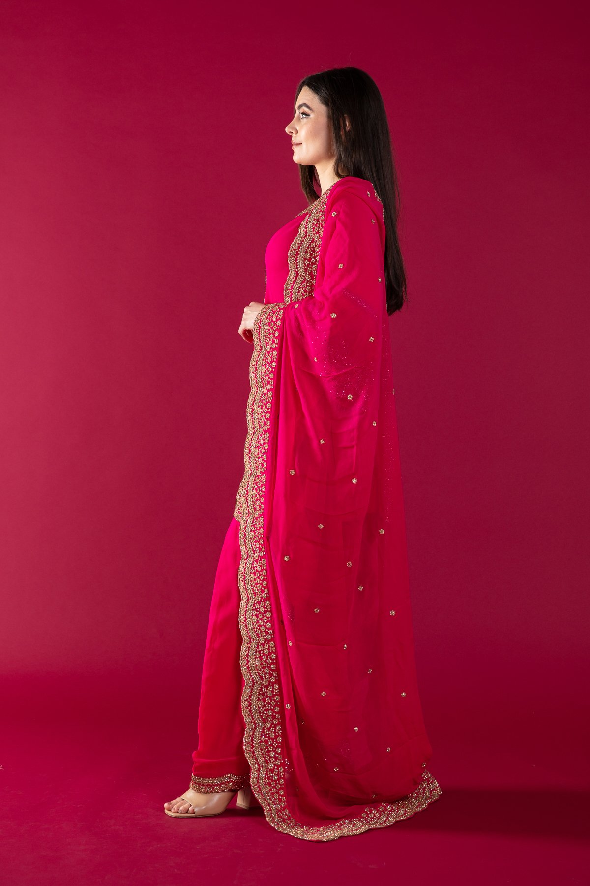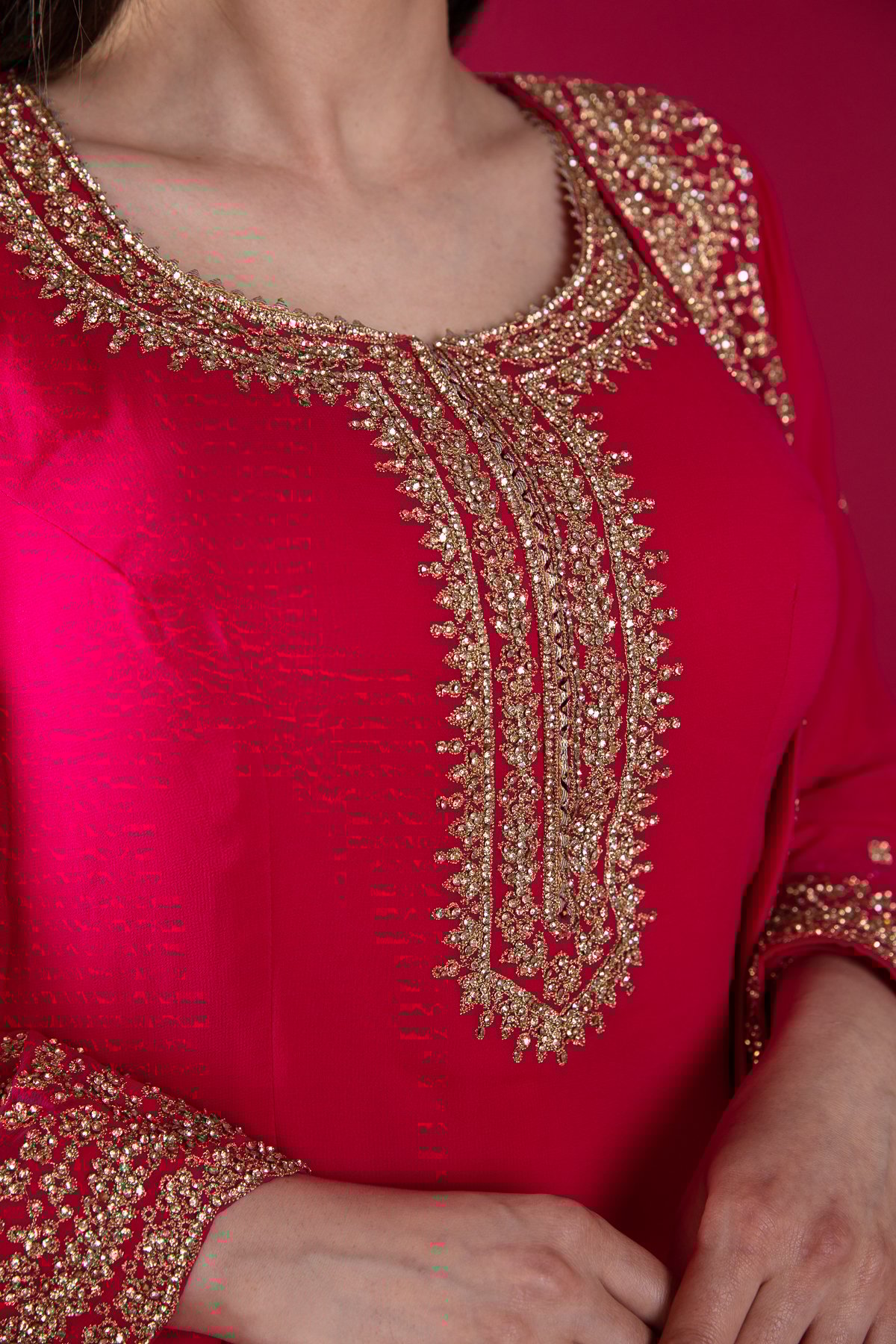 This beautiful 3 piece chiffon suit features a straight shirt with luxury thread work embroidery throughout the neckline and border. It comes with full length sleeves with bell style embroidered cuffs. The look is finished with a chiffon shalwar and a chiffon embroidered dupatta.
