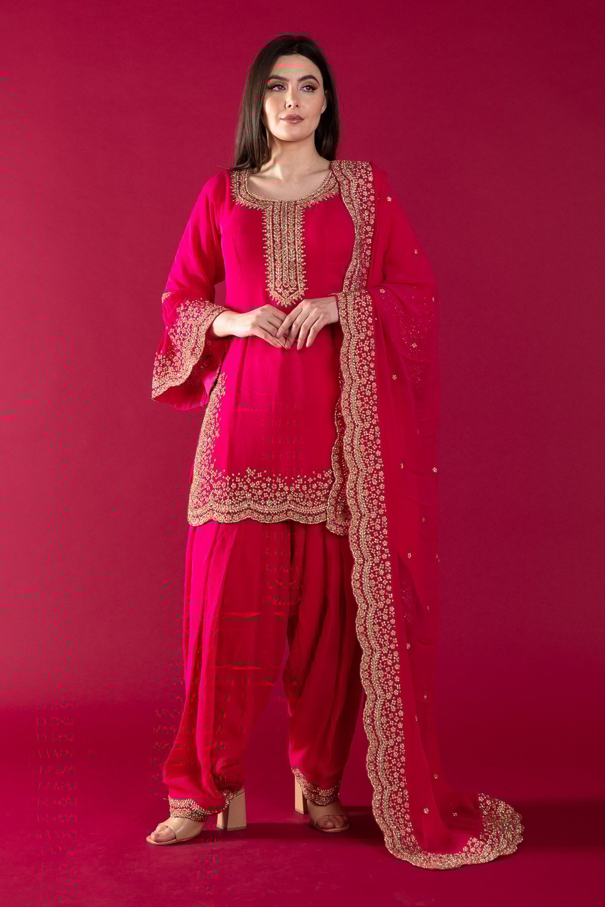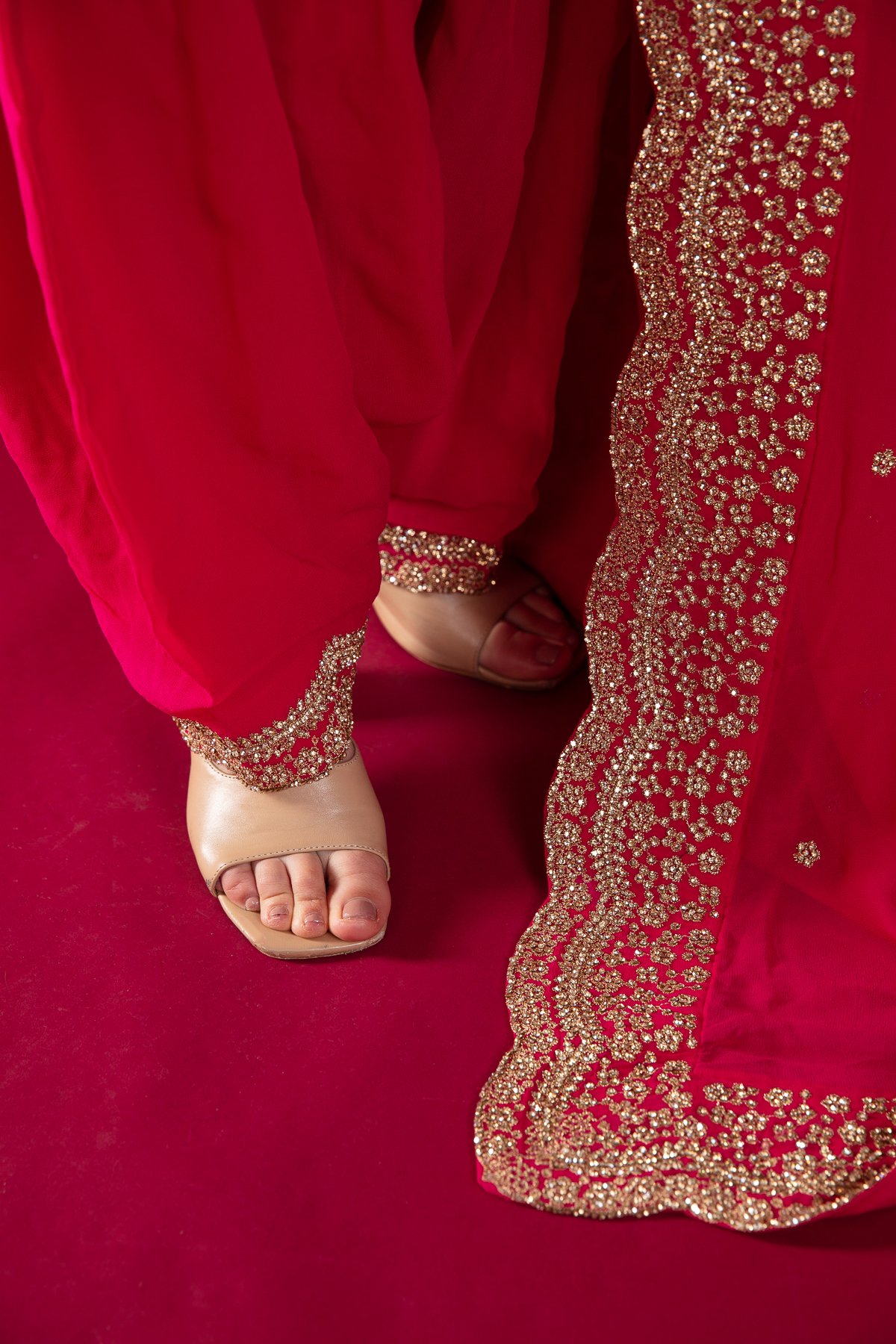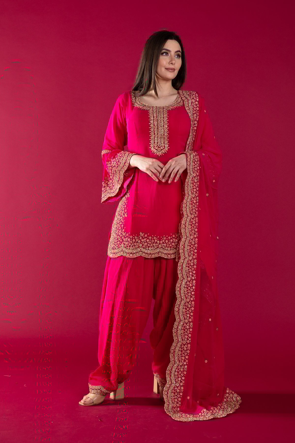 This beautiful 3 piece chiffon suit features a straight shirt with luxury thread work embroidery throughout the neckline and border. It comes with full length sleeves with bell style embroidered cuffs. The look is finished with a chiffon shalwar and a chiffon embroidered dupatta.