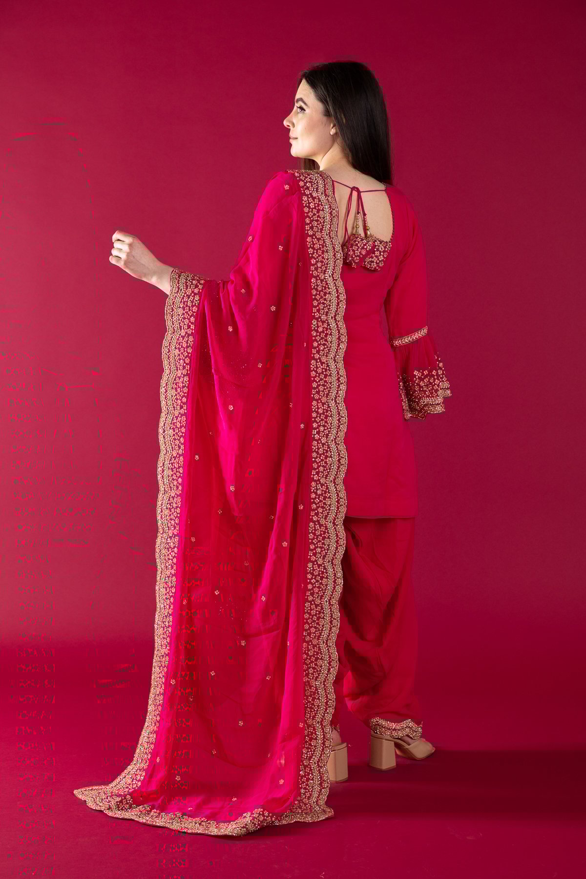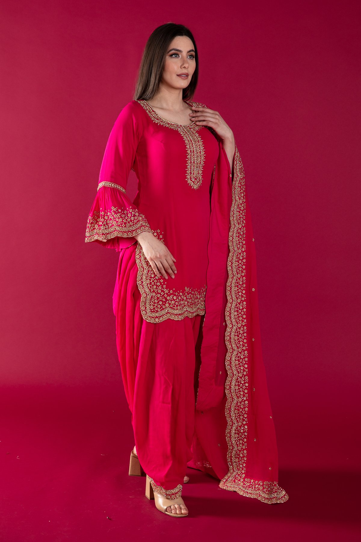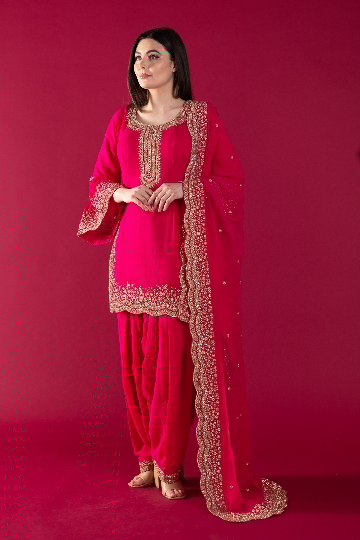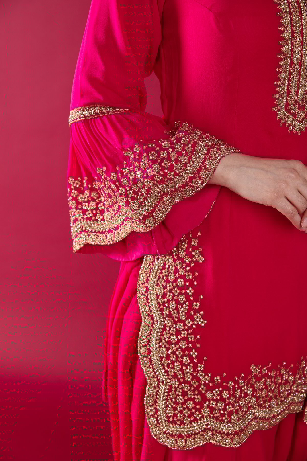This beautiful 3 piece chiffon suit features a straight shirt with luxury thread work embroidery throughout the neckline and border. It comes with full length sleeves with bell style embroidered cuffs. The look is finished with a chiffon shalwar and a chiffon embroidered dupatta.