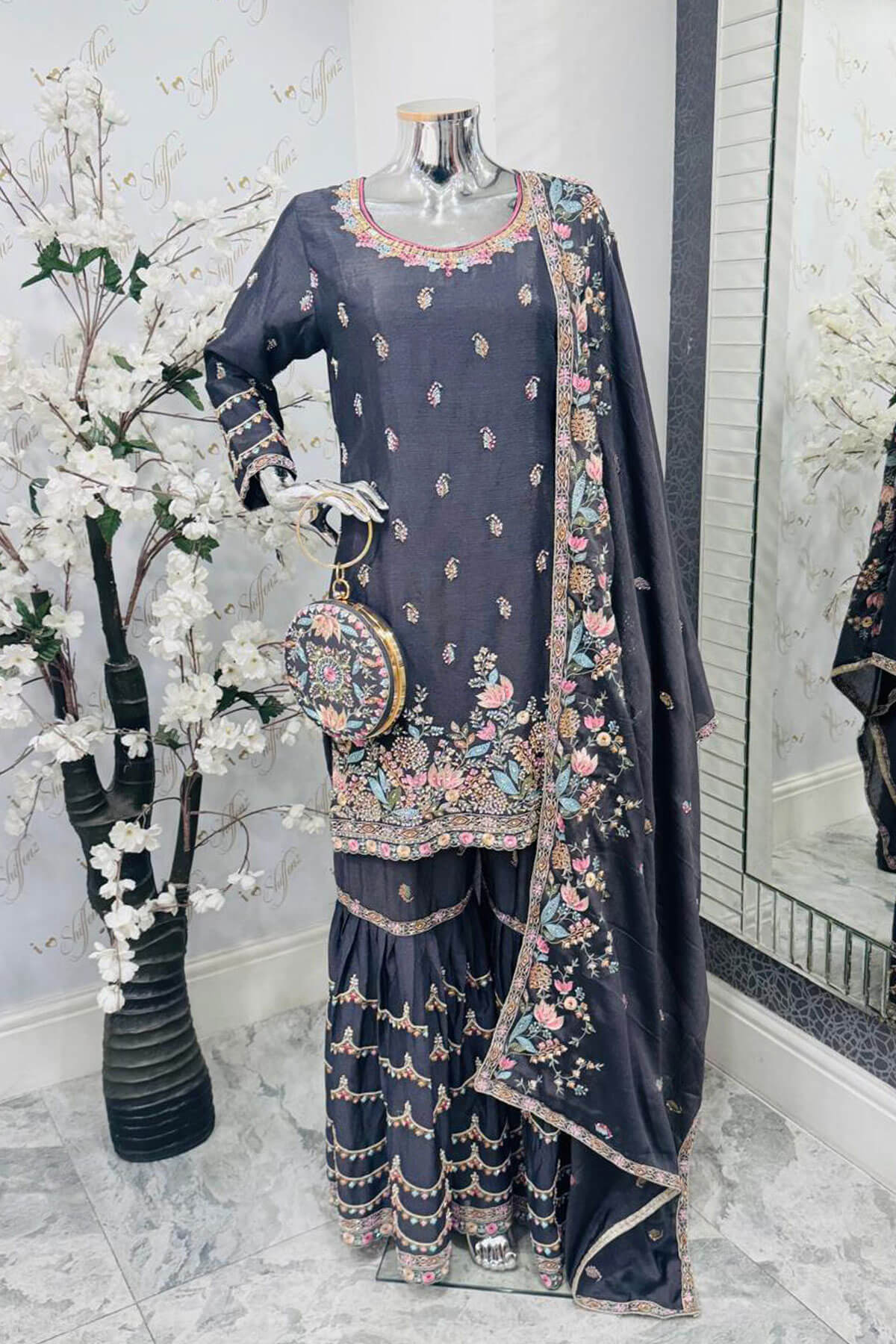 Shiffonz 3 piece thread work embroidered suit with bag