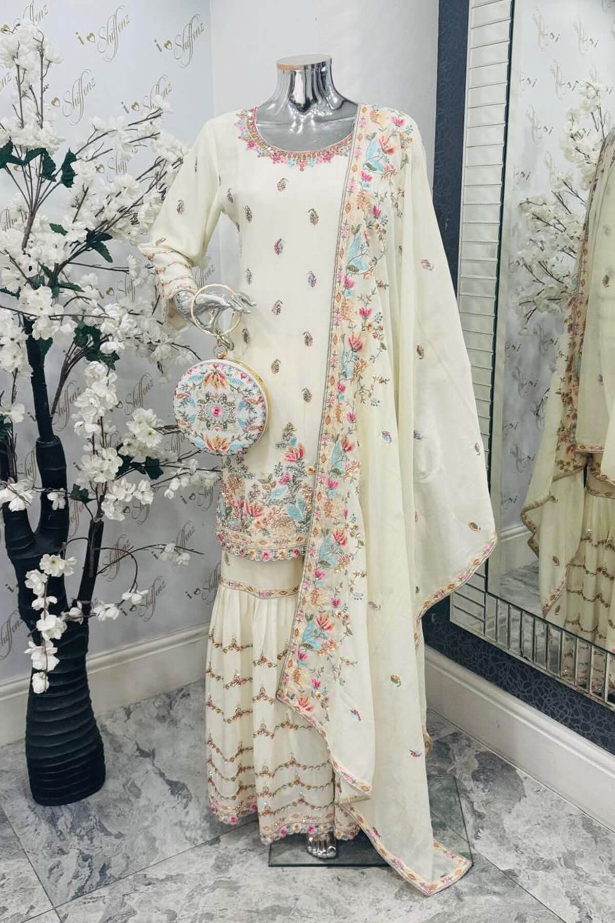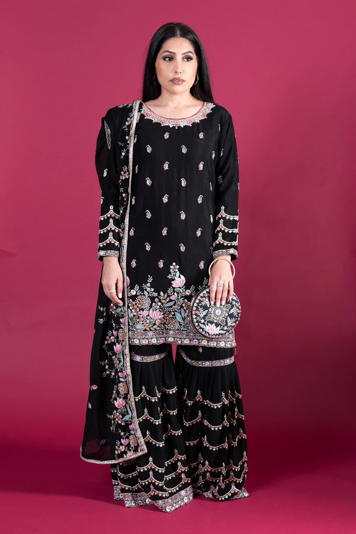 This beautiful 3 piece georgette suit features a straight shirt with luxury threadwork embroidery throughout with silver diamante embroidery. Paired with a georgette gharara and the look is finished with a luxury embroidered georgette dupatta. An embroidered clutch is also included to enhance the suit.