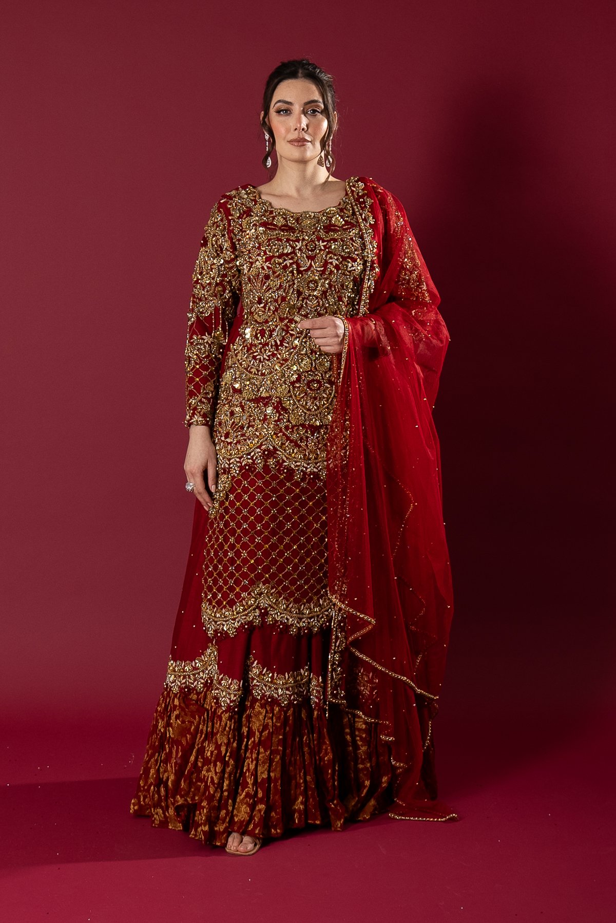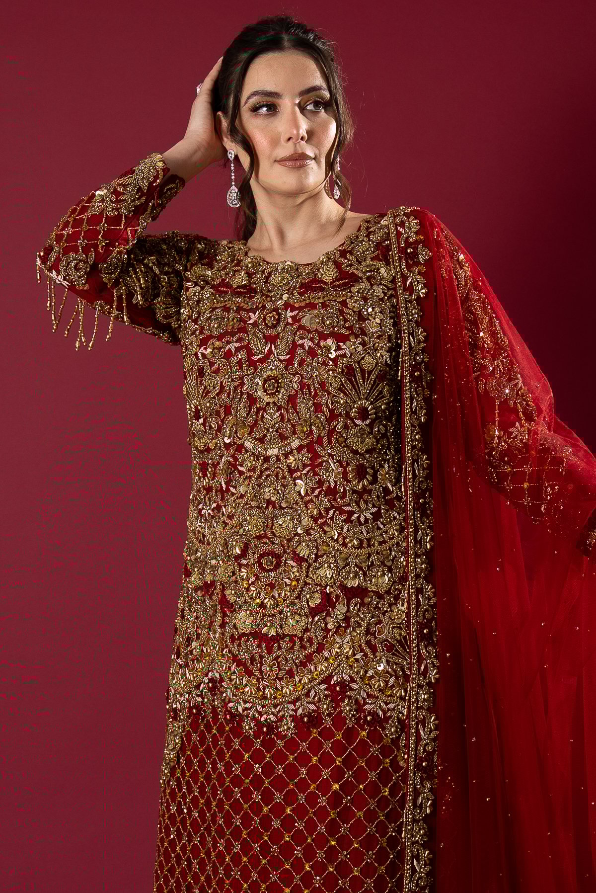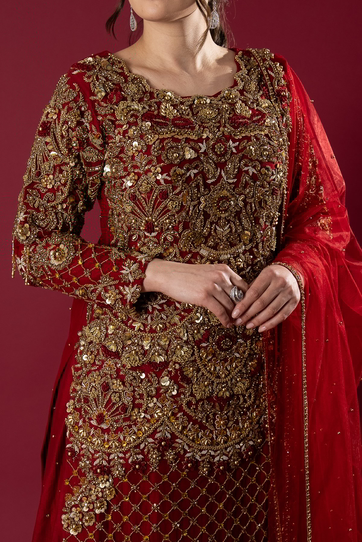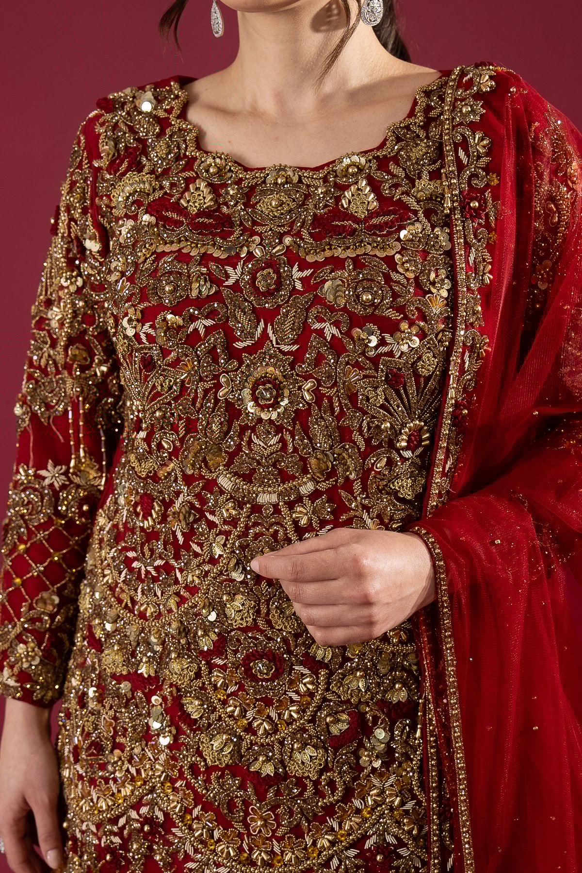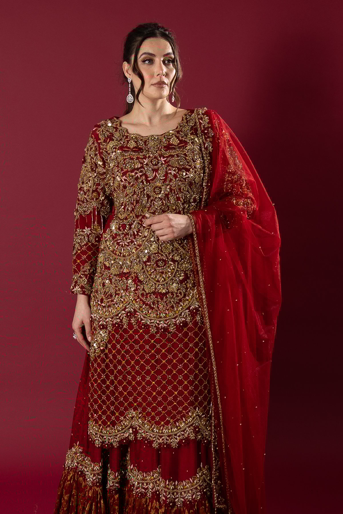 This beautiful 3 piece lengha suit features a straight shirt with luxury beaded embroidery throughout with full length heavy embroidered sleeves. It comes with an embroidered lengha with a brocade border and the look is finished a net embroidered dupatta. Note: We can customize this suit on made on measure orders. Please visit our branch for further consultation.