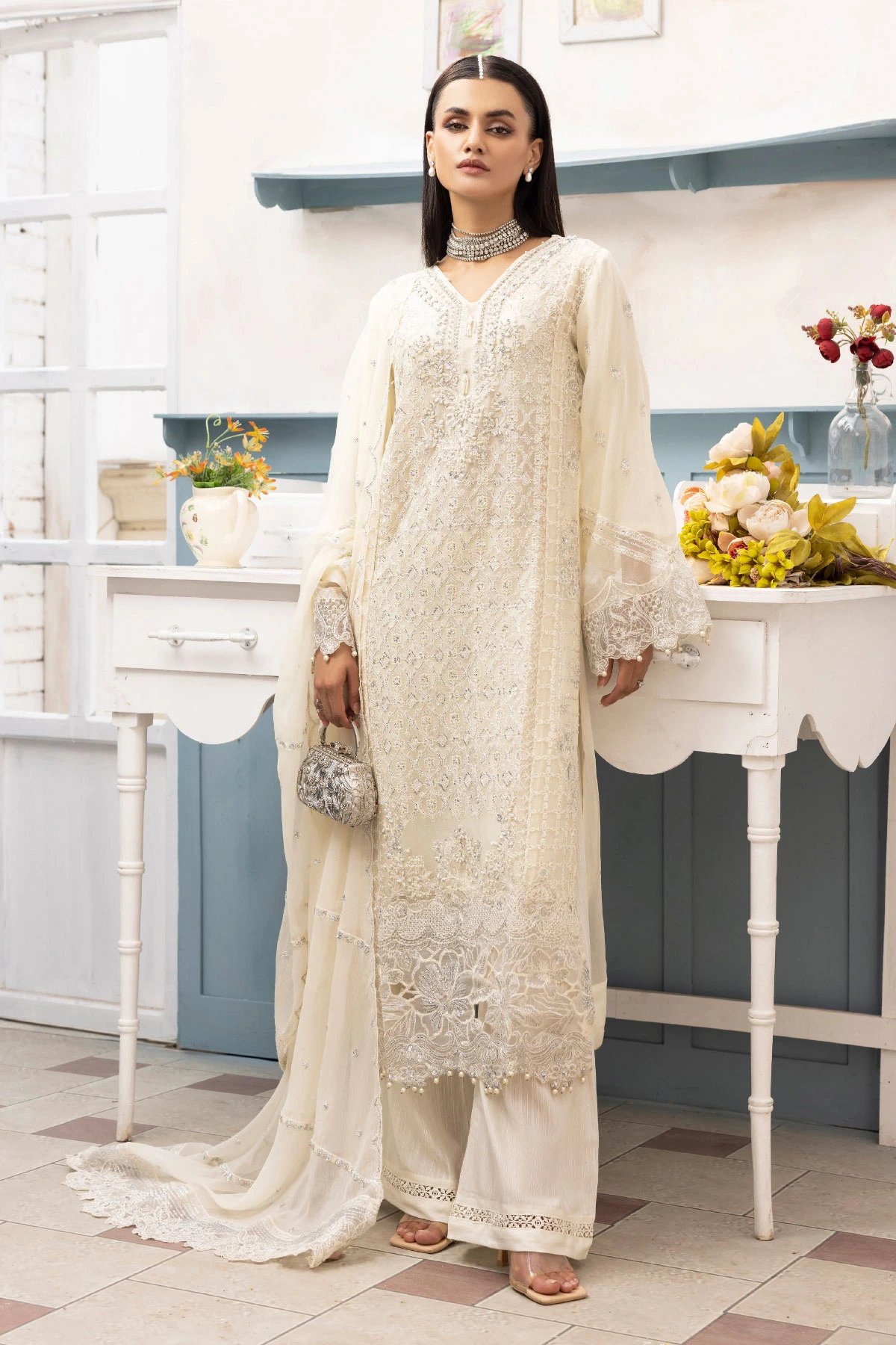 This beautiful 3 piece chiffon suit features a straight shirt with luxury thread work embroidery throughout and bead and tassel embellishments along the front, finished with dangling beads on the border with cut work embroidery. It comes with full length embroidered sleeves. Paired with straight leg trousers and the look is finished with a chiffon  embroidered dupatta. Perfect festive collection for this wedding season.