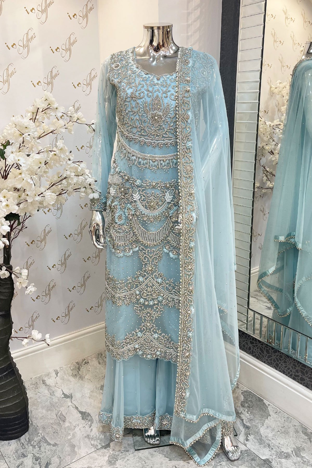This beautiful 3 piece net suit features a straight shirt with luxury beaded embroidery throughout the front with scattered diamante’s. It comes with full length see throughout net sleeves with silver scattered diamante’s throughout finished with an embroidered border on the cuffs. It comes with a net sharara finished with an embroidered border and the look is finished with a net embroidered dupatta.